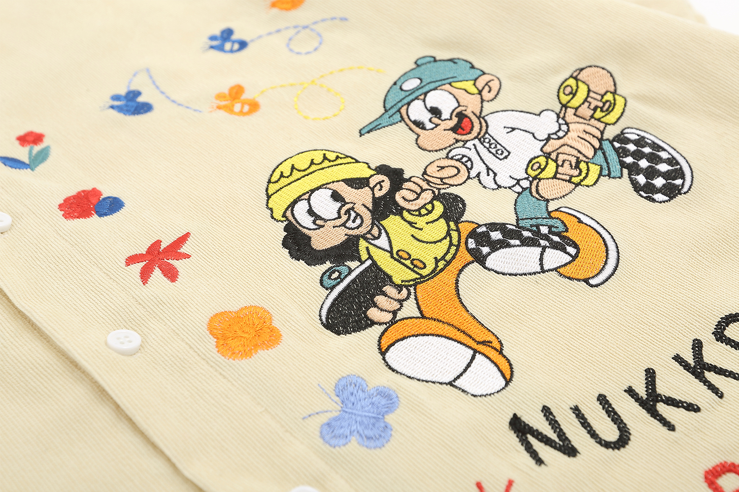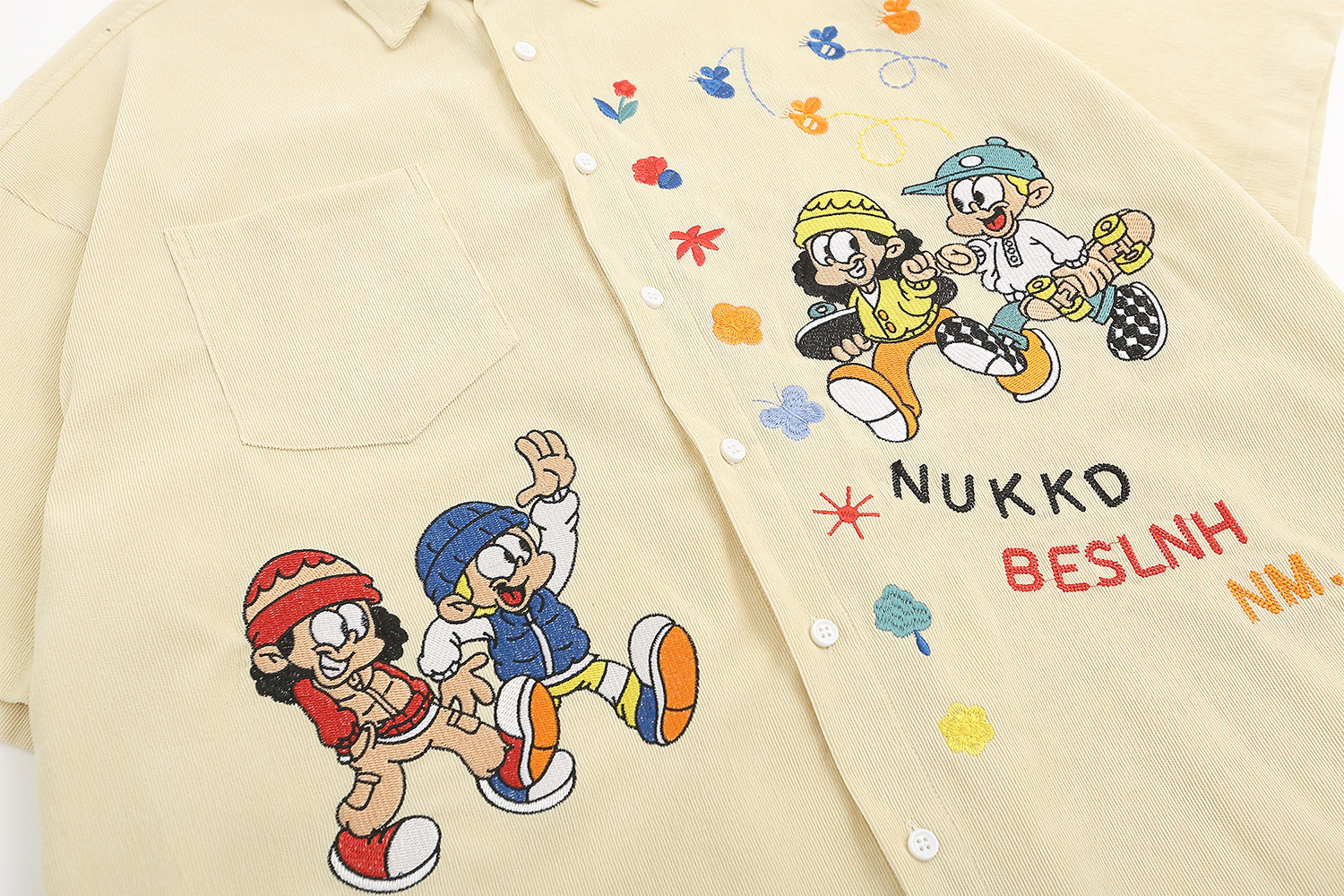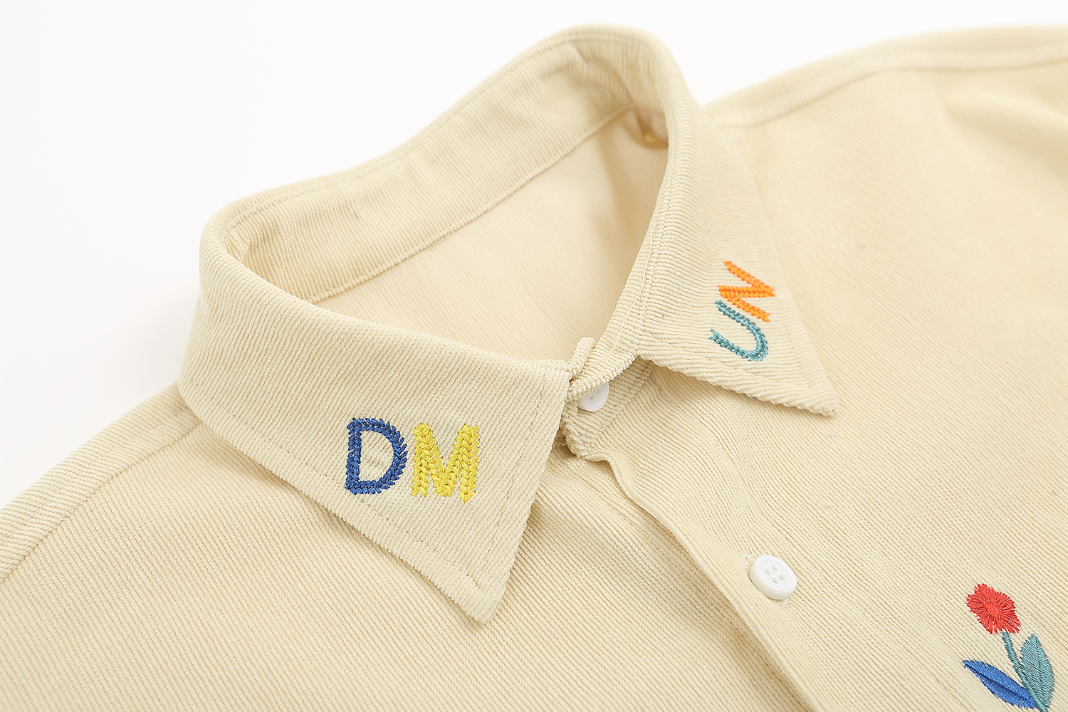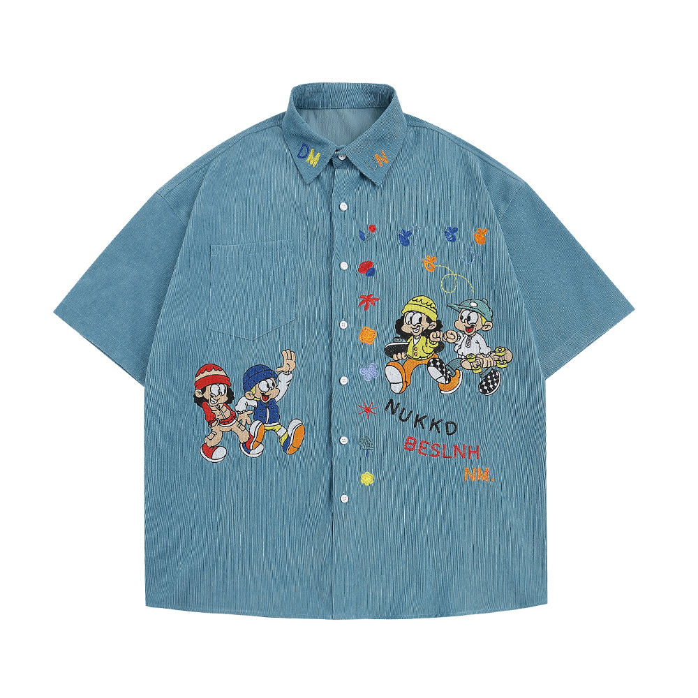 WESVGM夏季美式復古趣味卡通刺繡燈芯絨短袖襯衫男女寬鬆潮牌上衣