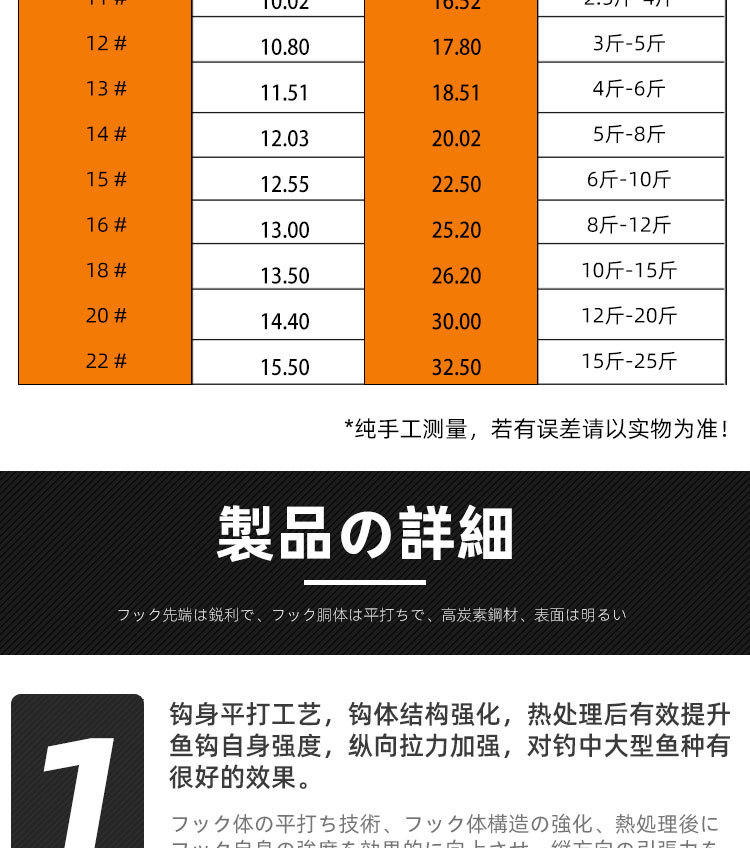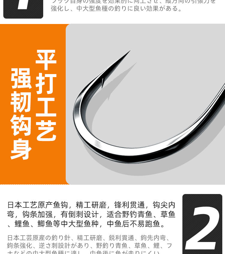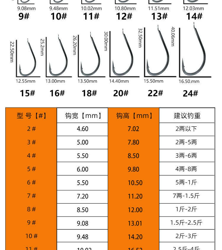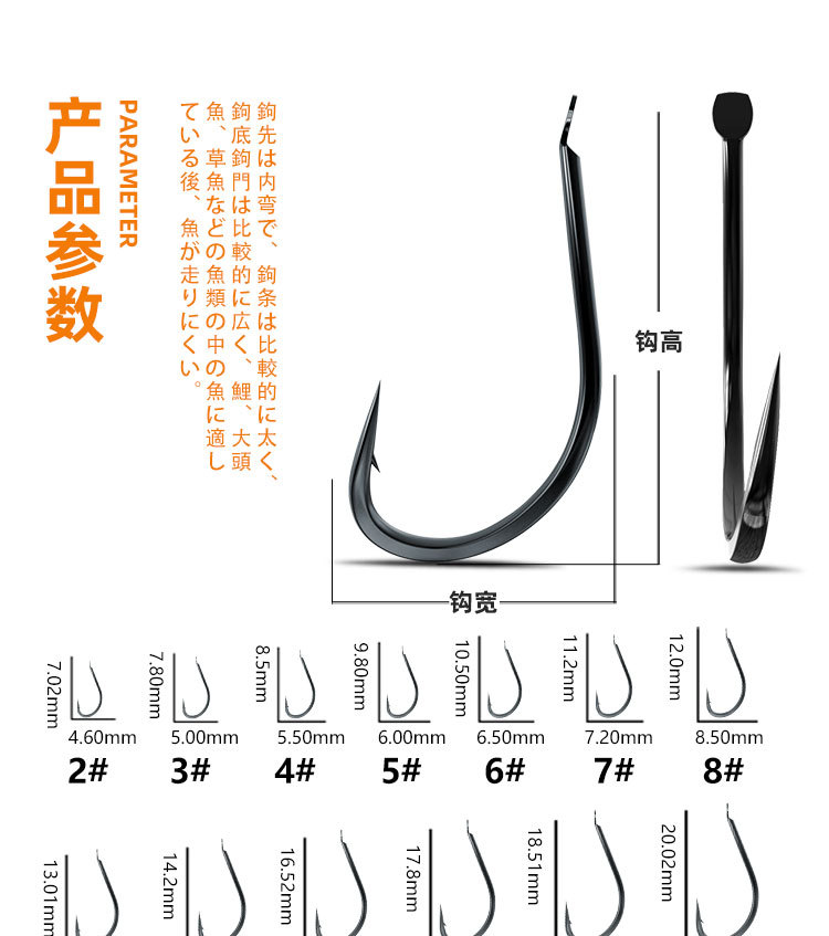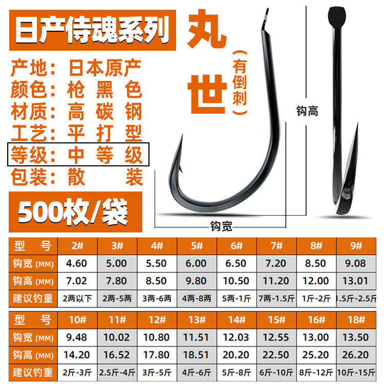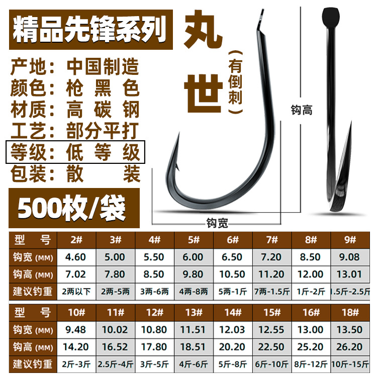 说明:散装鱼钩500枚/包为最小包装,单个型号请以500枚的倍数下单,否则无法发货,介意者慎拍,造成不便,敬请谅解!