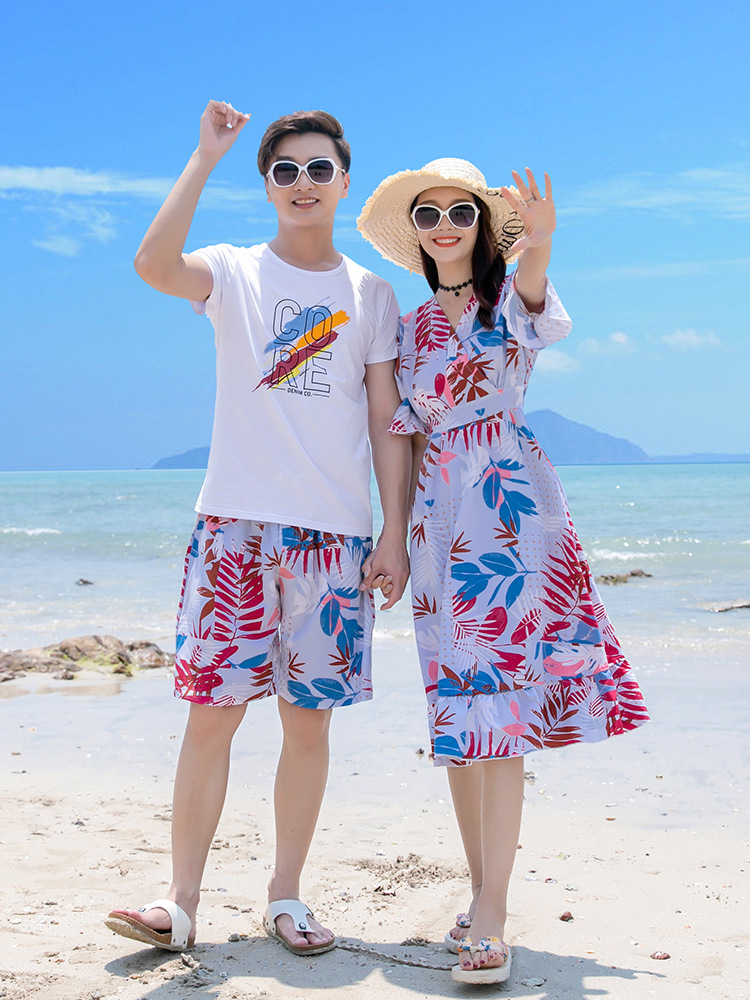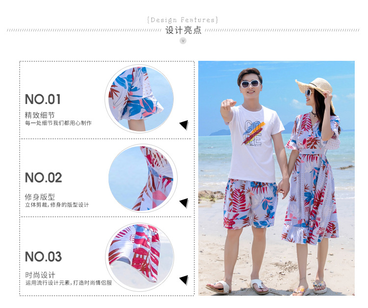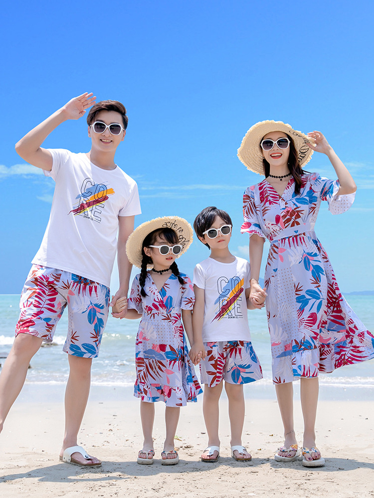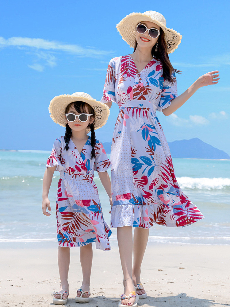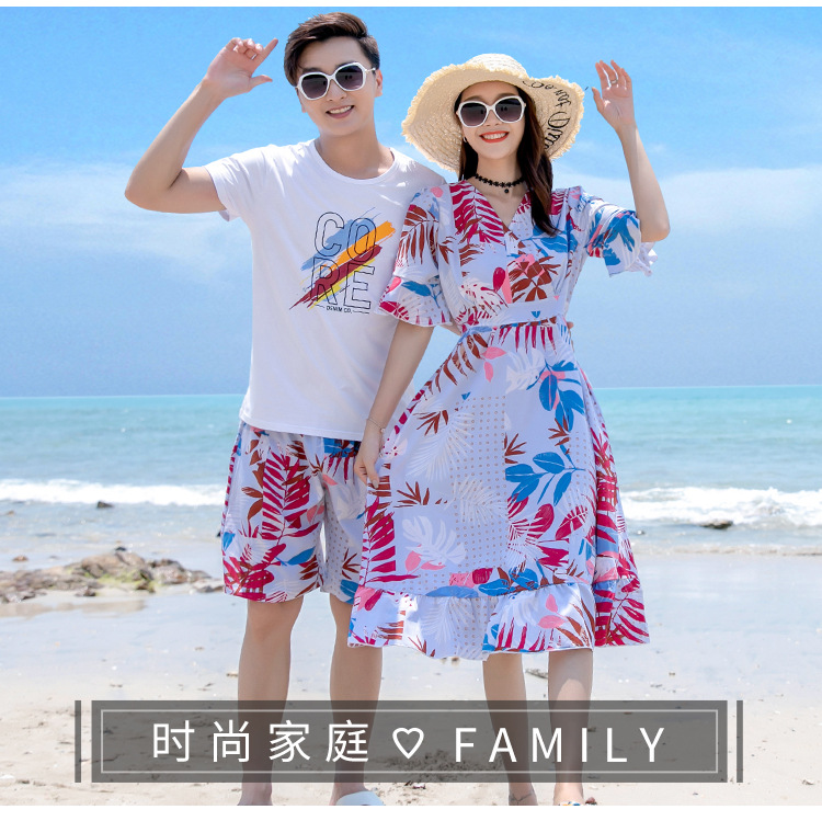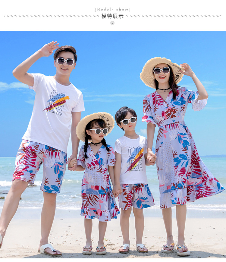 沙滩亲子装夏旅游度假一家三口家庭装喇叭袖V领中长款连衣裙情侣