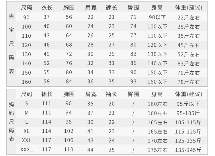 适合身高 男宝套装90码,男宝套装100码,男宝套装110码,男宝套装120码,男宝套装130码,男宝套装140码,男宝套装150码,男宝套装160码,女宝裙子90码,女宝裙子100码,女宝裙子110码,女宝裙子120码,女宝裙子130码,女宝裙子140码,女宝裙子150码,女宝裙子160码,妈妈裙子S码,妈妈裙子M码,妈妈裙子L码,妈妈裙子XL码,妈妈裙子2XL码,妈妈裙子3XL码,爸爸套装M码,爸爸套装L码,爸爸套装XL码,爸爸套装2XL码,爸爸套装3XL码,爸爸套装4XL码