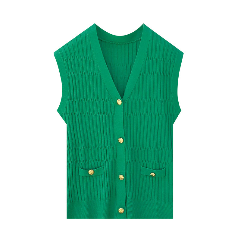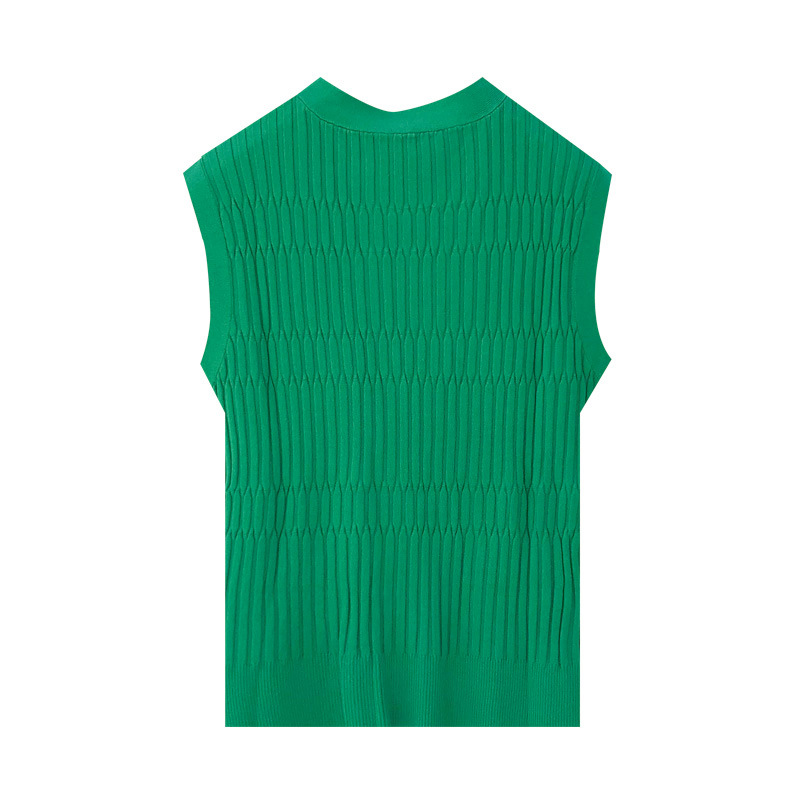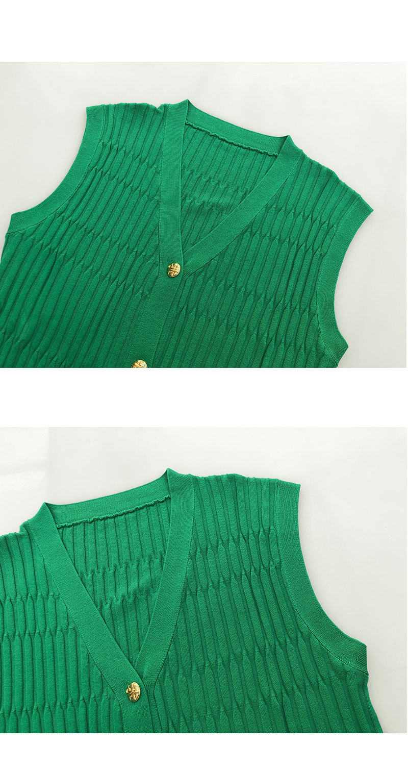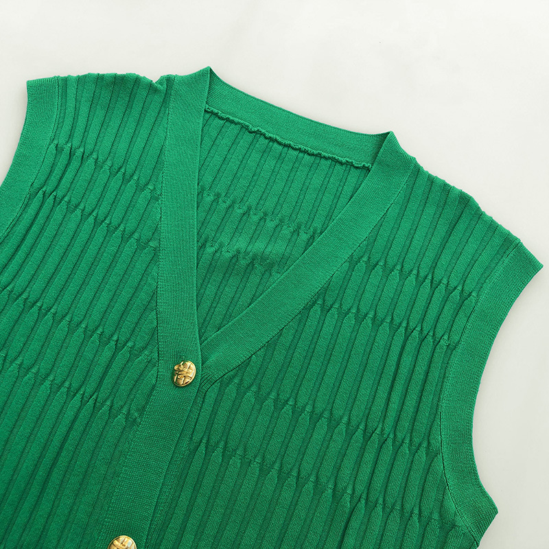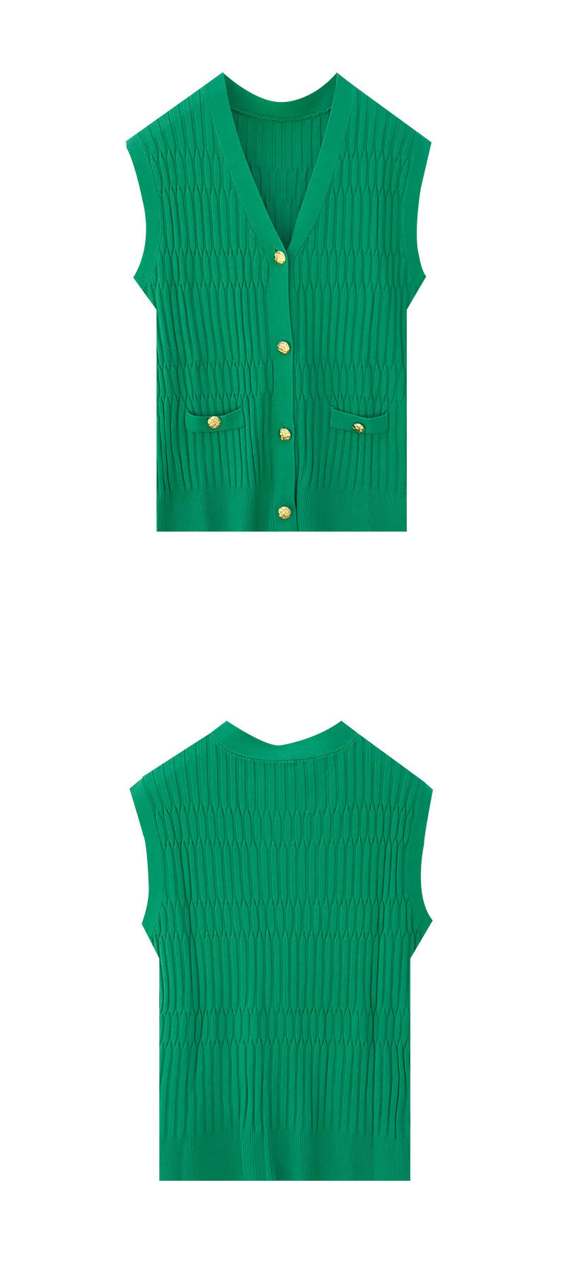 绿色 V领小香风修身无袖错落肌理金扣针织背心马甲女 MBB2SWT009