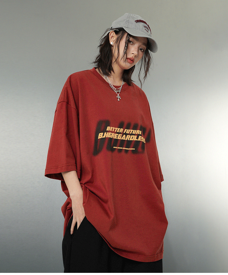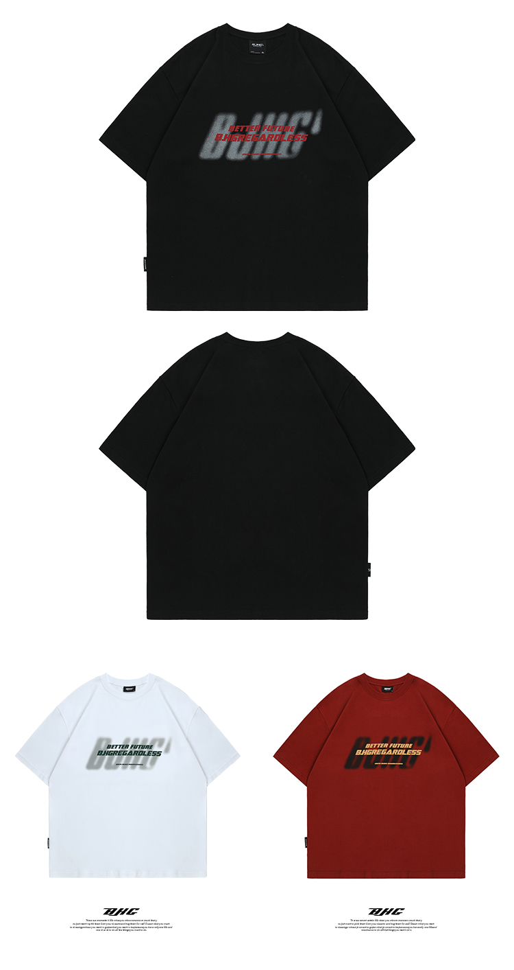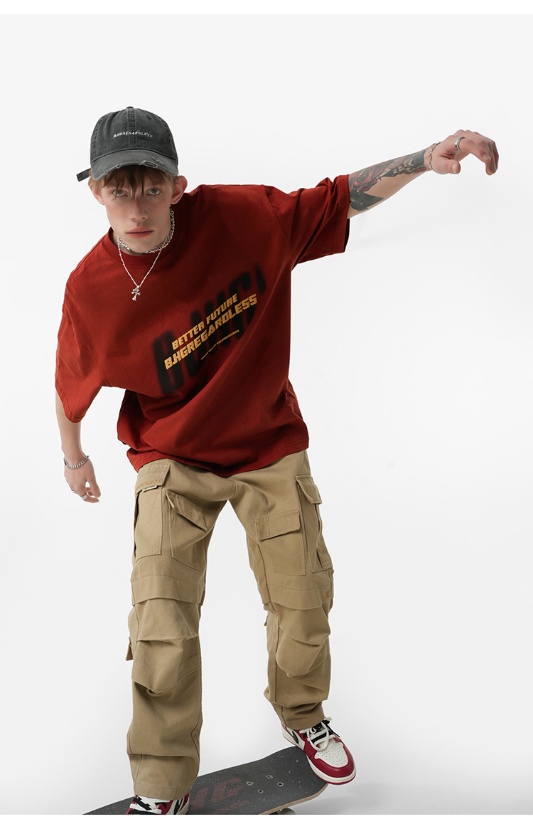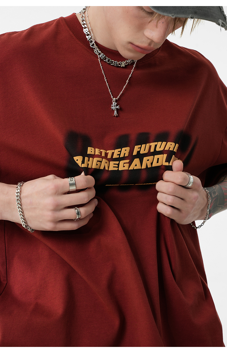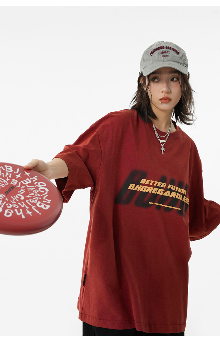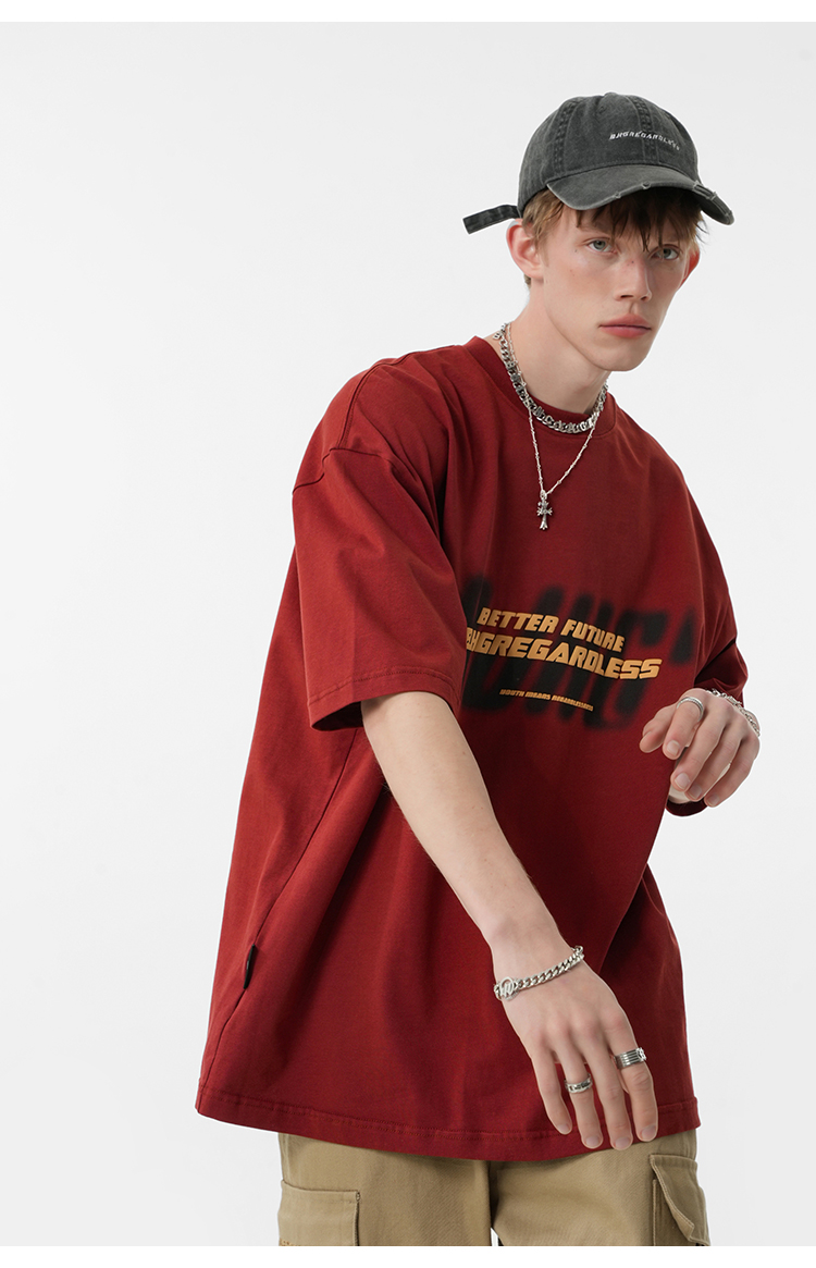BJHG不計後果 夏美式高街T恤男潮重磅復古酒紅色短袖寬鬆純棉半袖