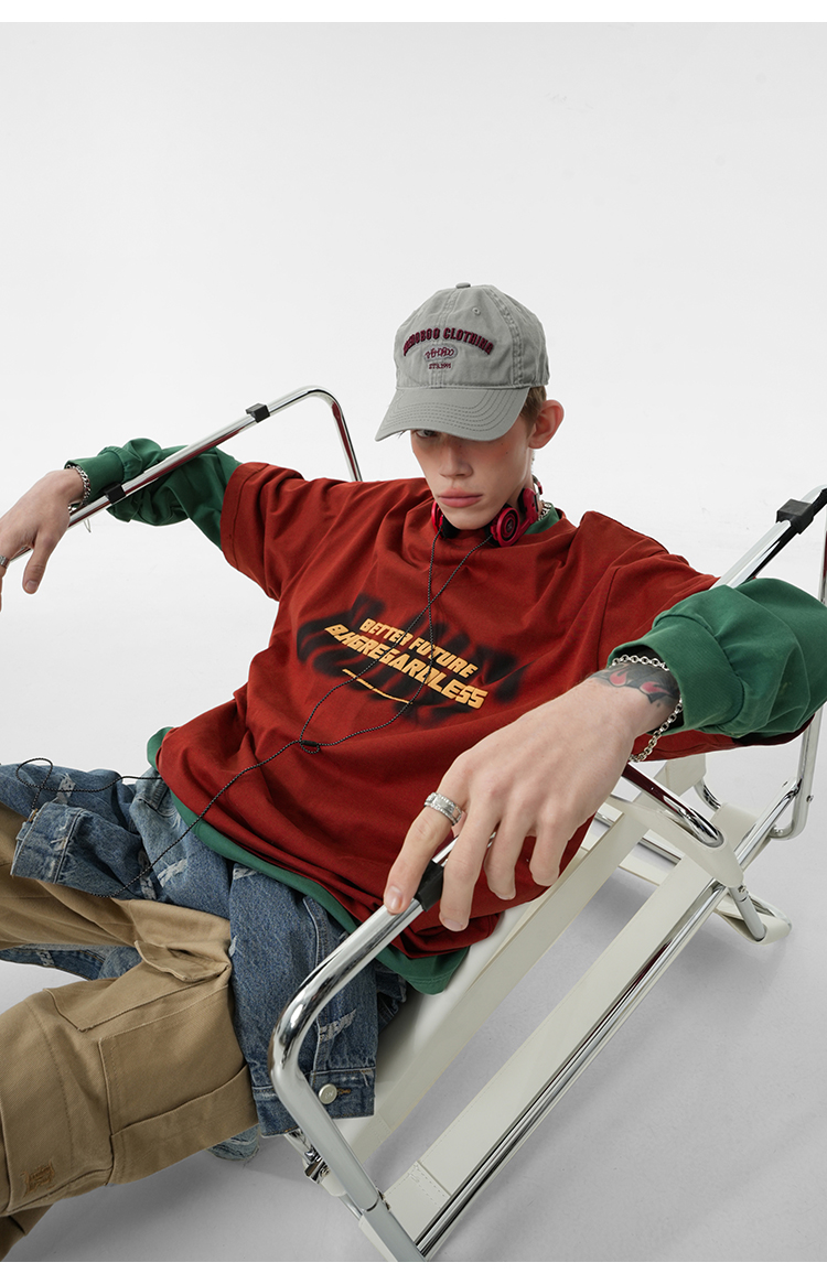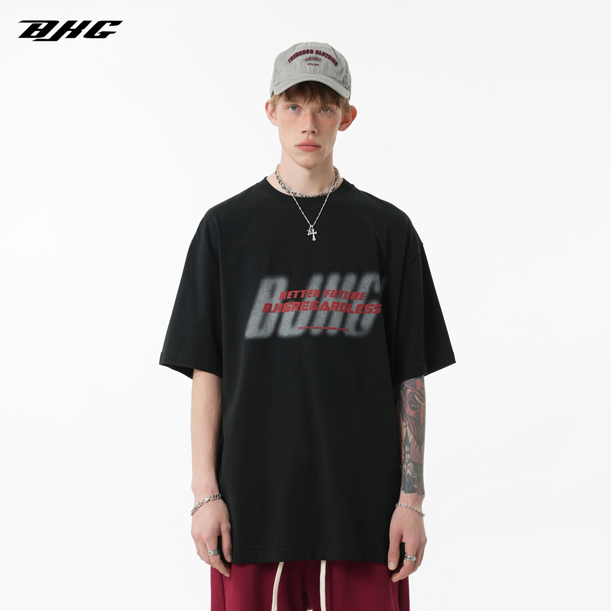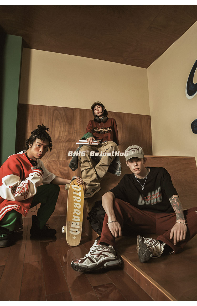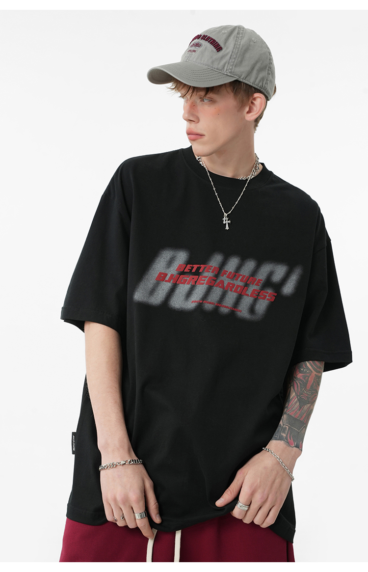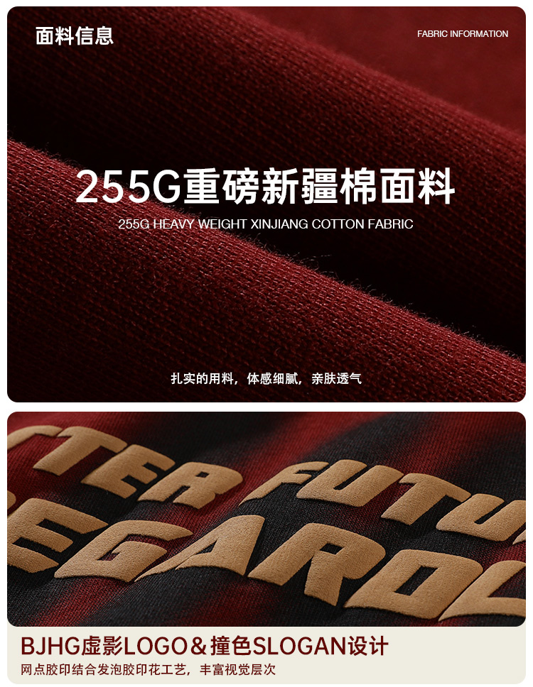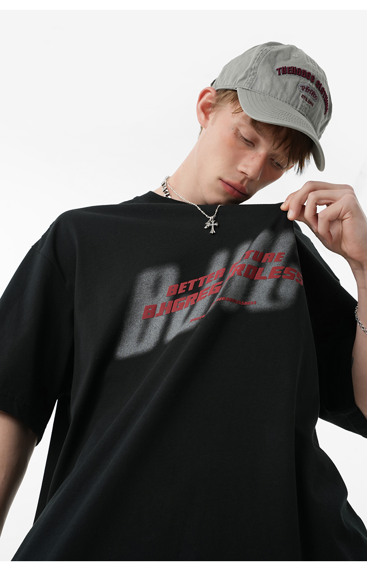 BJHG不計後果 夏美式高街T恤男潮重磅復古酒紅色短袖寬鬆純棉半袖
