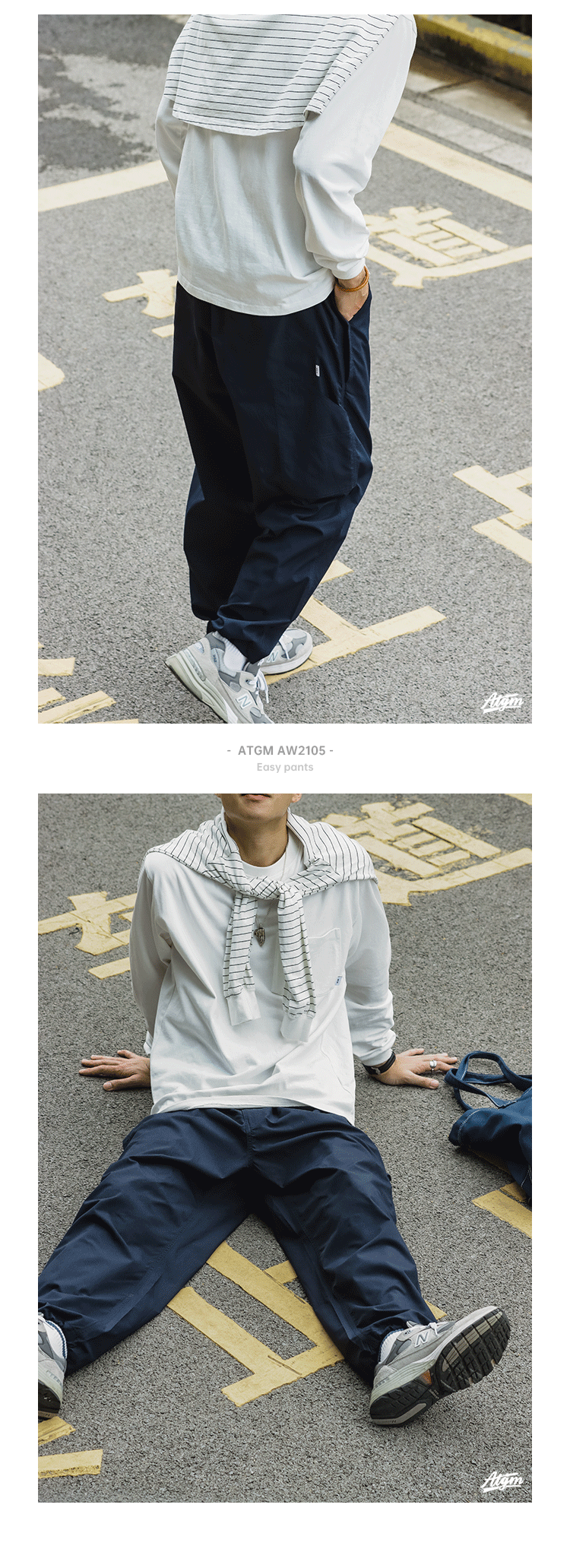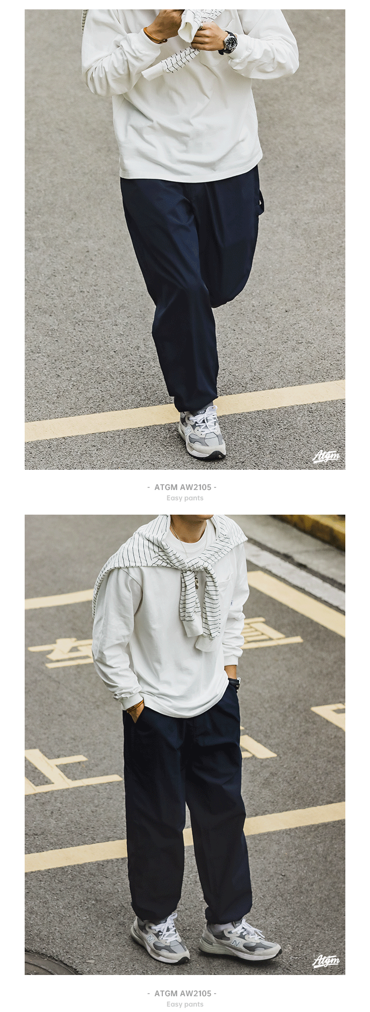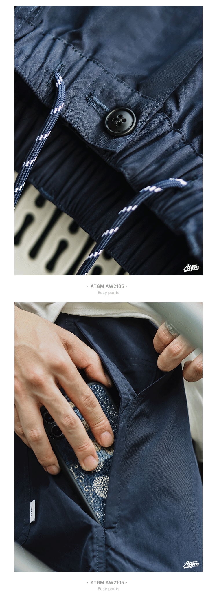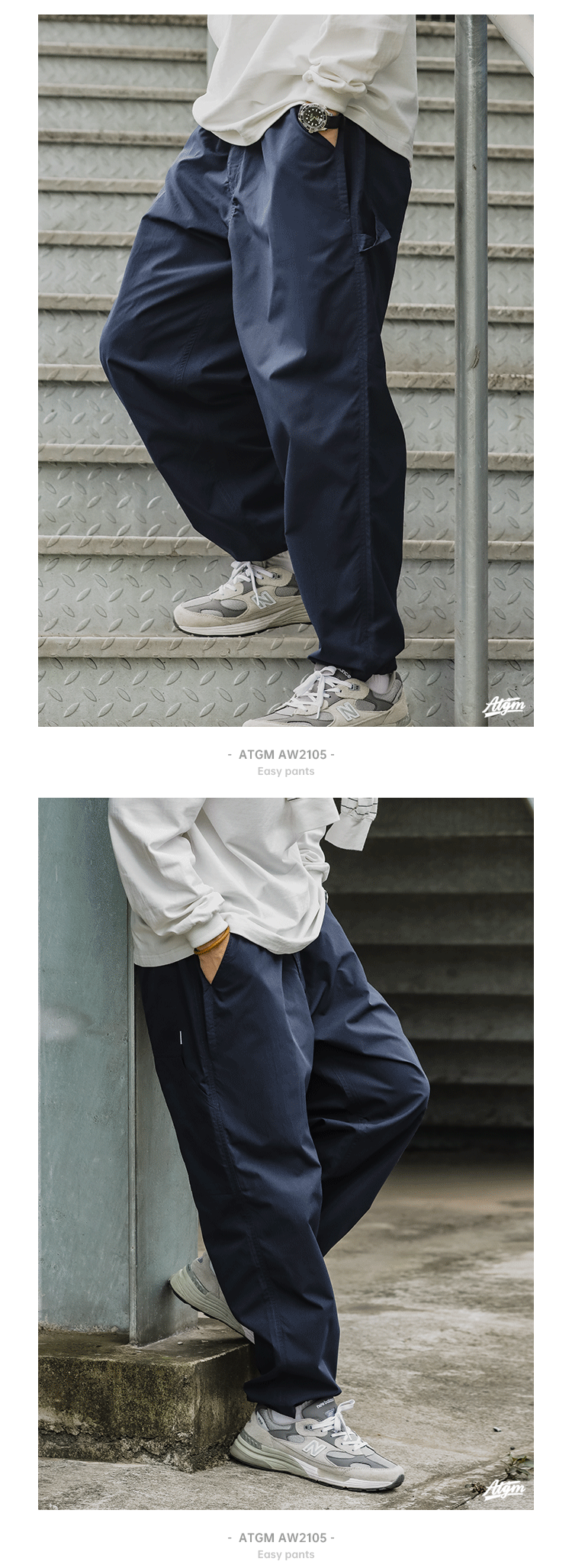 ATGM 日系休閒Cityboy風格純色錐形寬鬆微彈中腰藏青色工裝長褲男