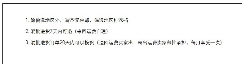 关于退换货:退货条件--产品本身的质量问题导致产品本身应有的功能缺失或达不到正常标准,在未经使用产品不影响二次销售情况下,可申请该产品换同等价值的产品。调货或退货应于收货签单之时起的24小时内申请,并于申请之时起24小时内寄回,时间以买家发货物流单/快递单扫描时间为准。其他如销量不好、没有想象中好...等非产品本身质量问题的原因,我们将不提供退换货哦。