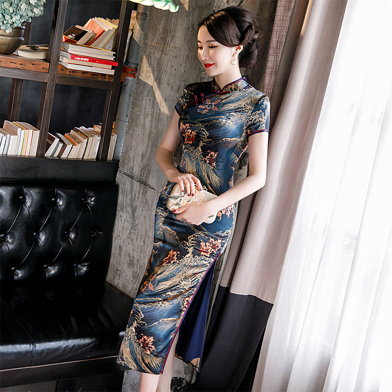 巧祺新品中式传统服饰桑蚕丝日常修身旗袍长款优雅真丝妈妈礼服女