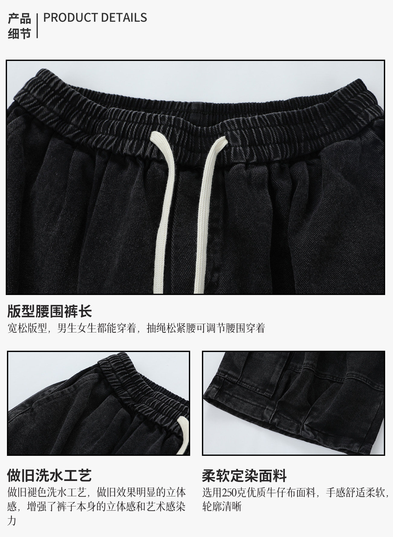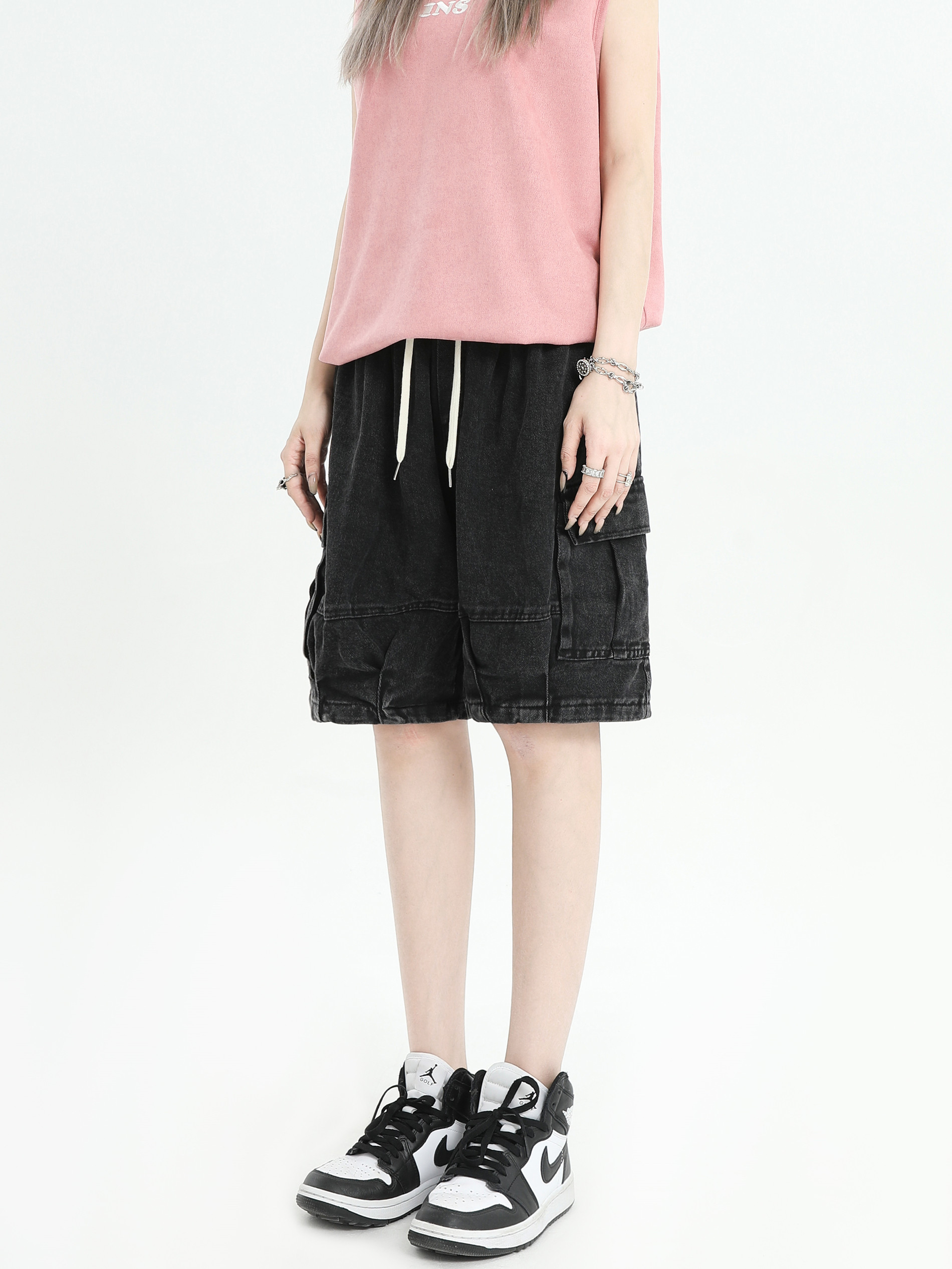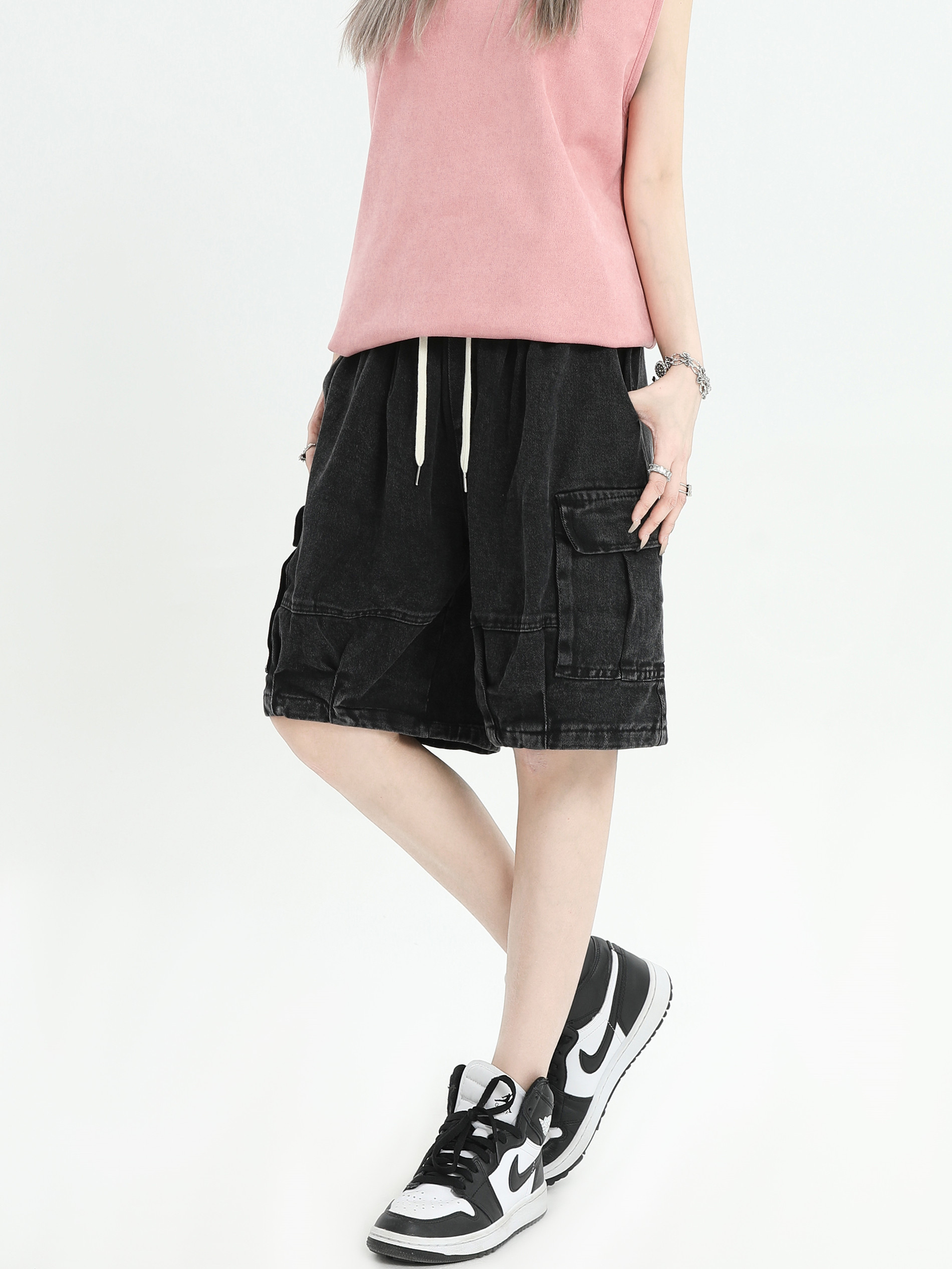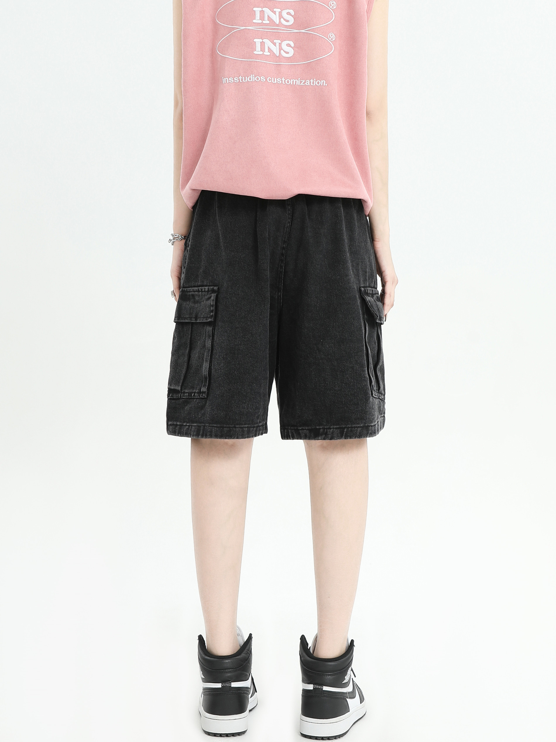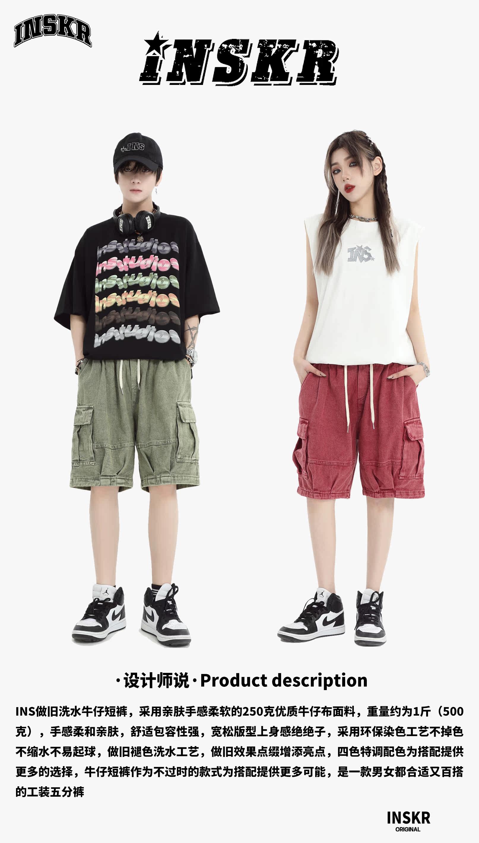 【INSKR】國潮牌情侶美式做舊洗水牛仔短褲寬鬆貼袋工裝五分褲男