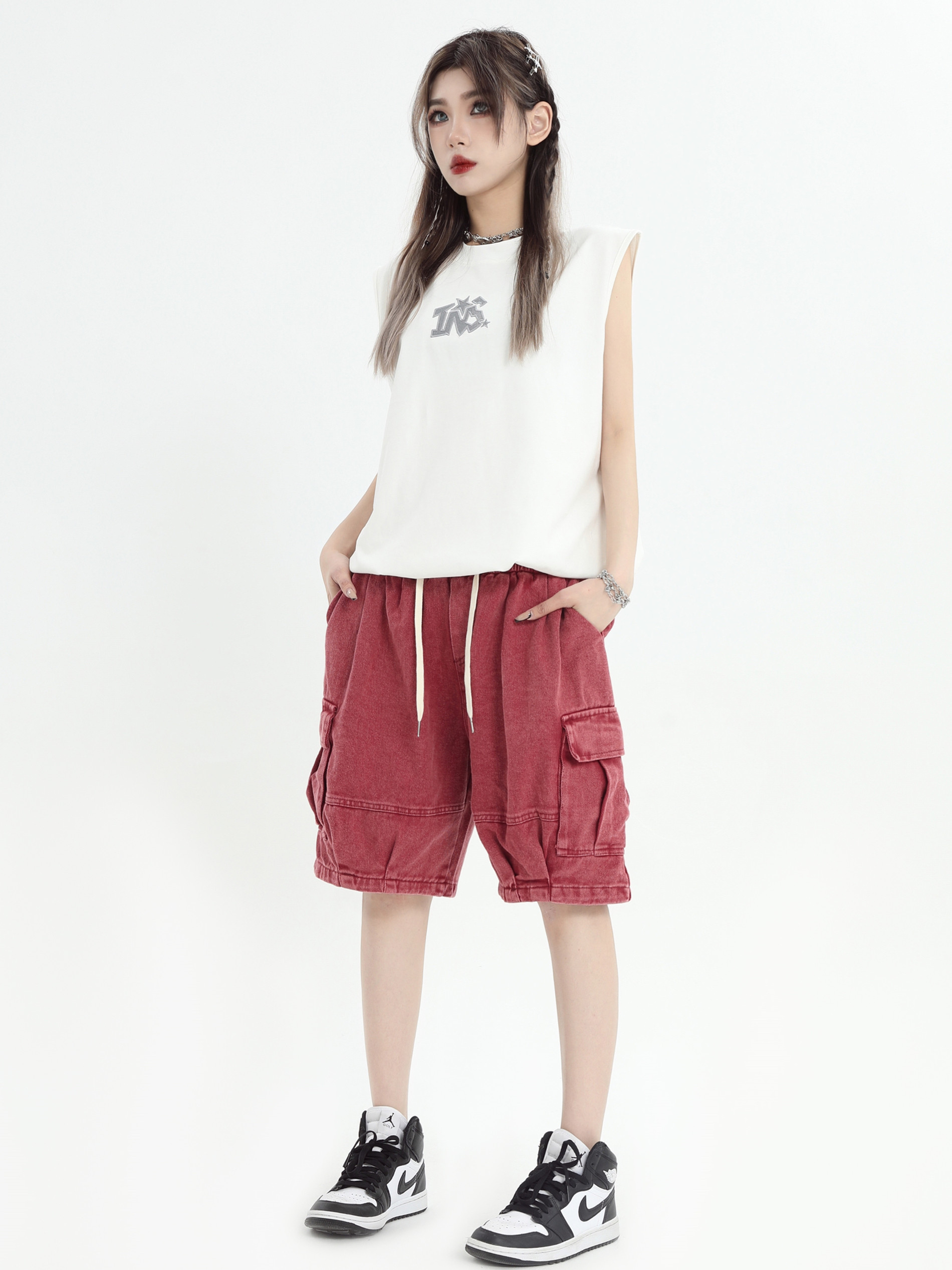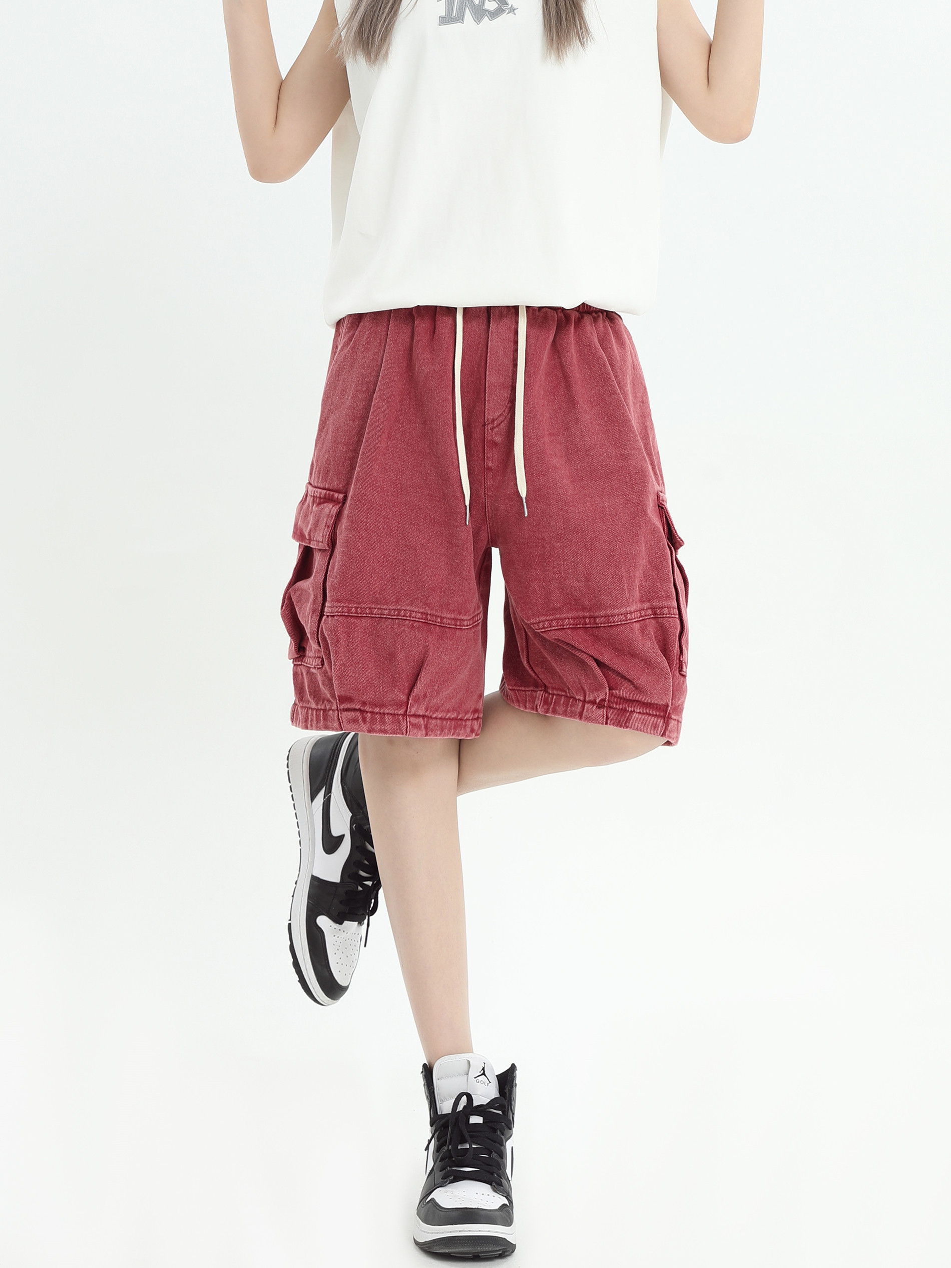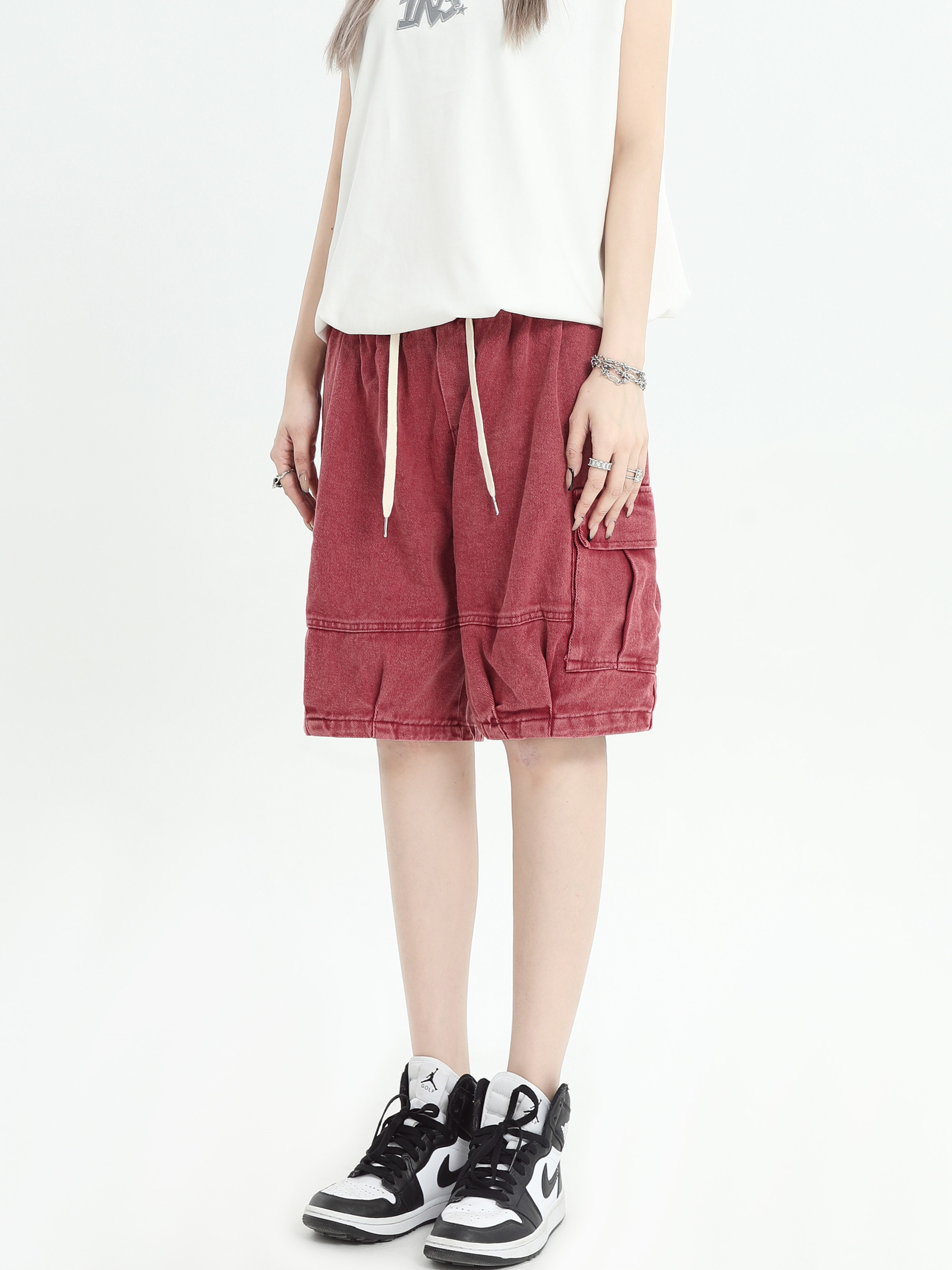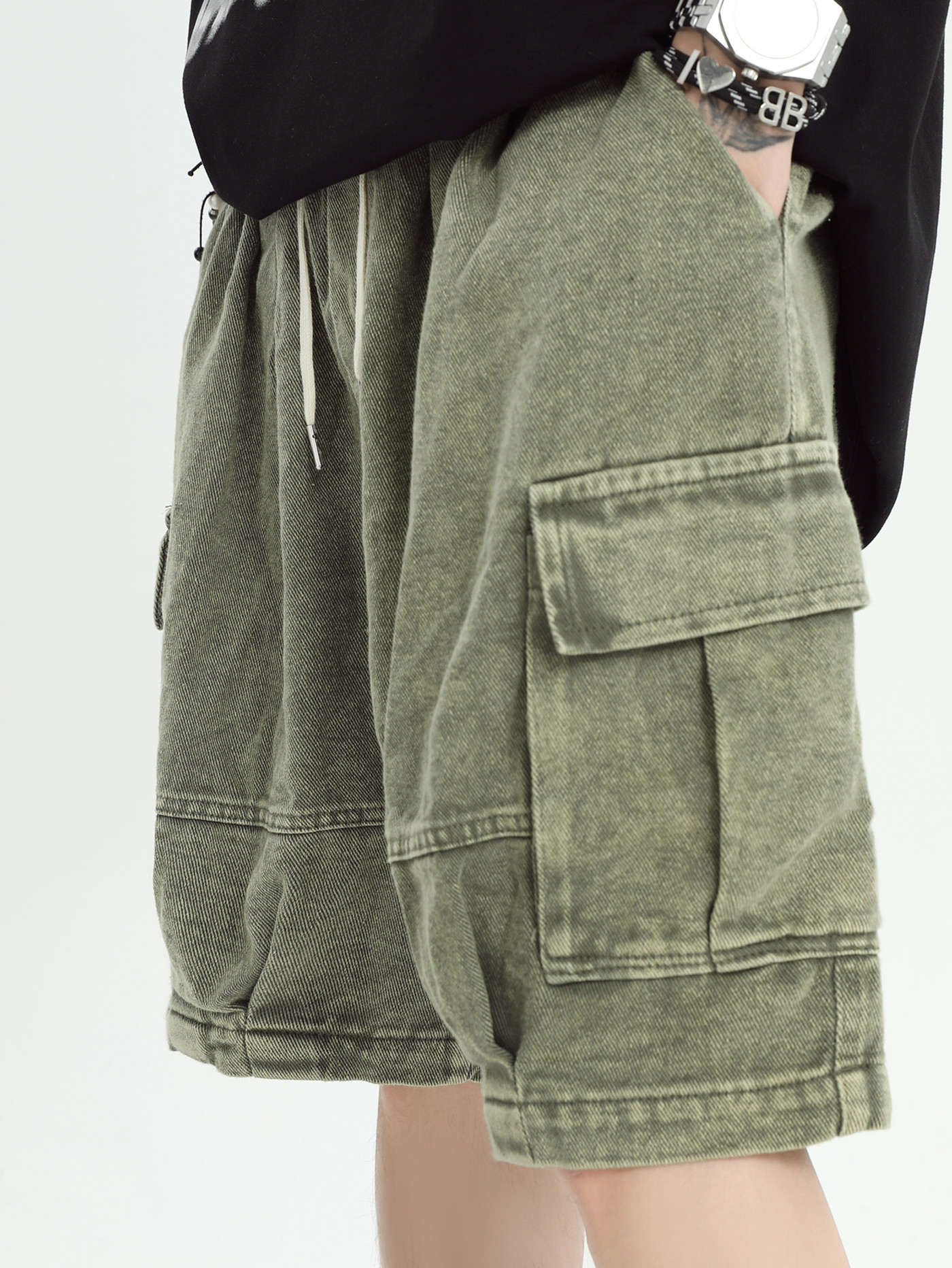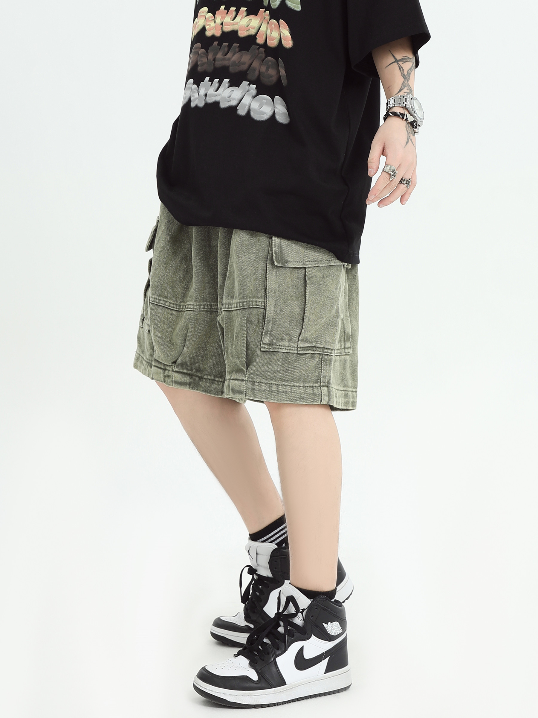【INSKR】國潮牌情侶美式做舊洗水牛仔短褲寬鬆貼袋工裝五分褲男