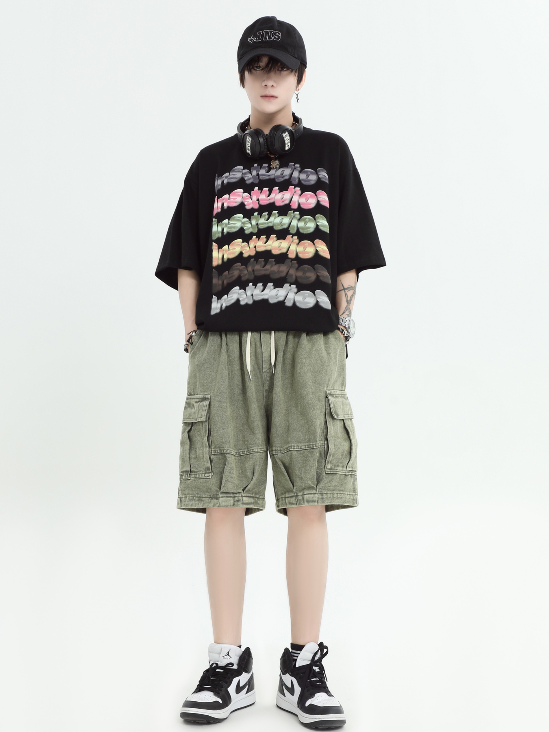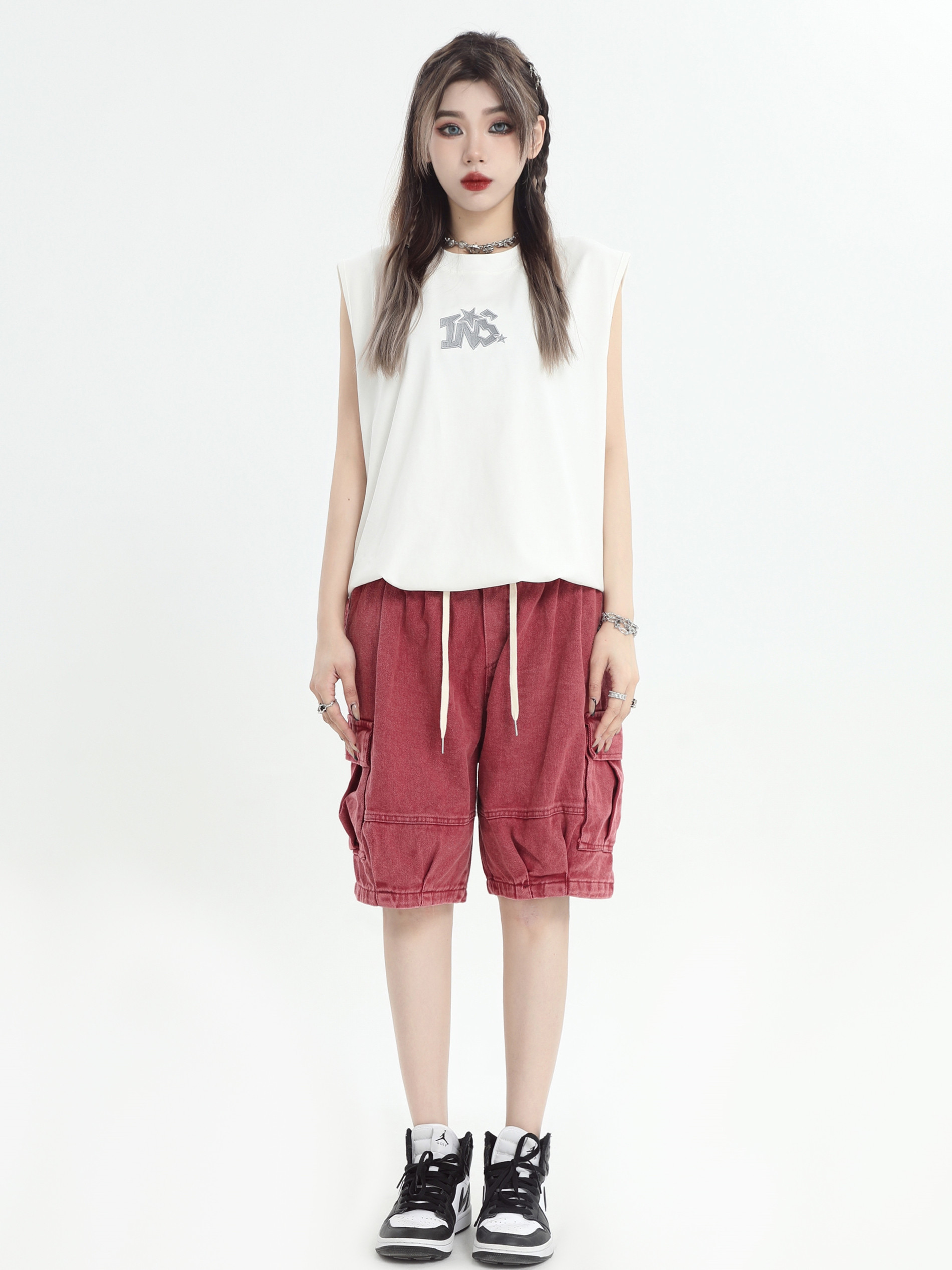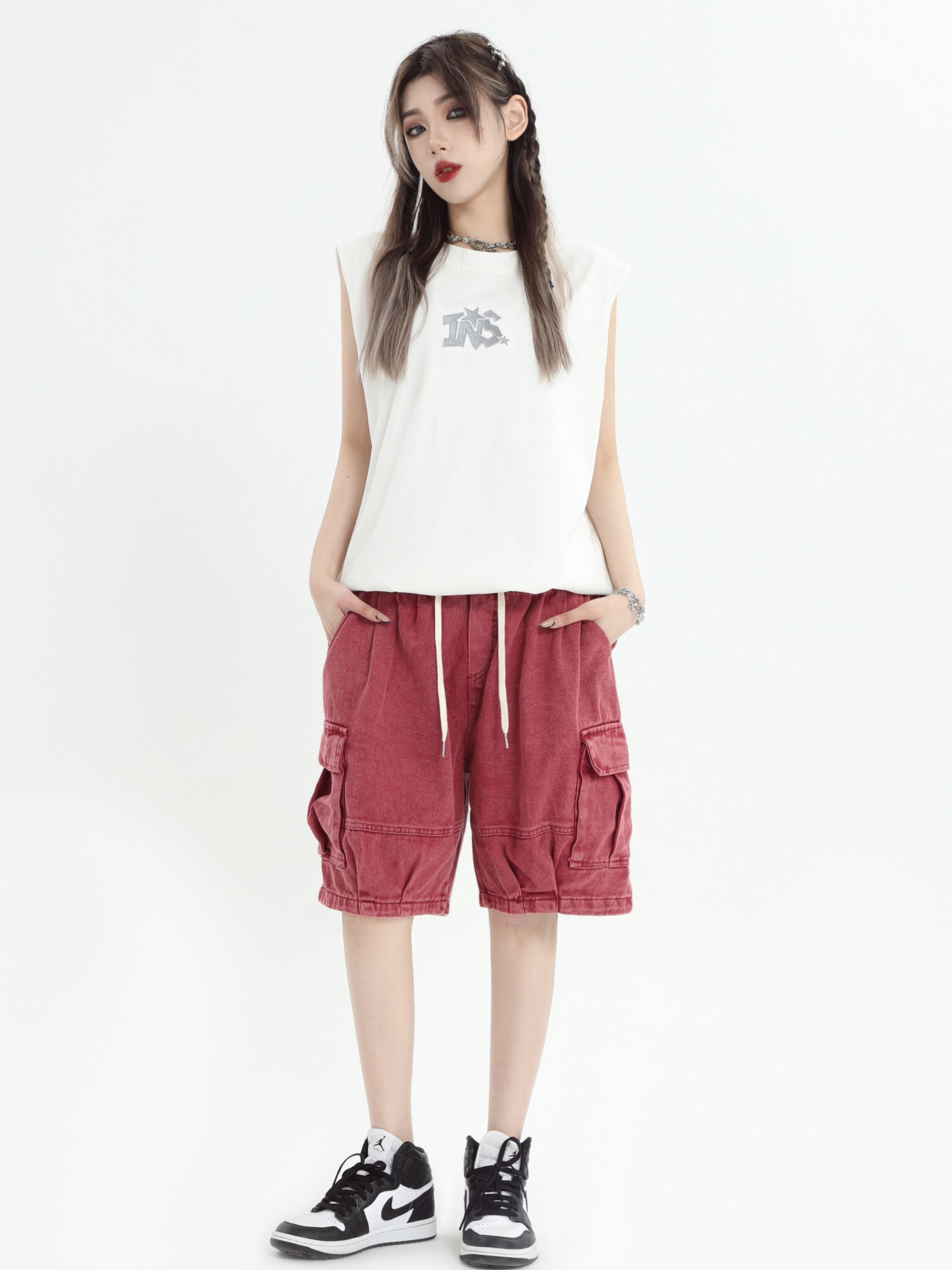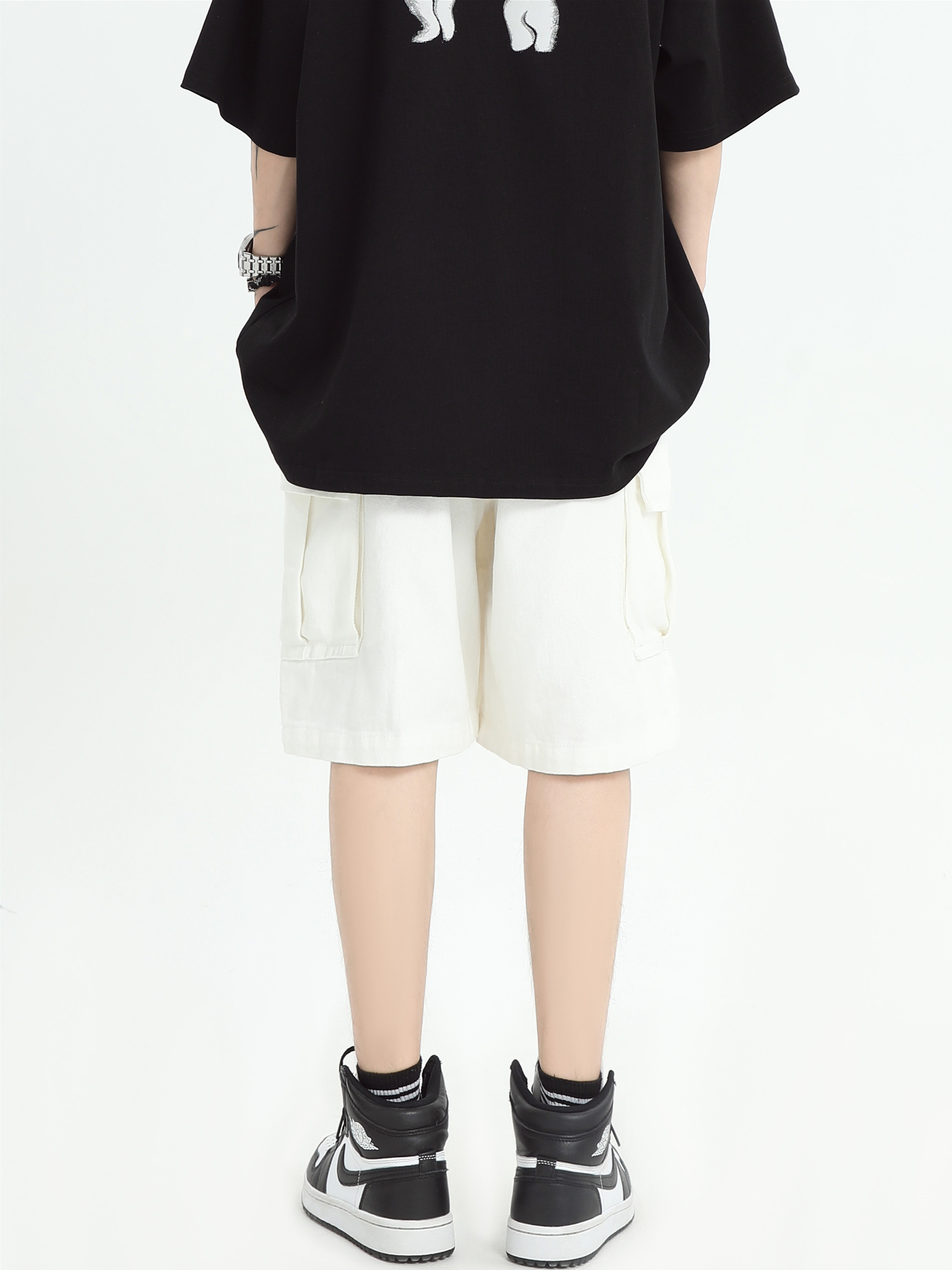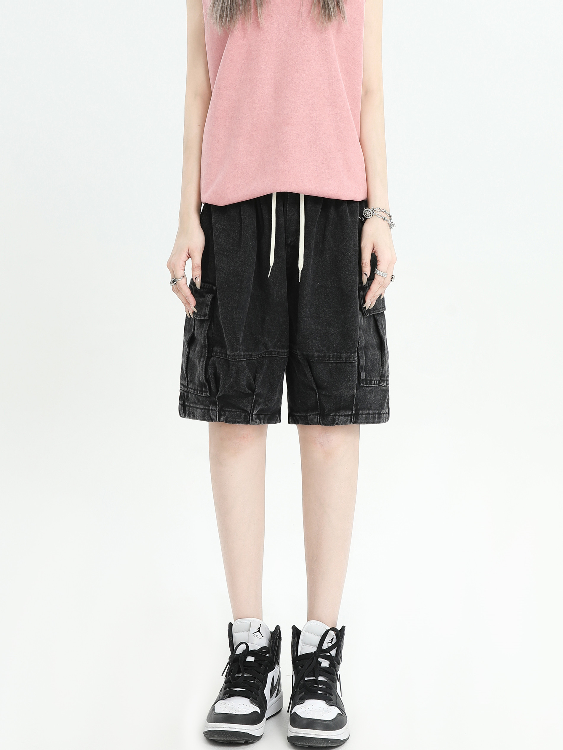 【INSKR】國潮牌情侶美式做舊洗水牛仔短褲寬鬆貼袋工裝五分褲男