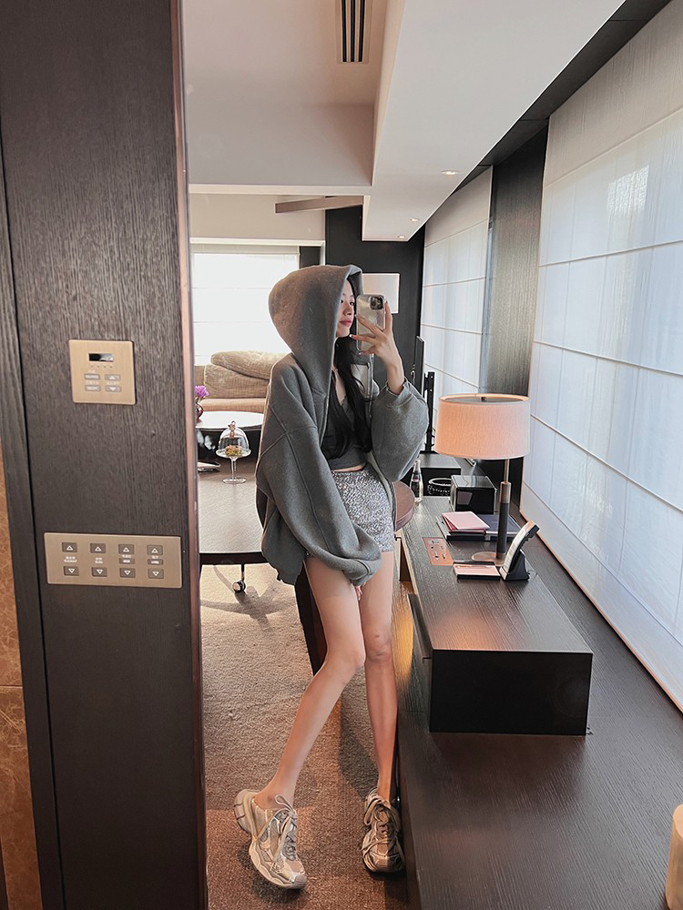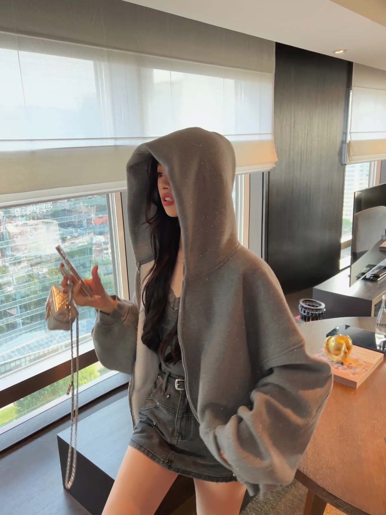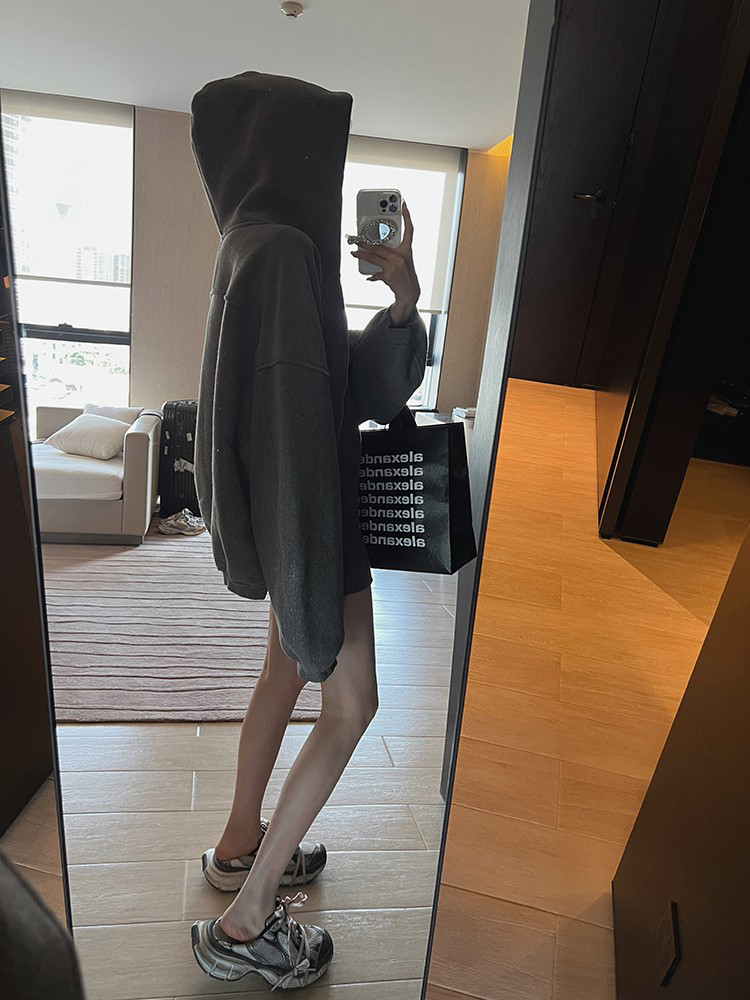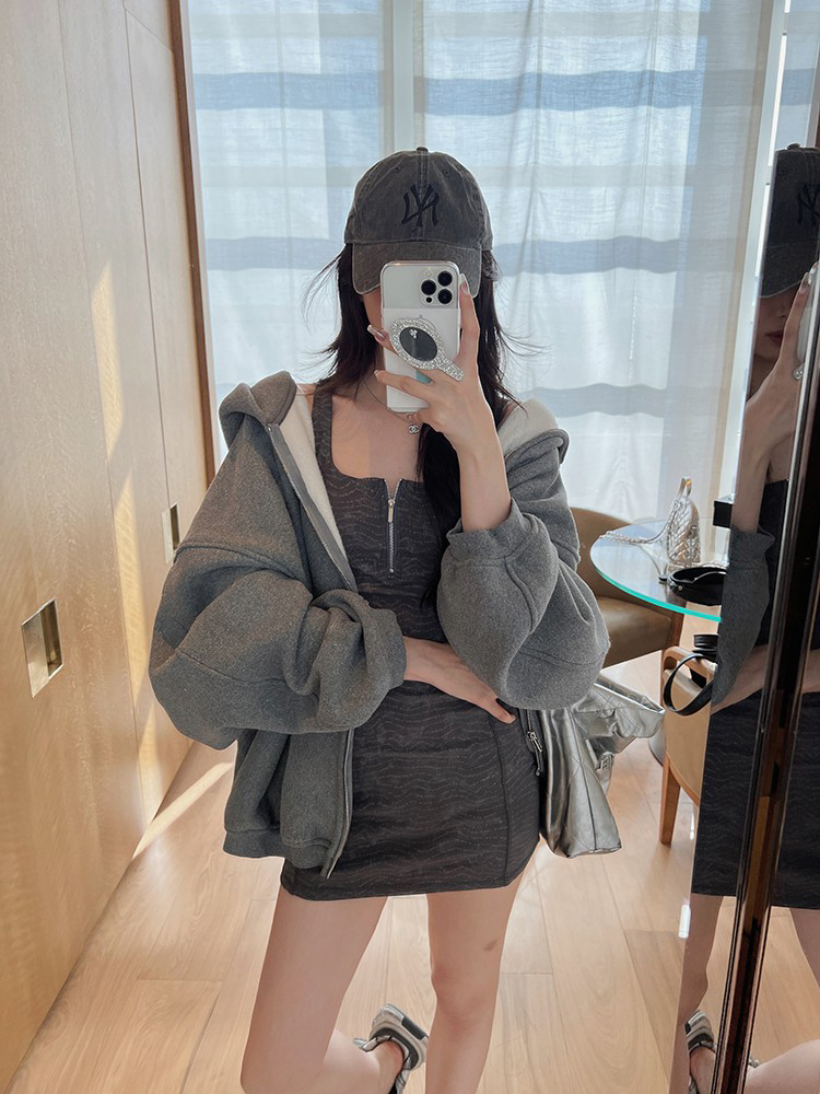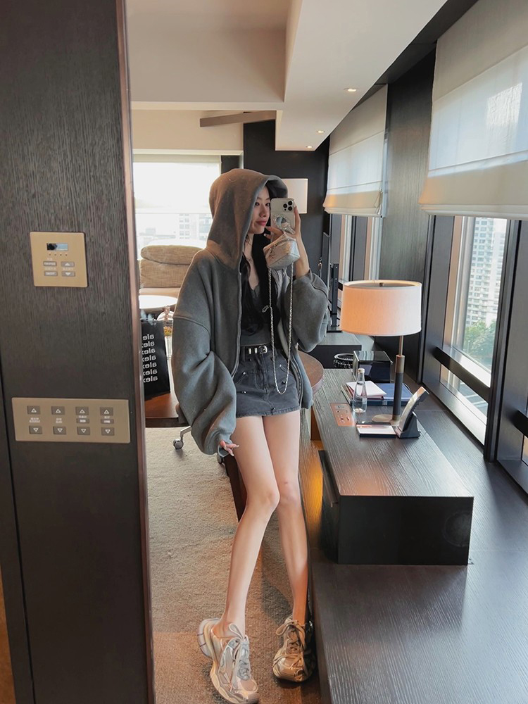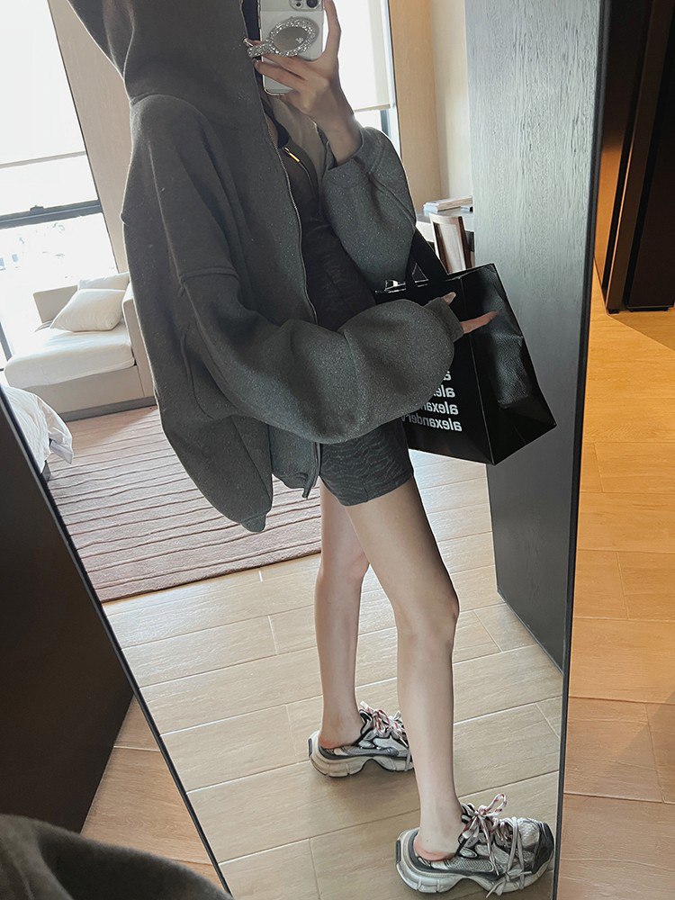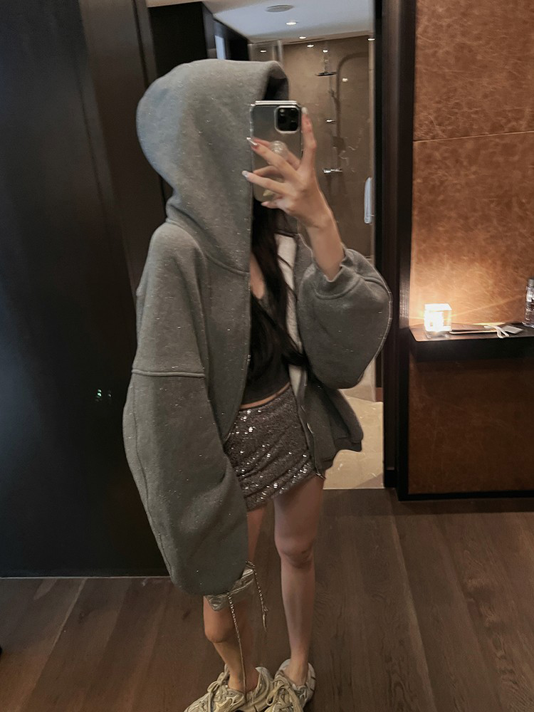 IN MIMIFACE 灰色連帽加絨衛衣女2023秋新款寬鬆拉鍊長袖開衫外套