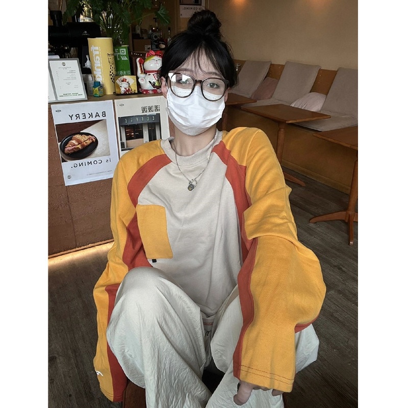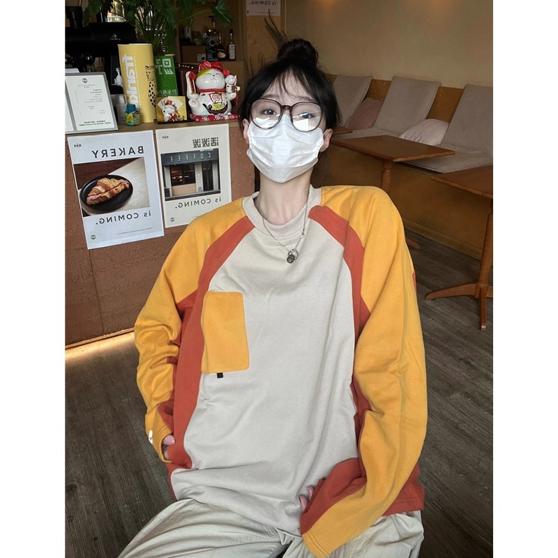 美式復古圓領拼接插肩袖衛衣女春秋2023新款設計感寬鬆撞色上衣潮