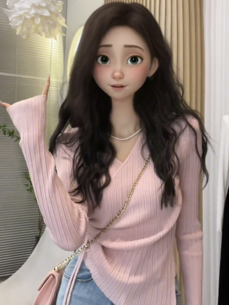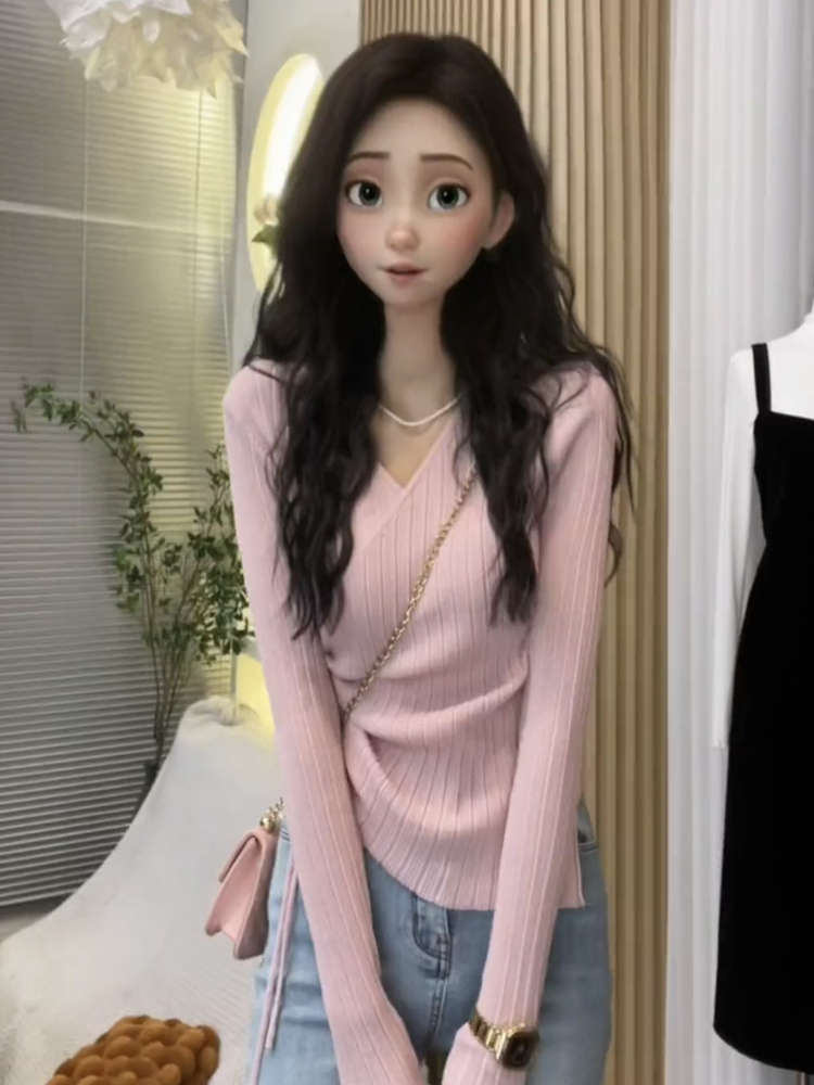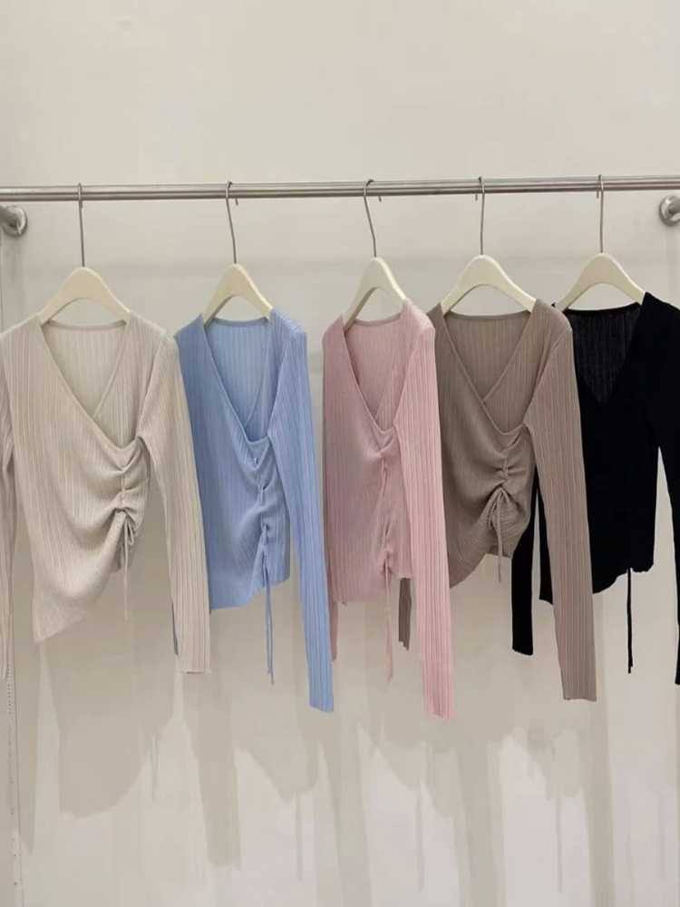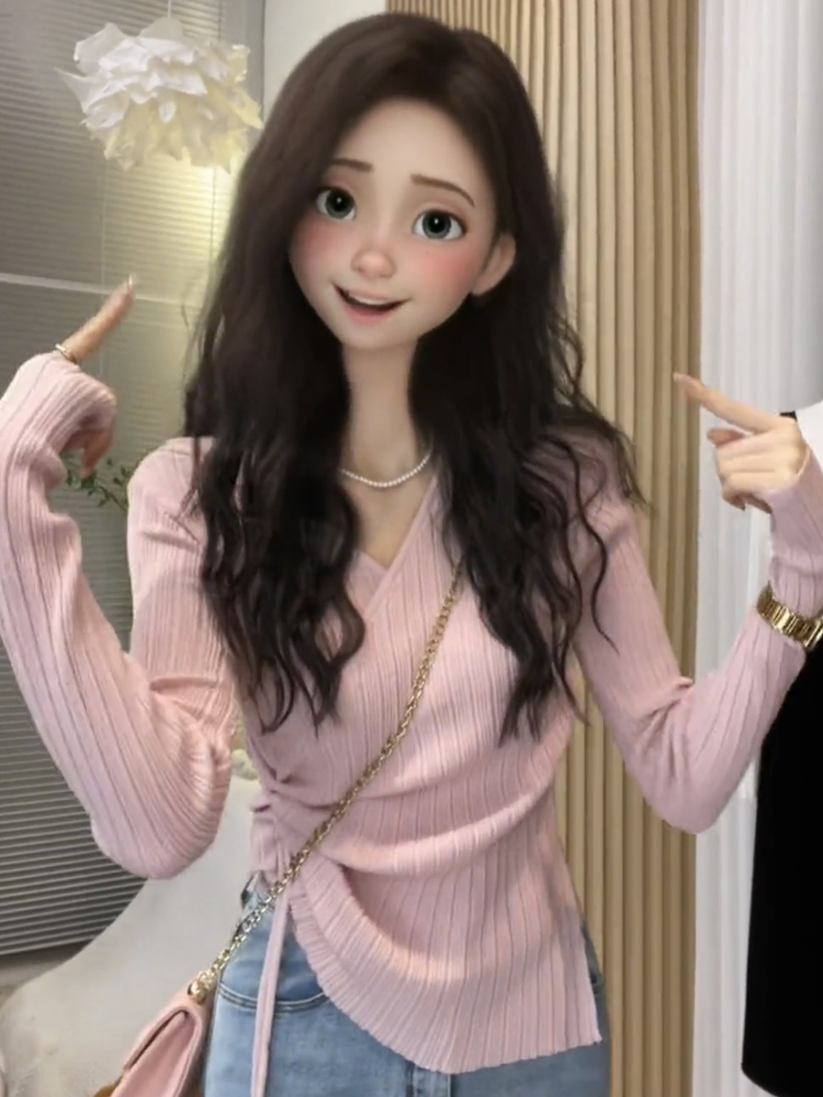 粉色氣質顯瘦V領針織打底衫女設計感小眾內搭抽繩初秋高級感上衣
