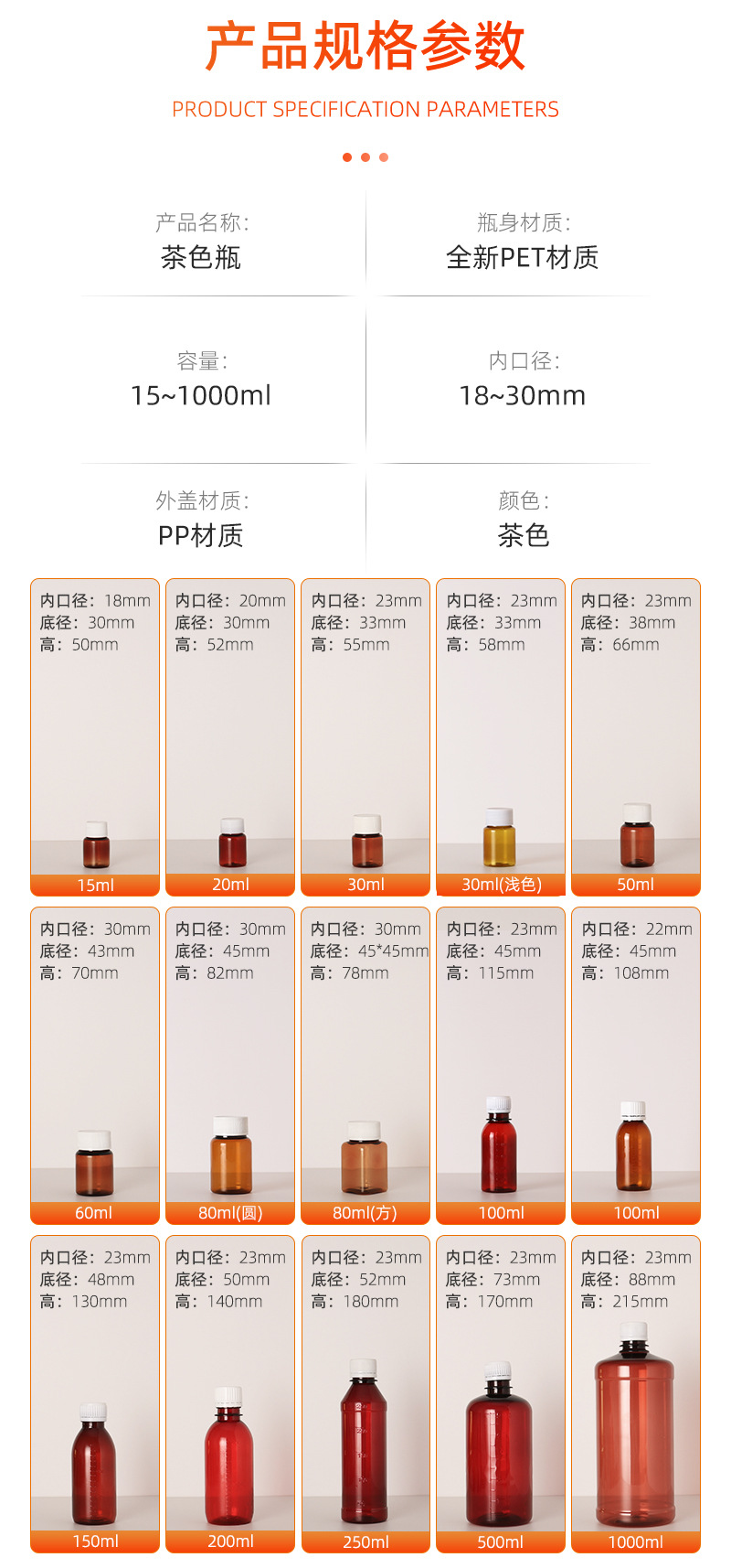 容量 20ML茶色瓶,30ML茶色瓶,15ML茶色瓶,60ML茶色瓶,80ML茶色瓶 方形,80ML茶色瓶 圆形,100ML茶色瓶(浅密刻度),30ML茶色瓶(浅色),100ML茶色瓶(高密刻度),200ML茶色瓶(高密刻度),150ML茶色瓶(高密刻度),250ML茶色瓶(高密刻度),500ML茶色瓶(高密刻度),50ML茶色瓶(定制款),1000ML茶色瓶(定制款)