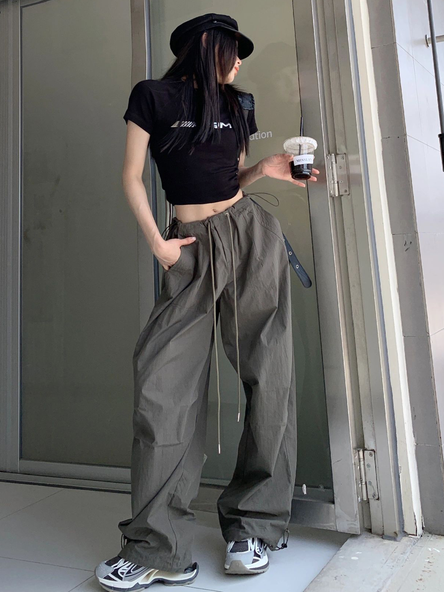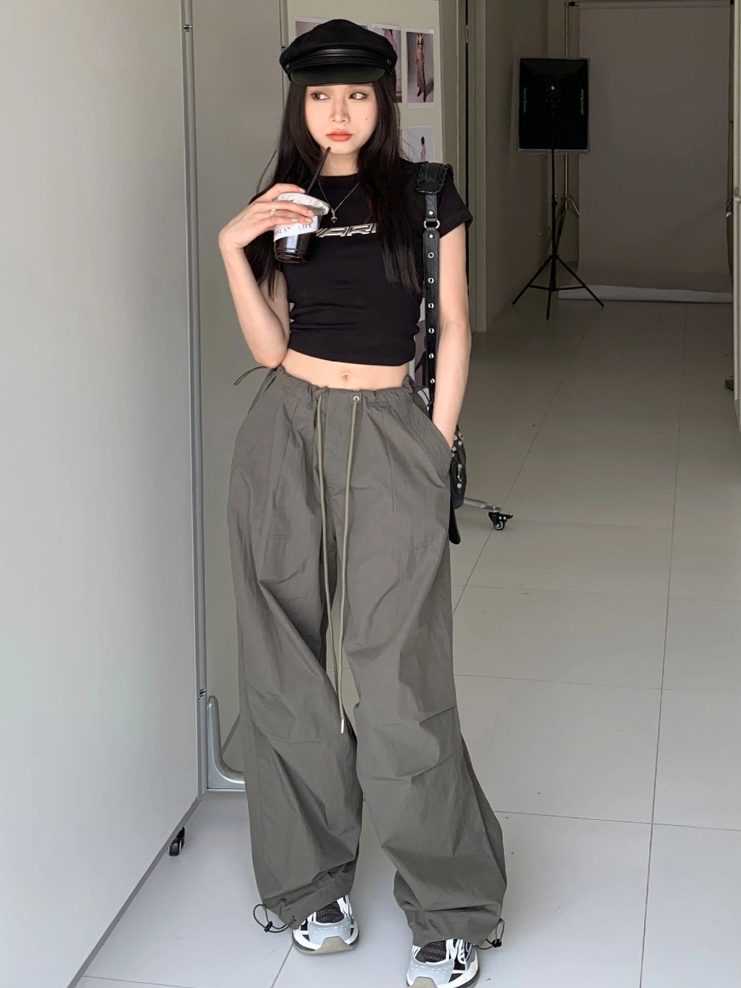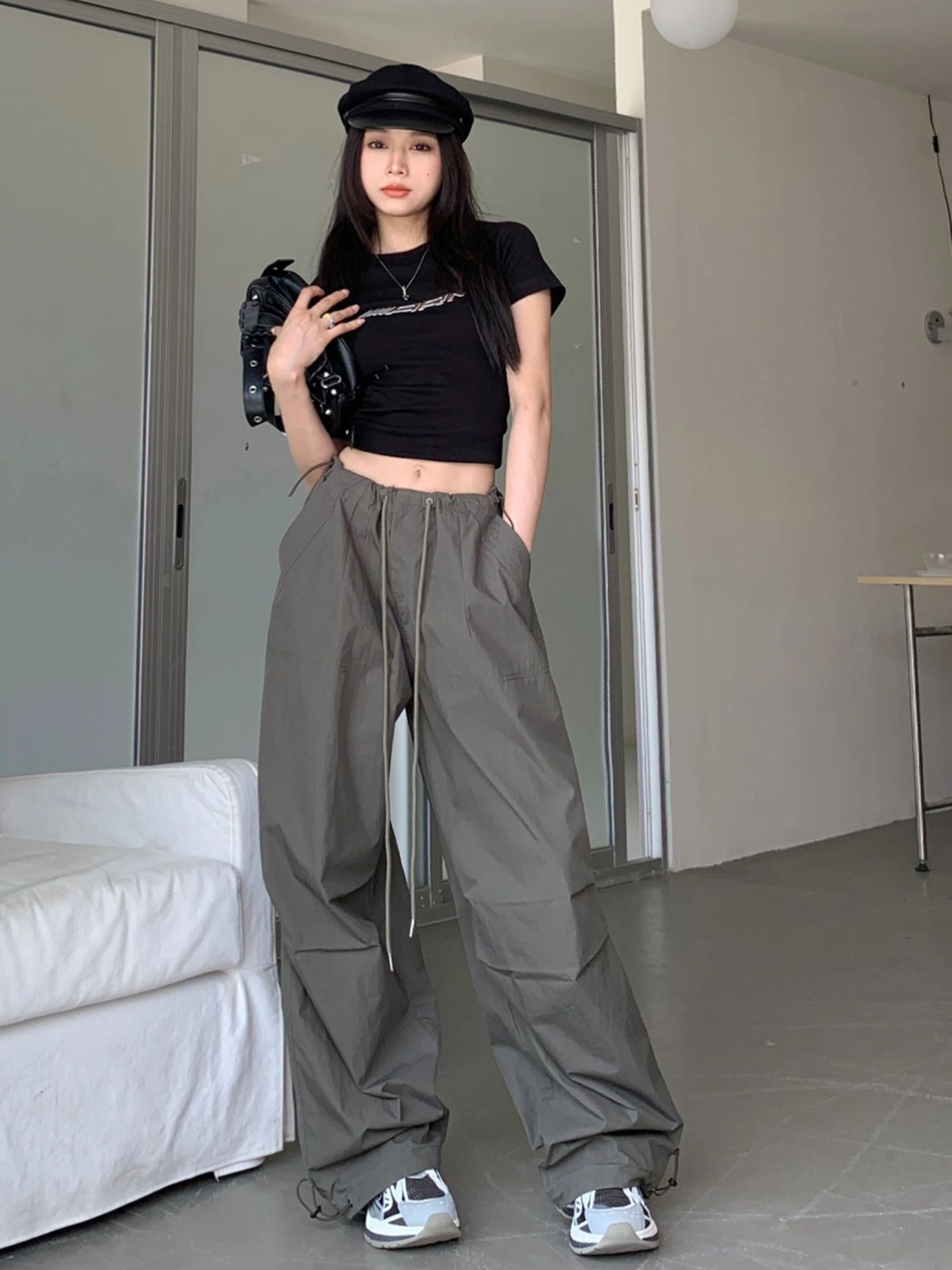 美式高街hiphop工裝褲女夏季新款褶皺降落傘褲顯瘦垂感闊腿拖地褲