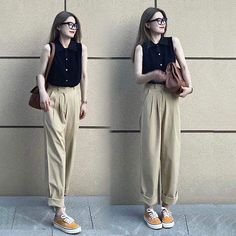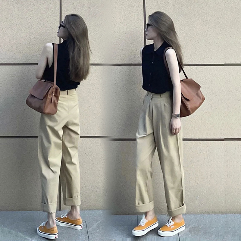 高腰直筒卡其色西装裤女夏夏季薄款裤子阔腿运动卫裤休闲哈伦长裤