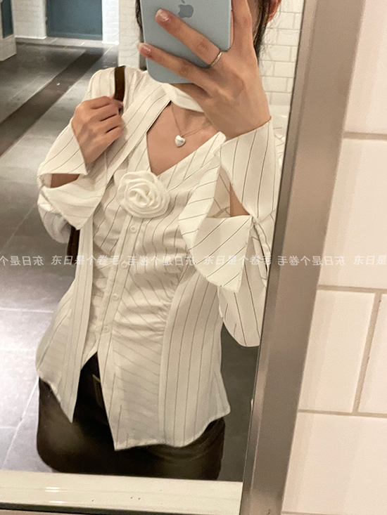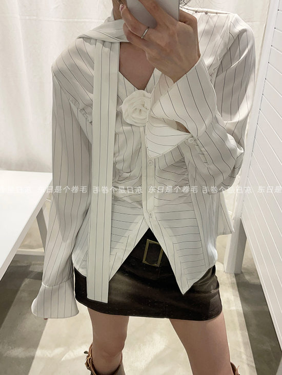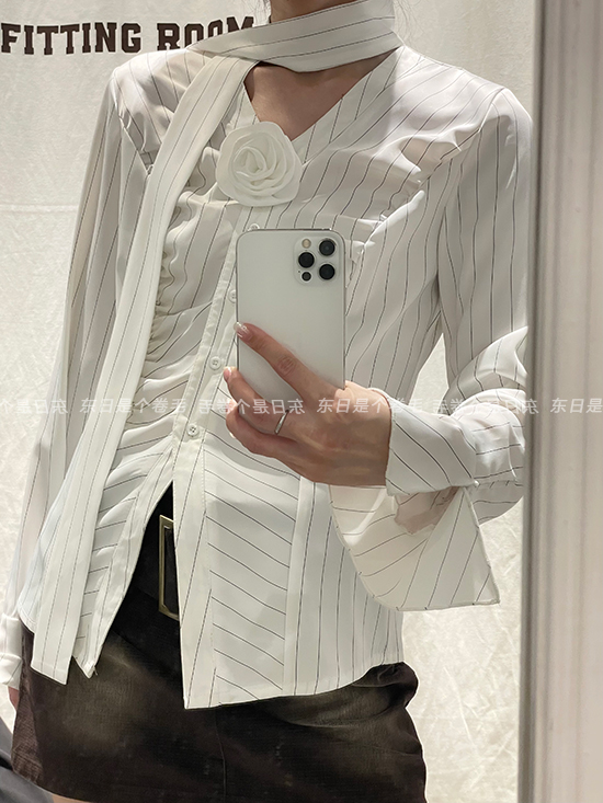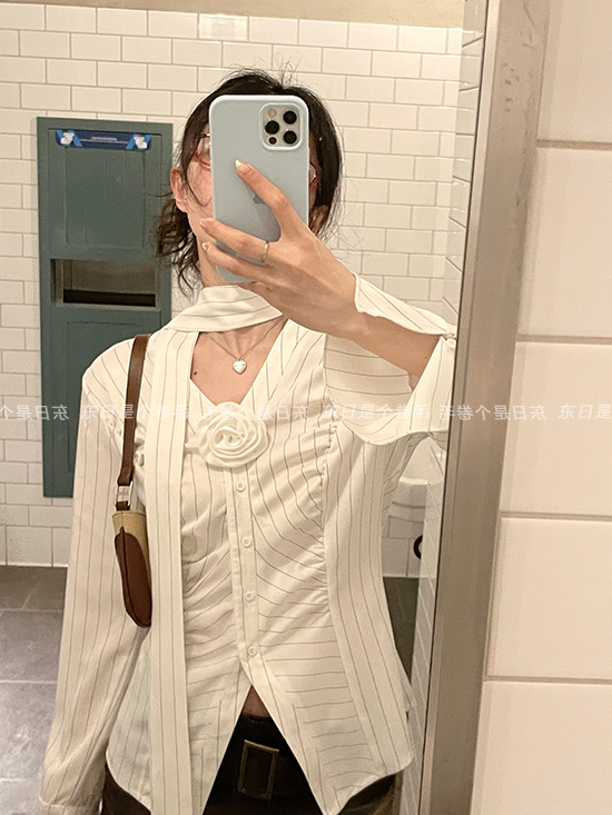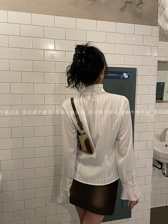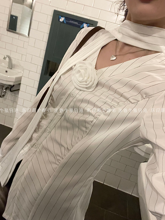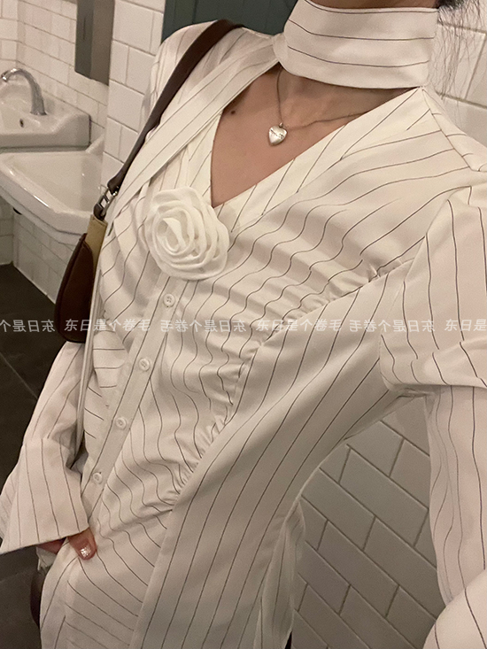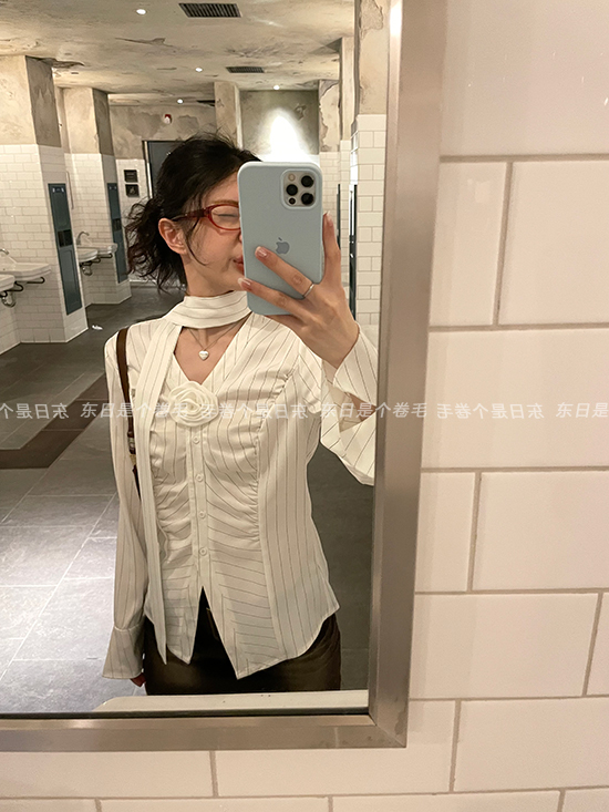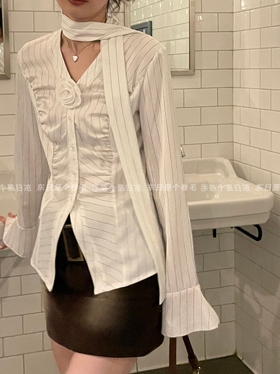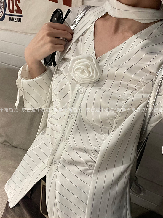 東日是個捲毛 聖德羅佩莊園 條紋襯衫女夏收腰V領襯衫長袖上衣