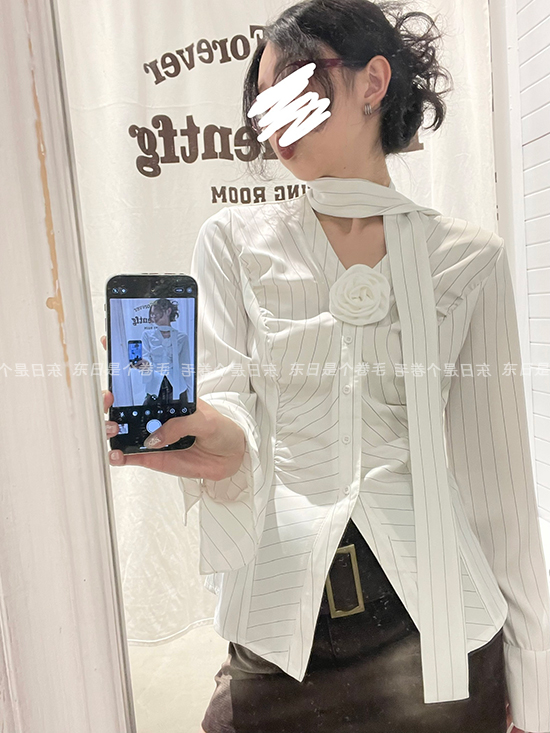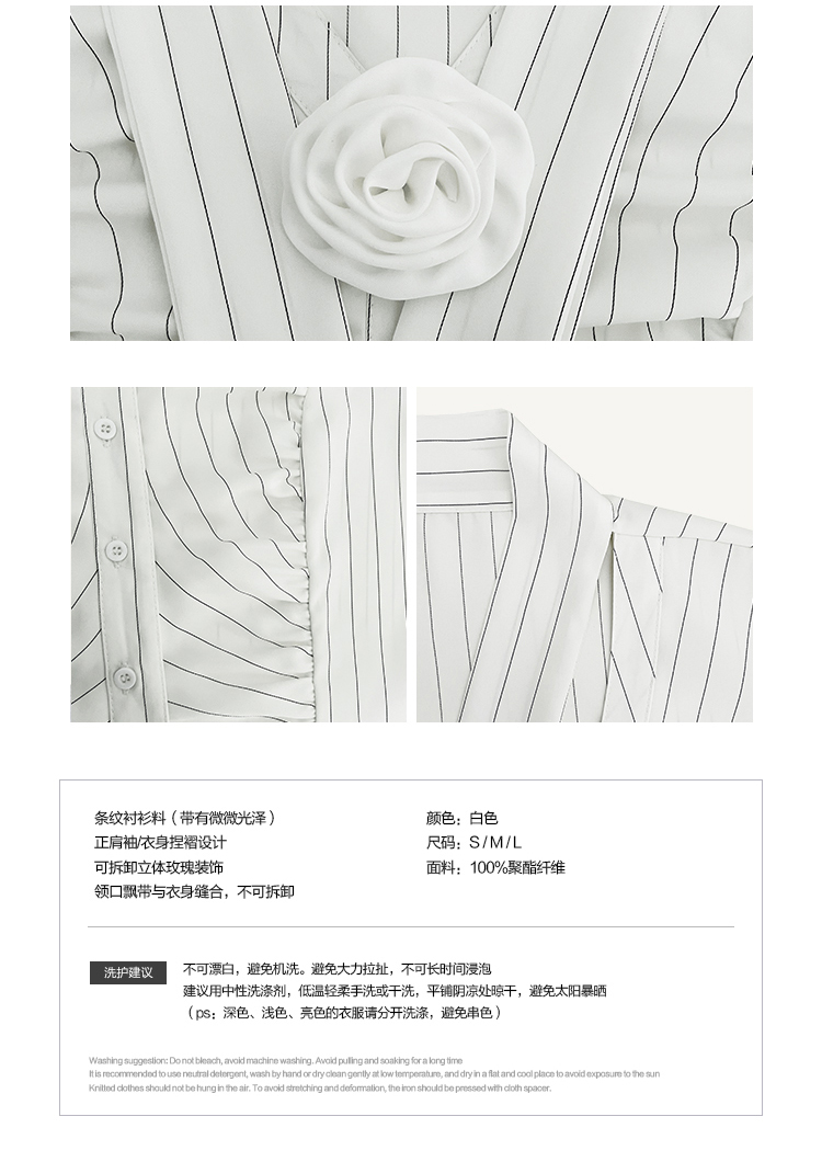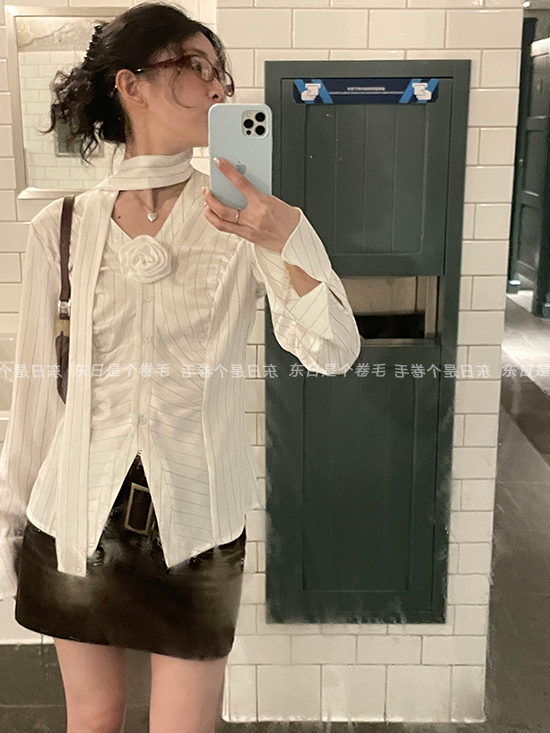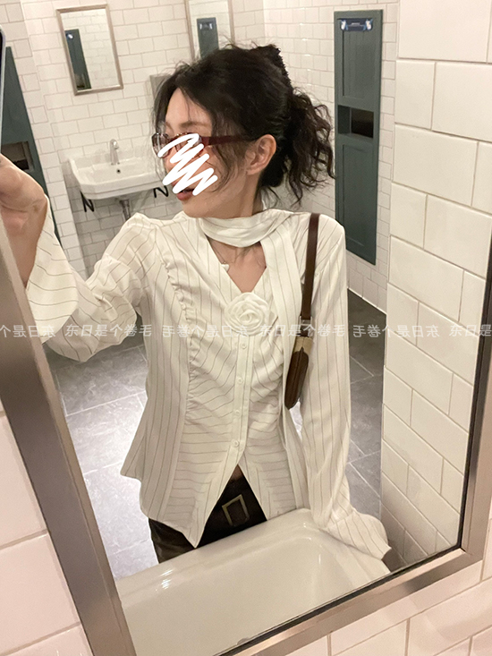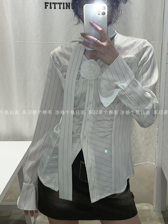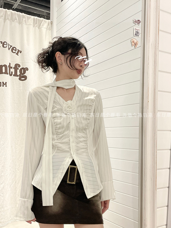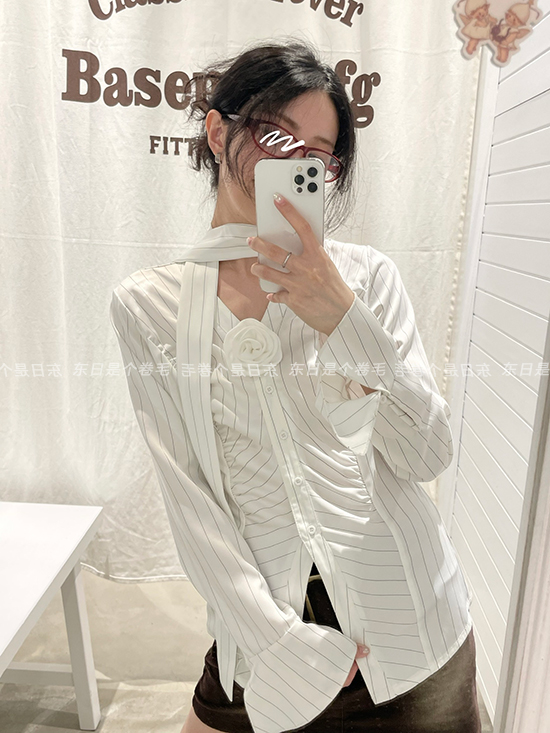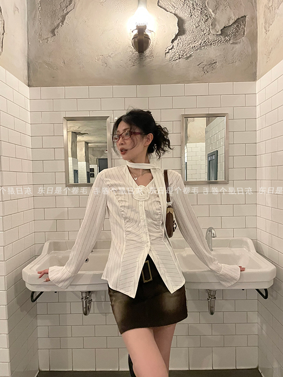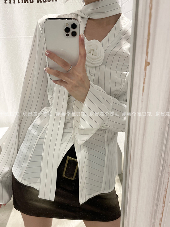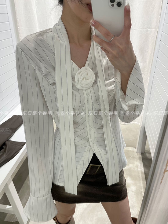 東日是個捲毛 聖德羅佩莊園 條紋襯衫女夏收腰V領襯衫長袖上衣