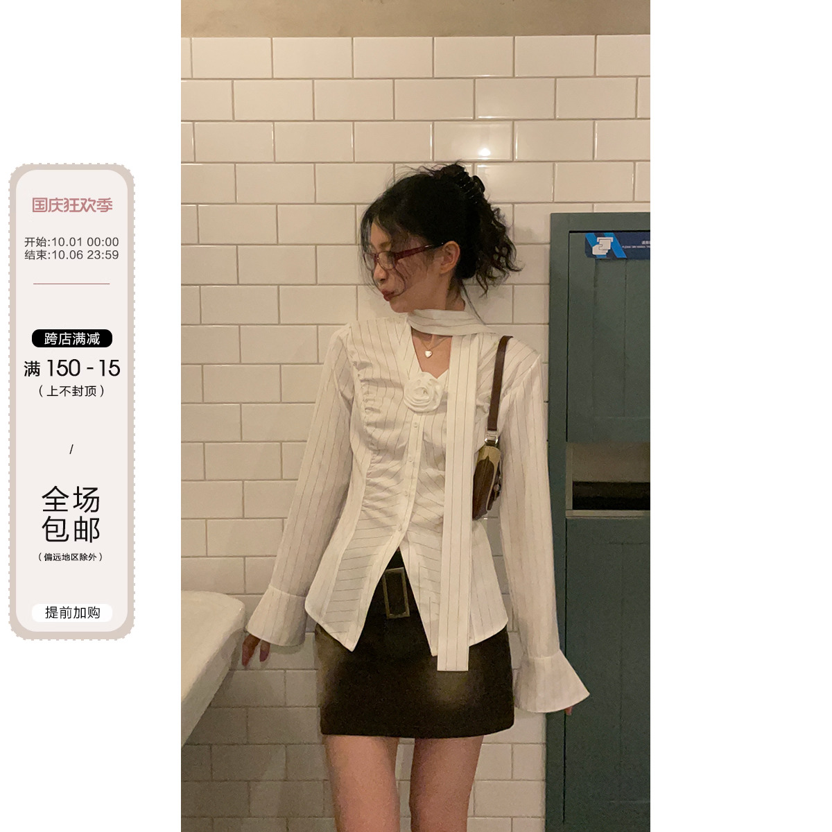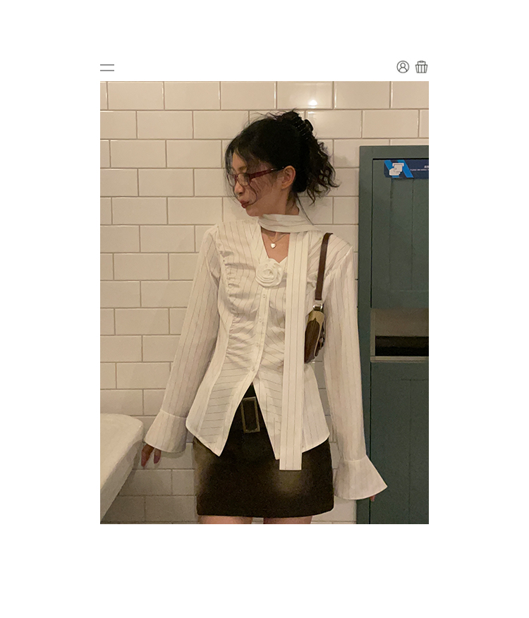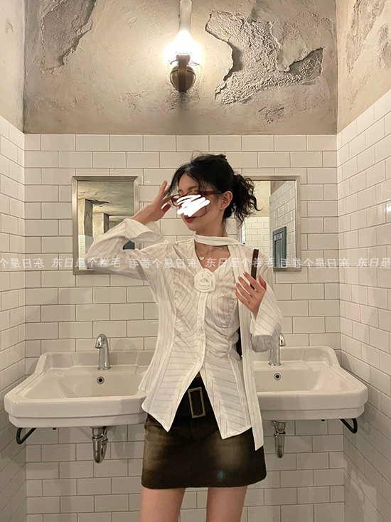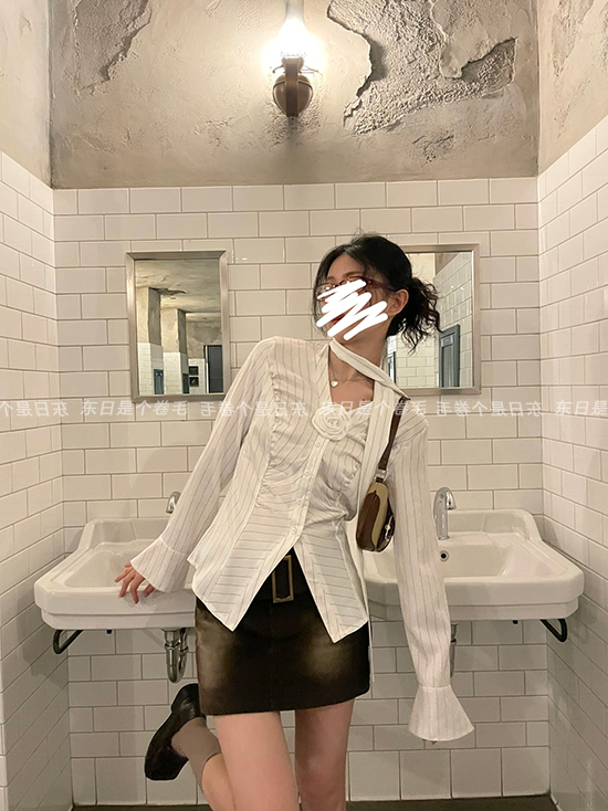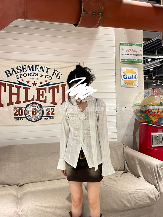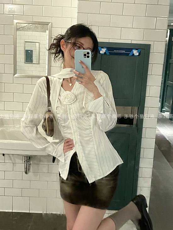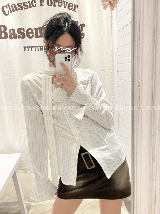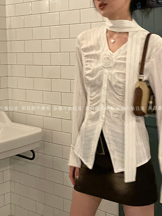 東日是個捲毛 聖德羅佩莊園 條紋襯衫女夏收腰V領襯衫長袖上衣