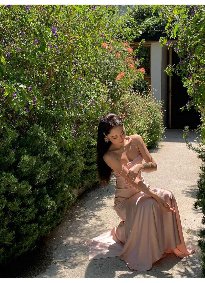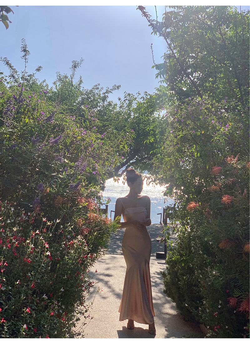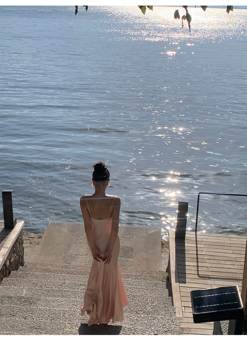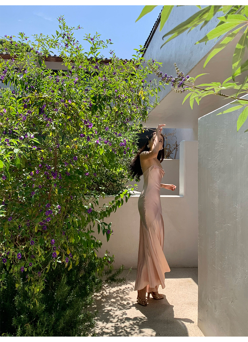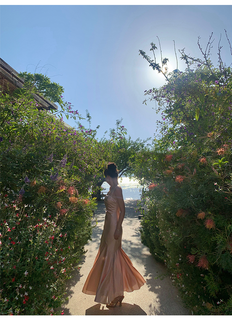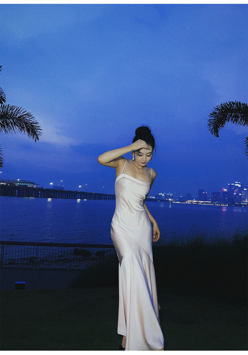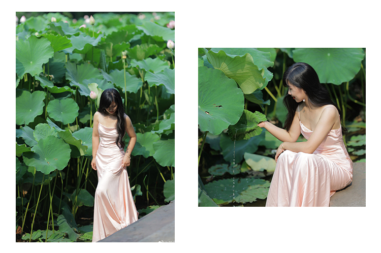 两根细细的肩带描绘肩颈线条的美好,静谧而柔和