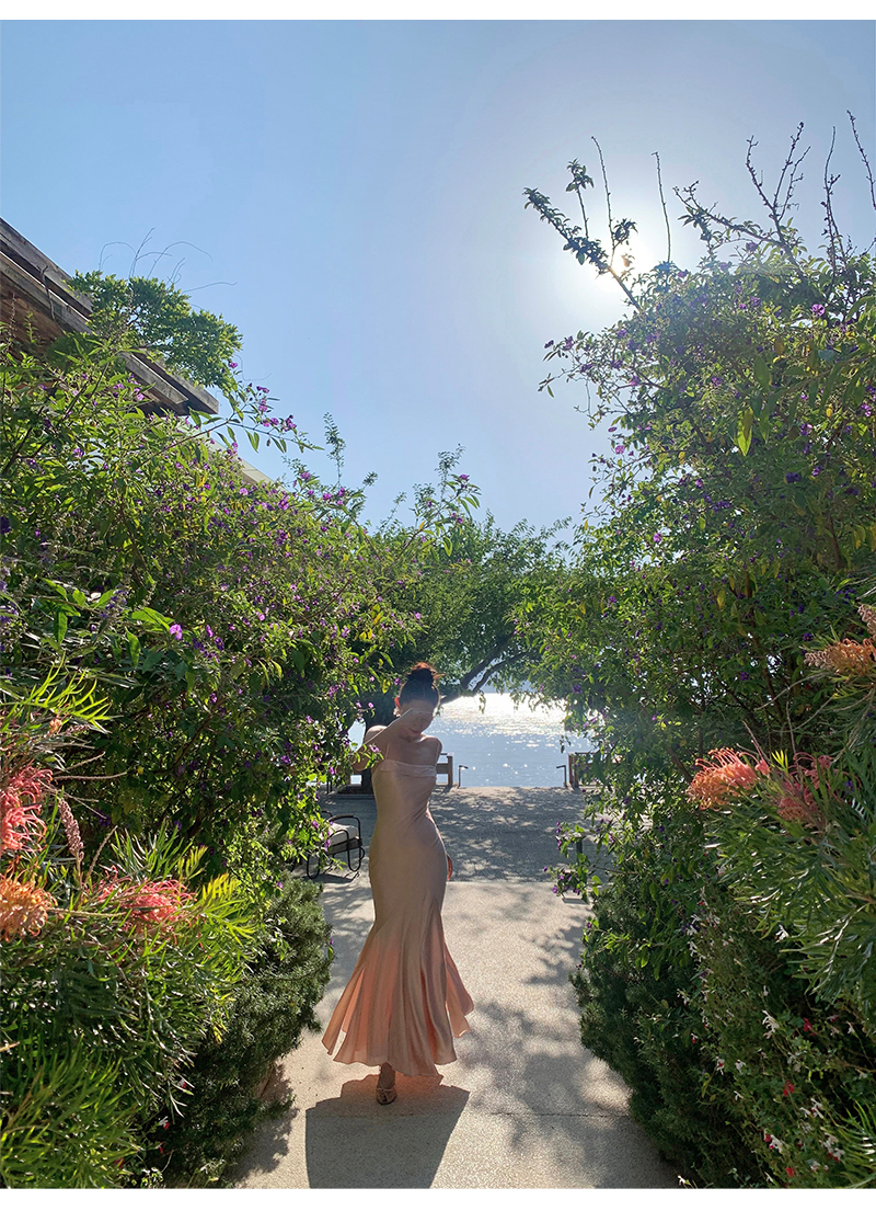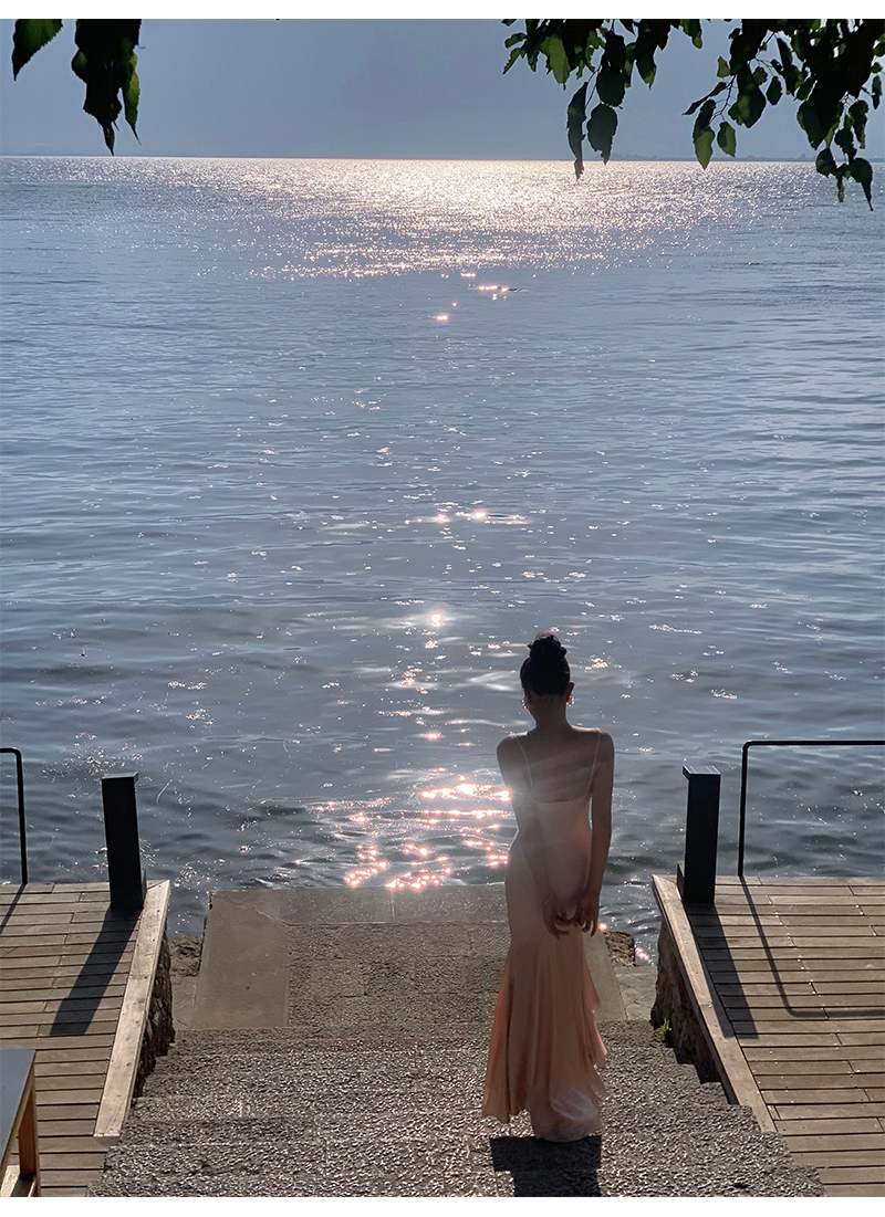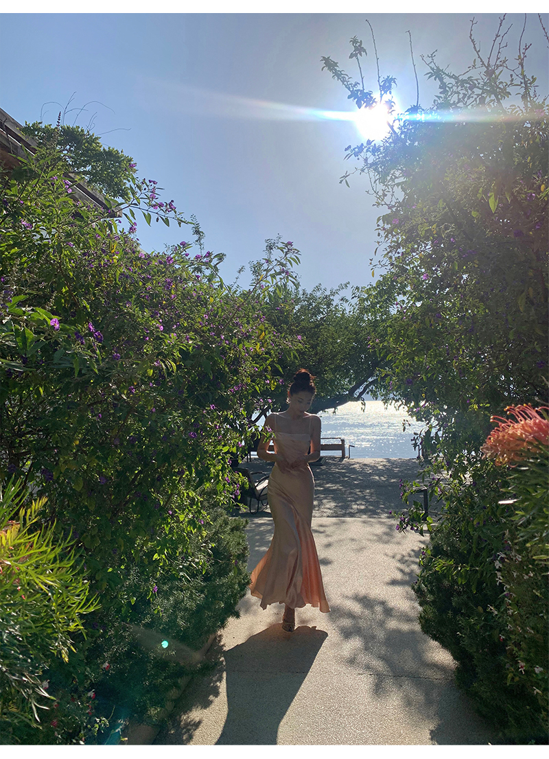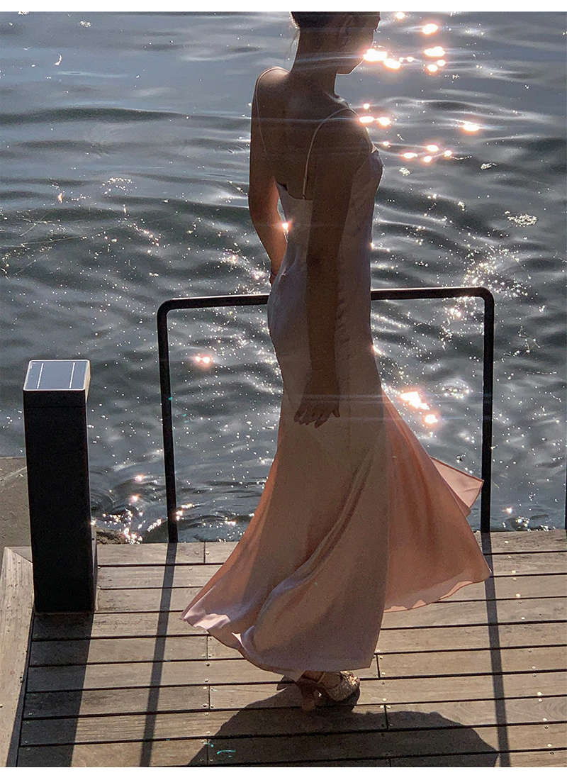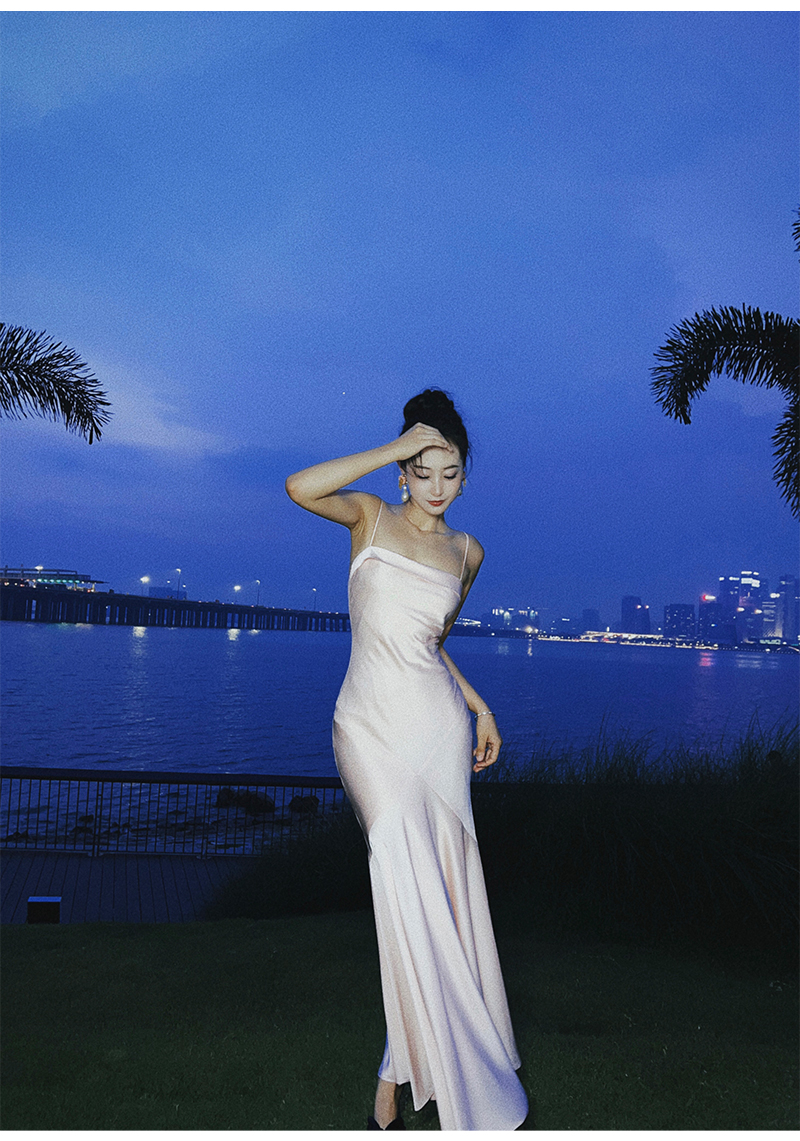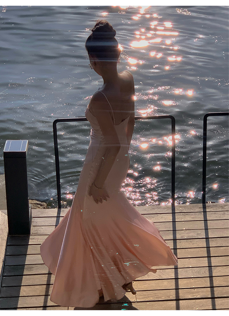 两根细细的肩带描绘肩颈线条的美好,静谧而柔和