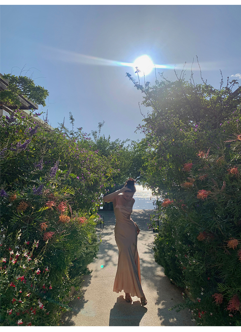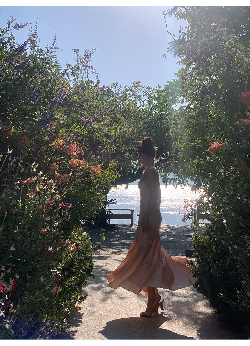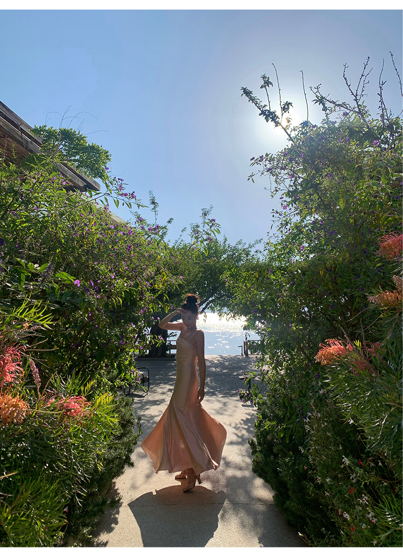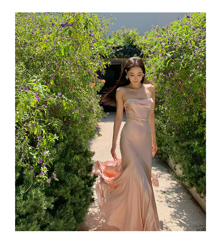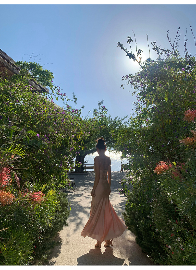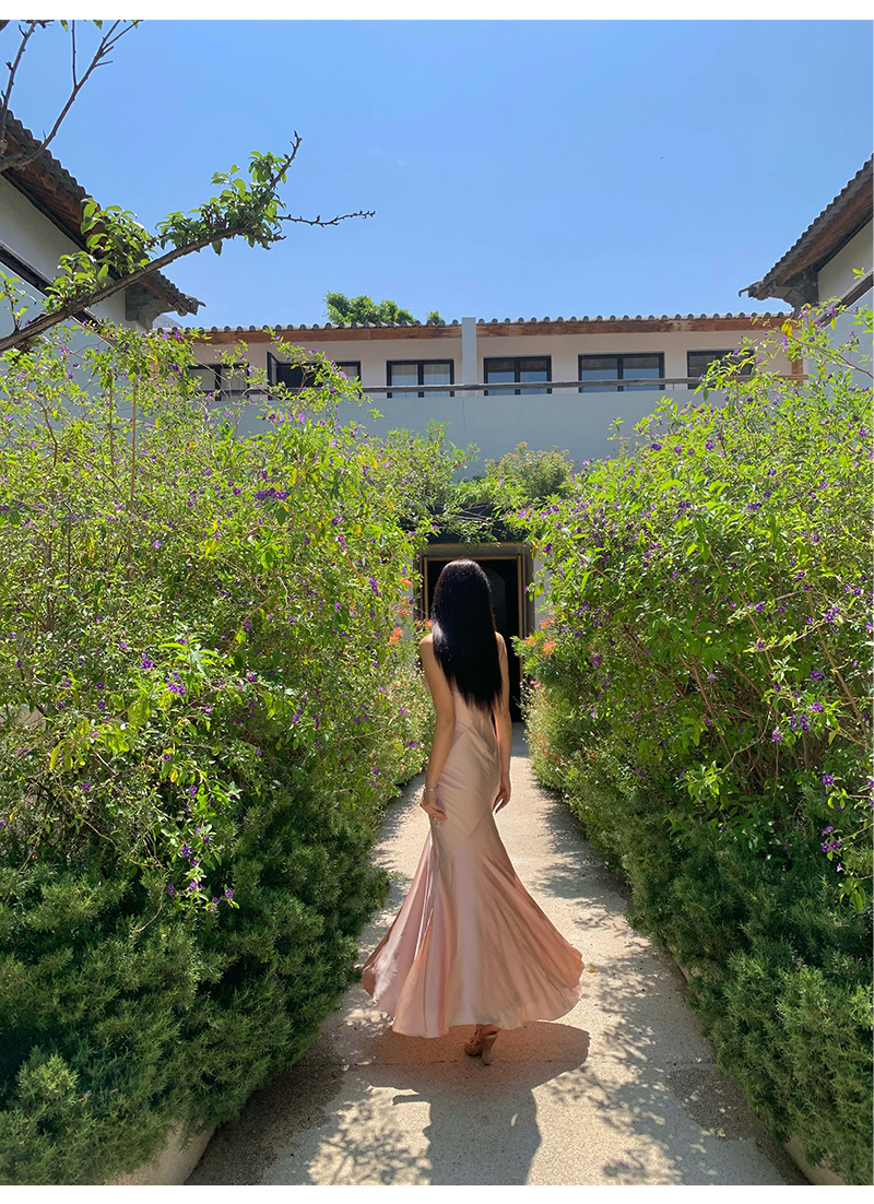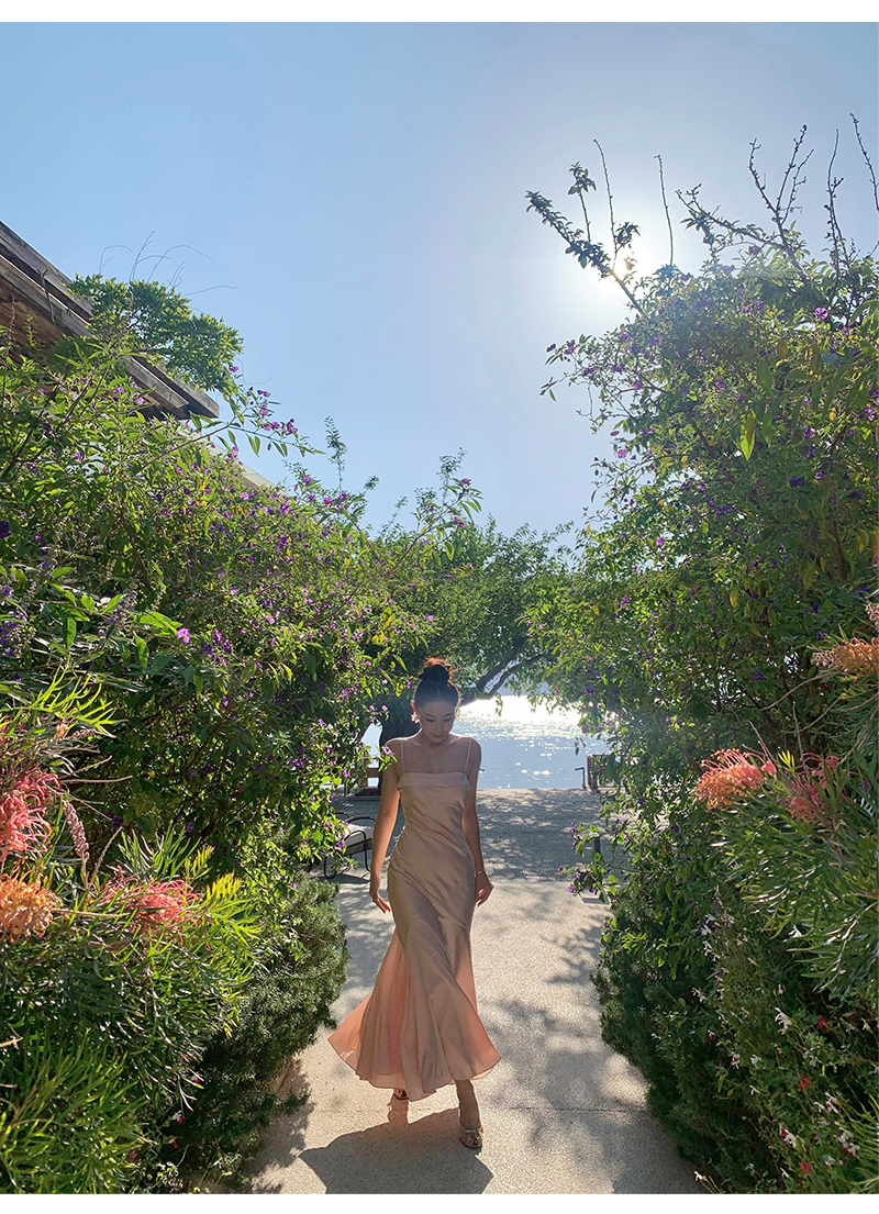 两根细细的肩带描绘肩颈线条的美好,静谧而柔和