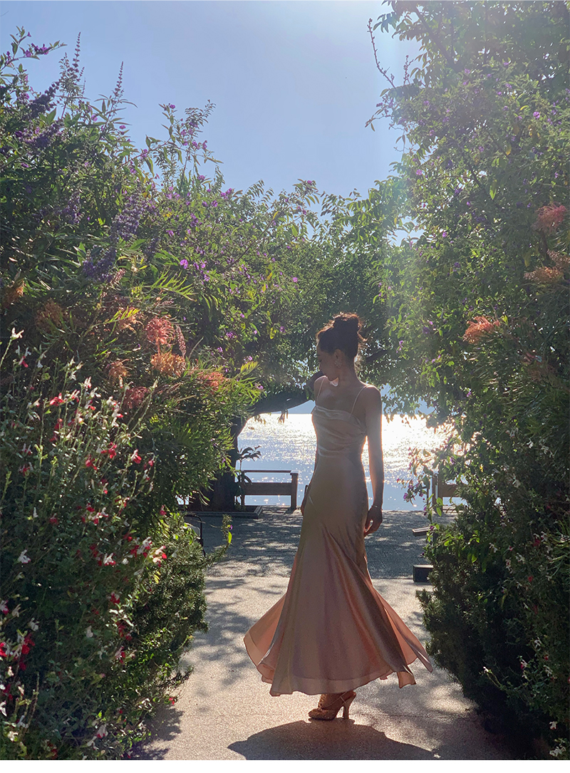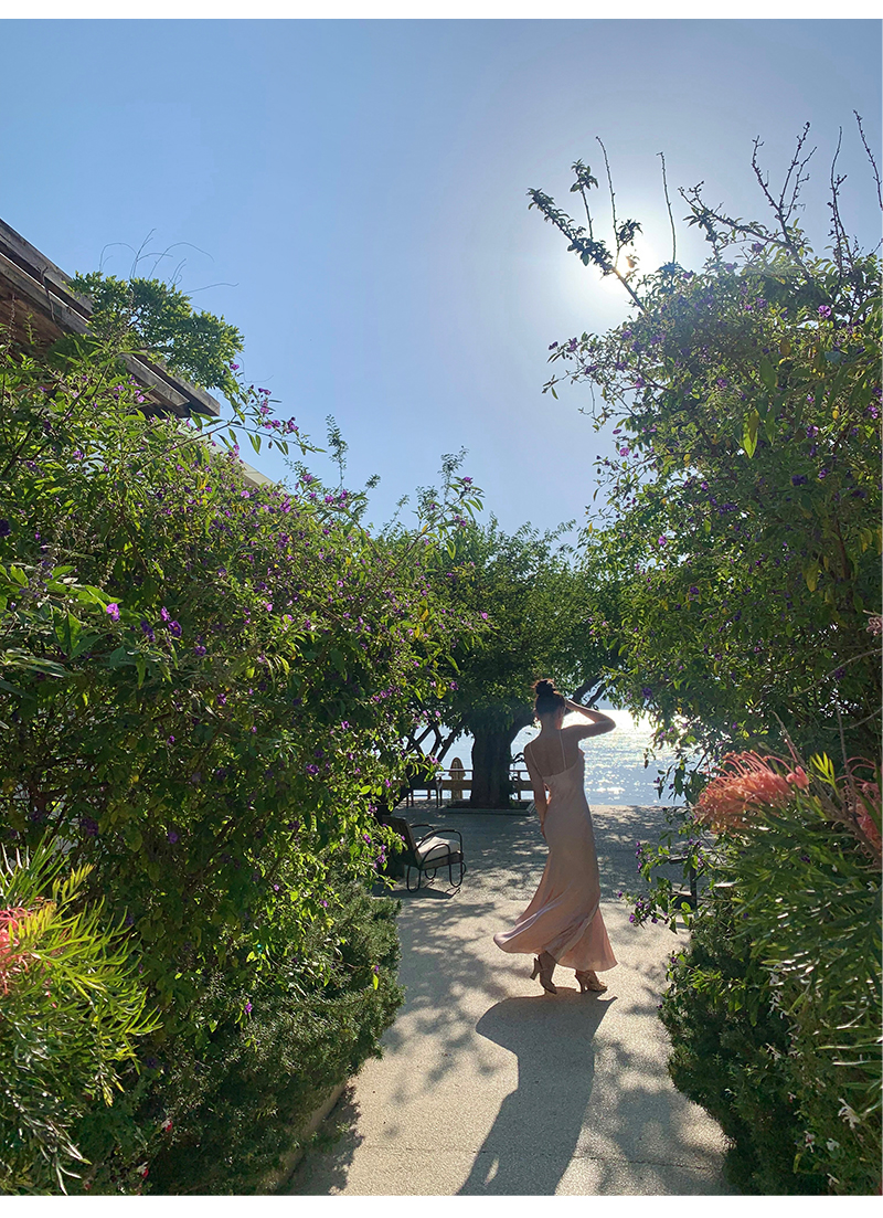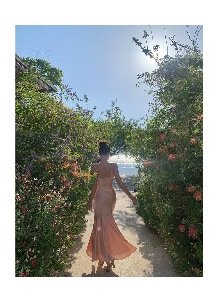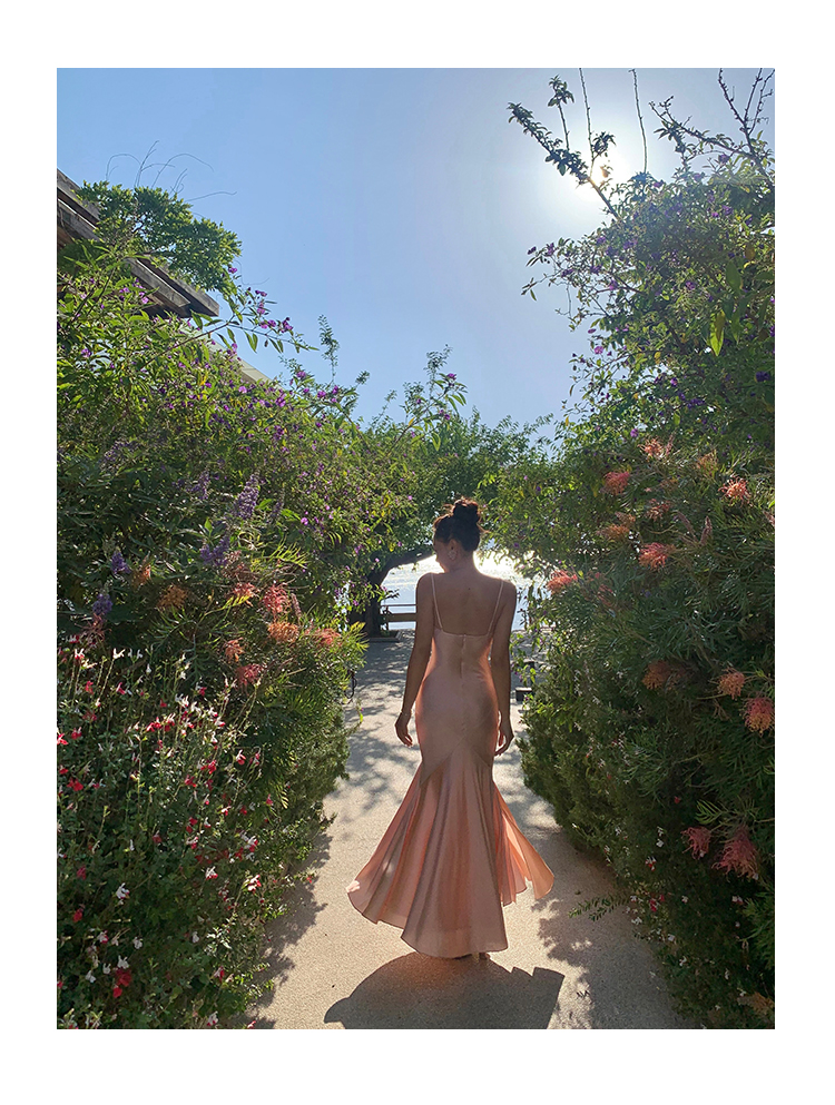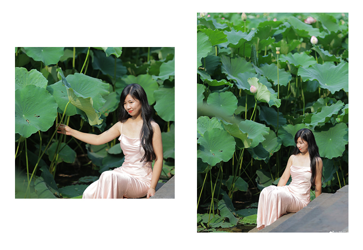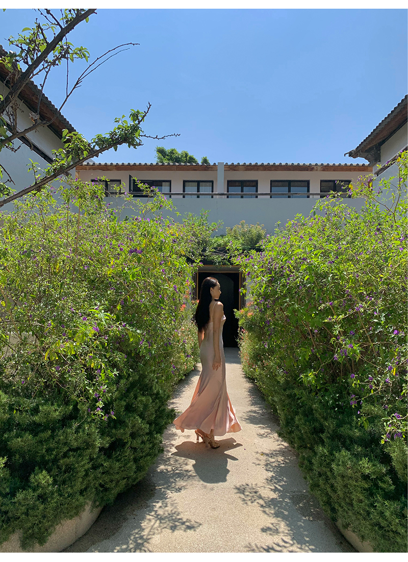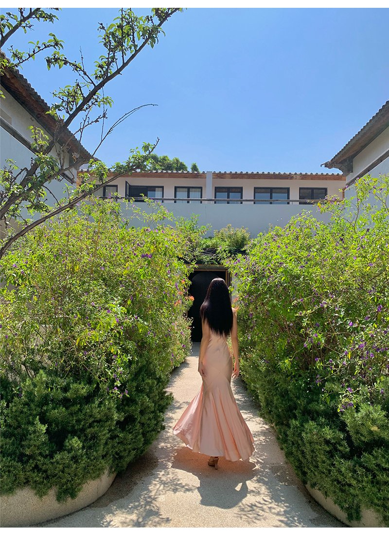 两根细细的肩带描绘肩颈线条的美好,静谧而柔和