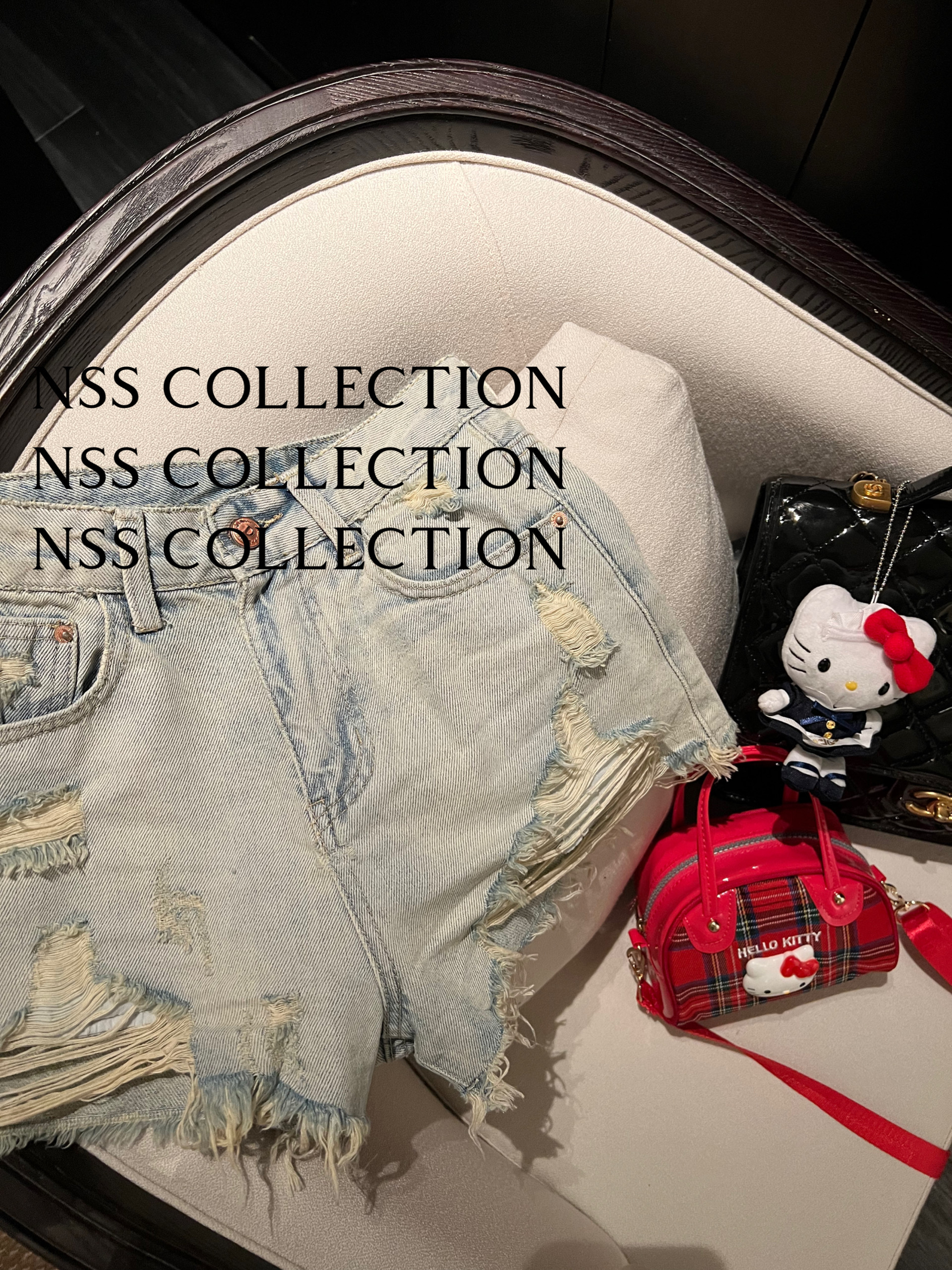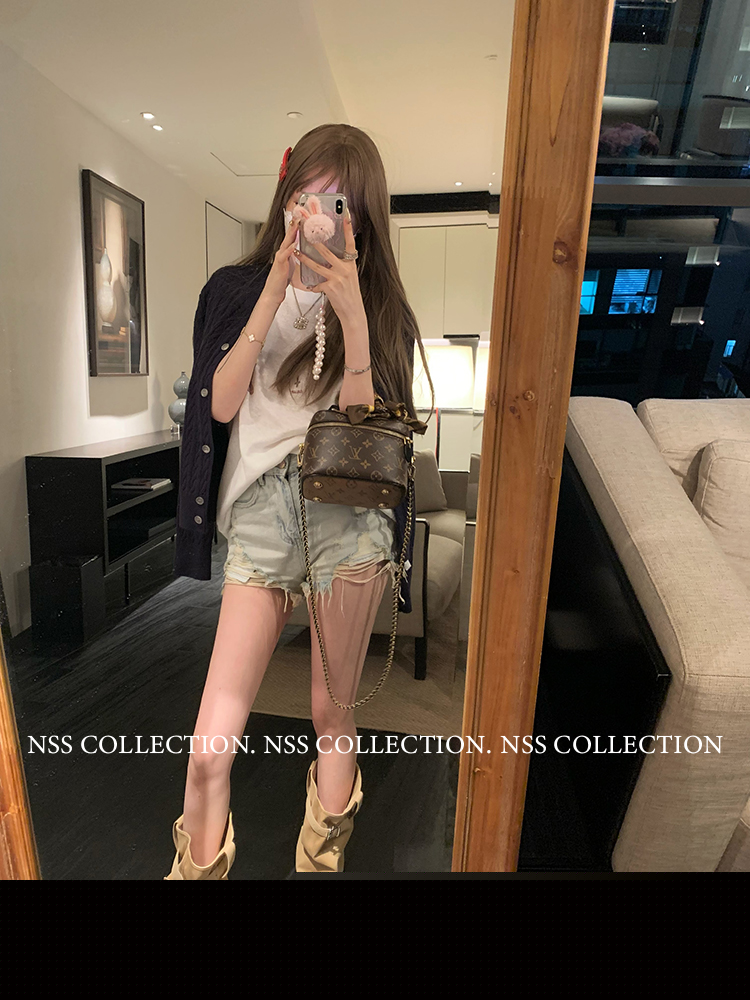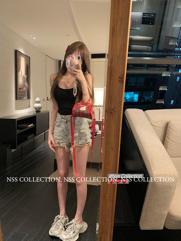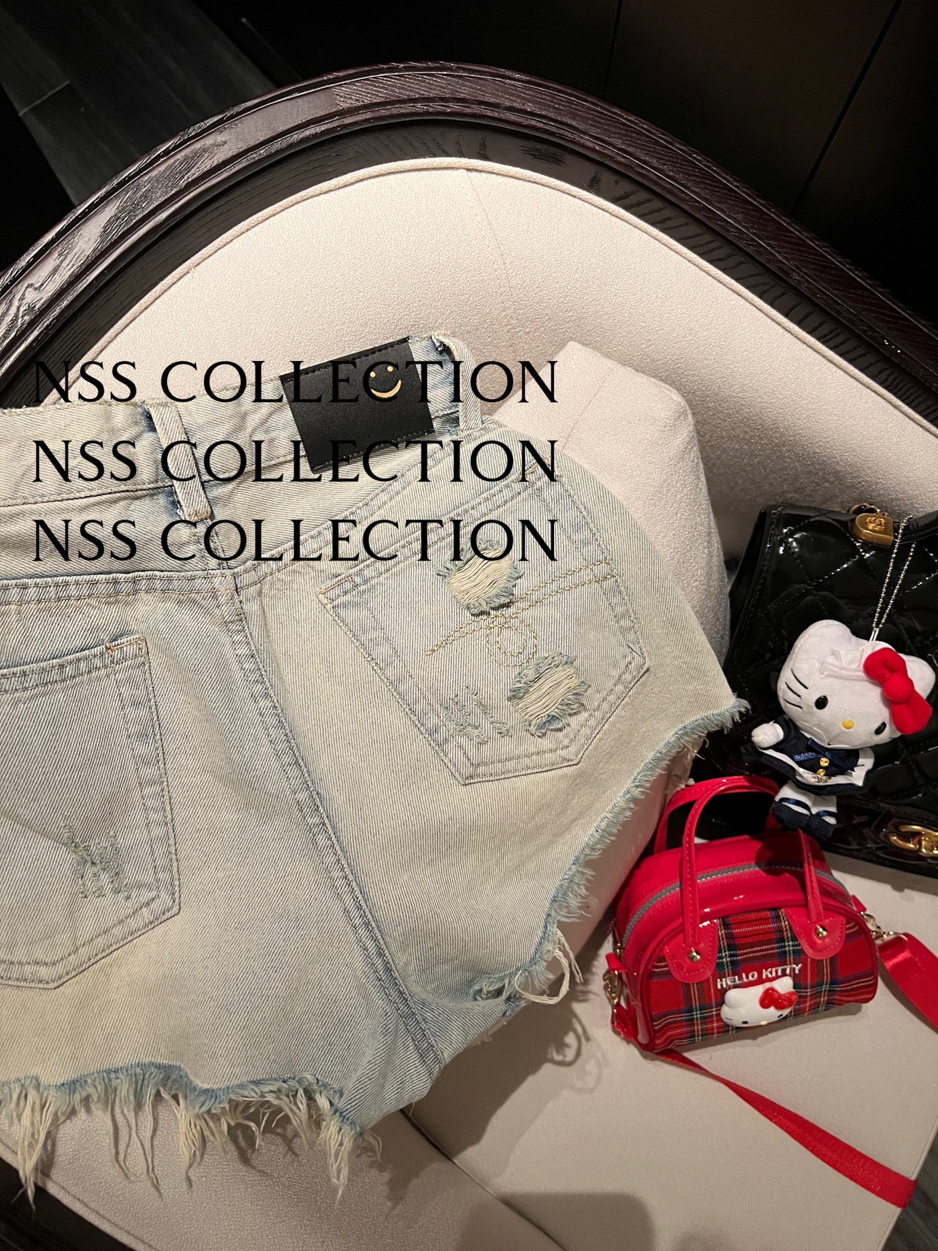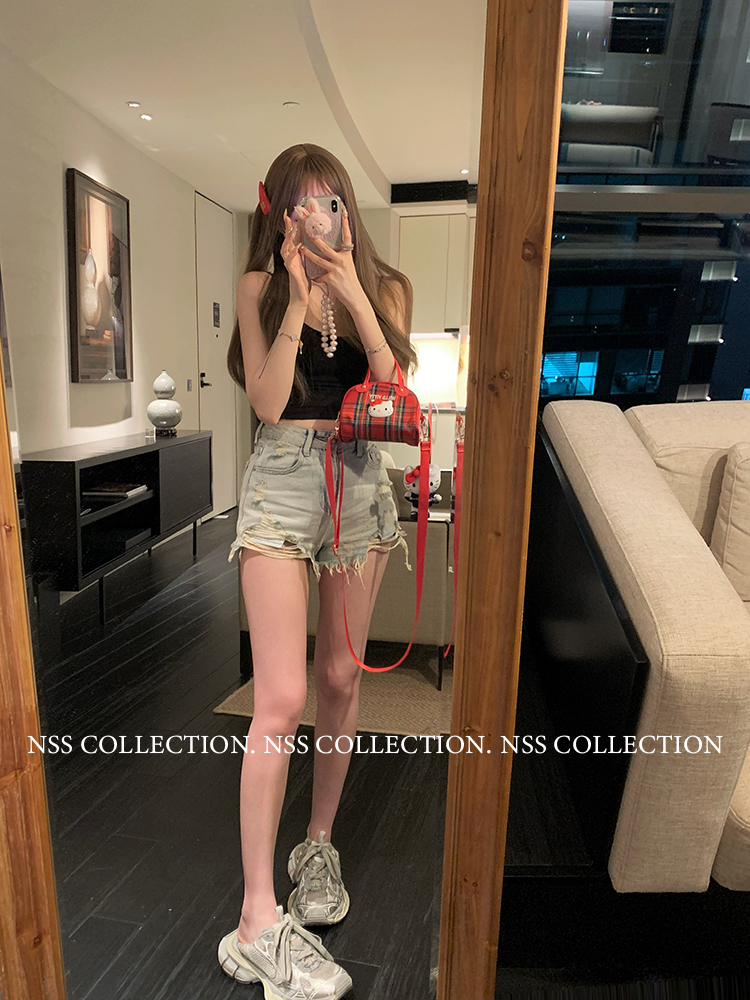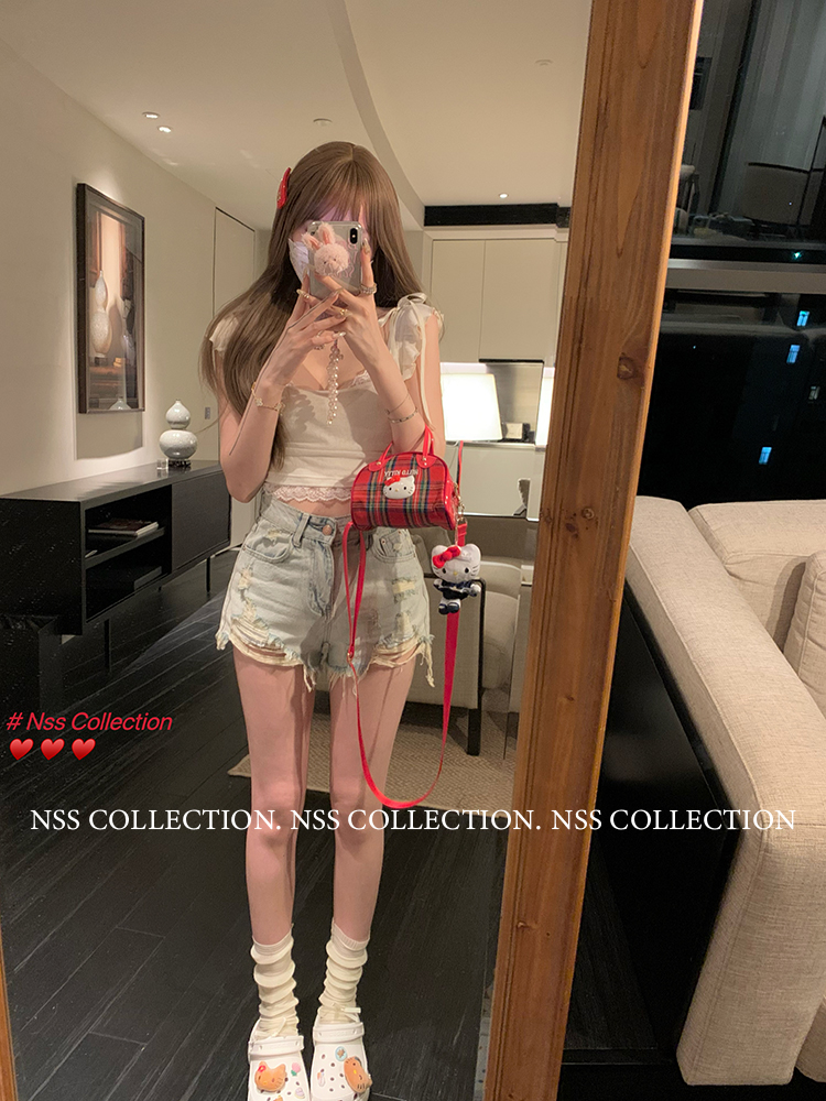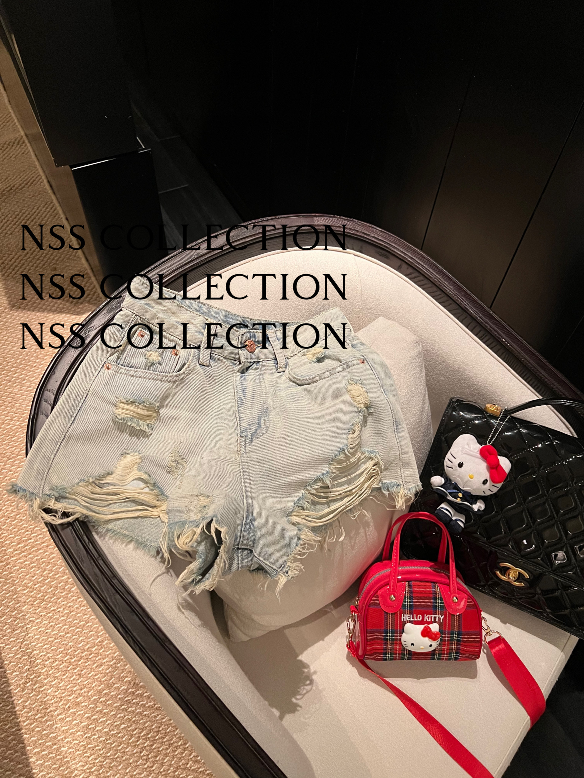NSS COLLECTION 少女腿 淺奶藍熱褲夏高腰顯瘦a字破洞牛仔短褲女