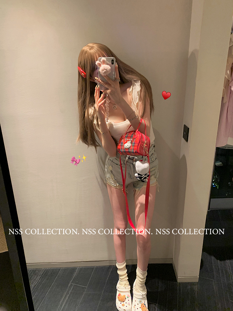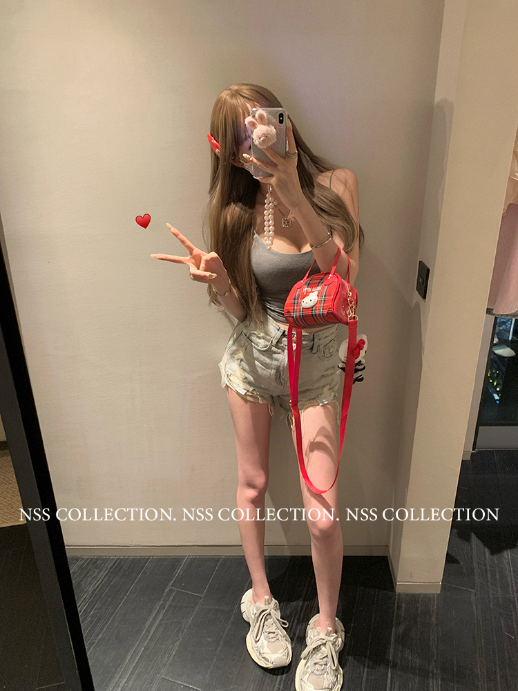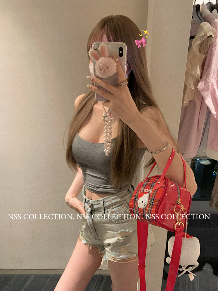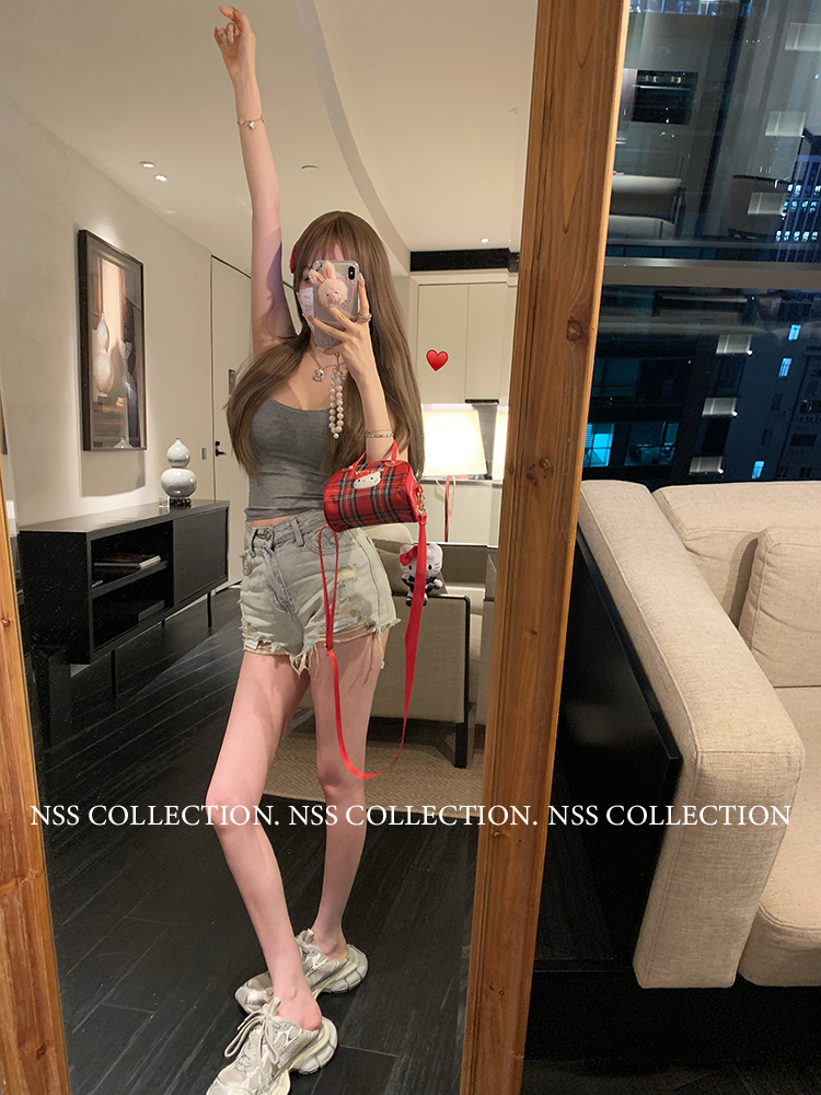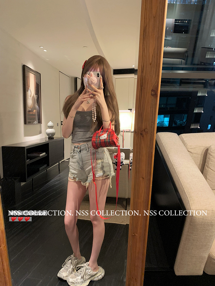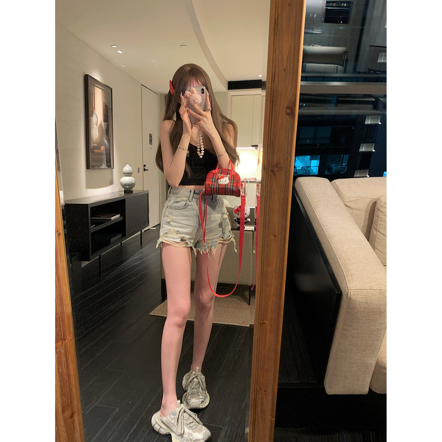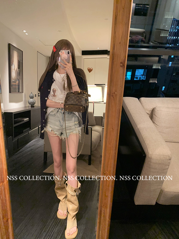 NSS COLLECTION 少女腿 淺奶藍熱褲夏高腰顯瘦a字破洞牛仔短褲女