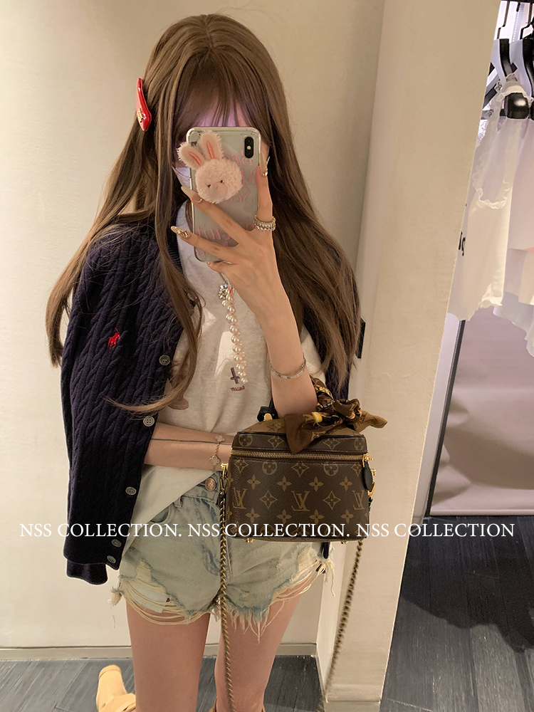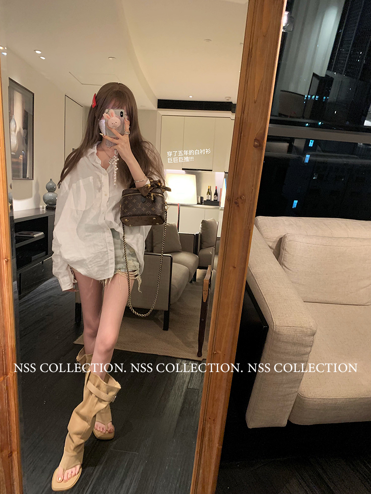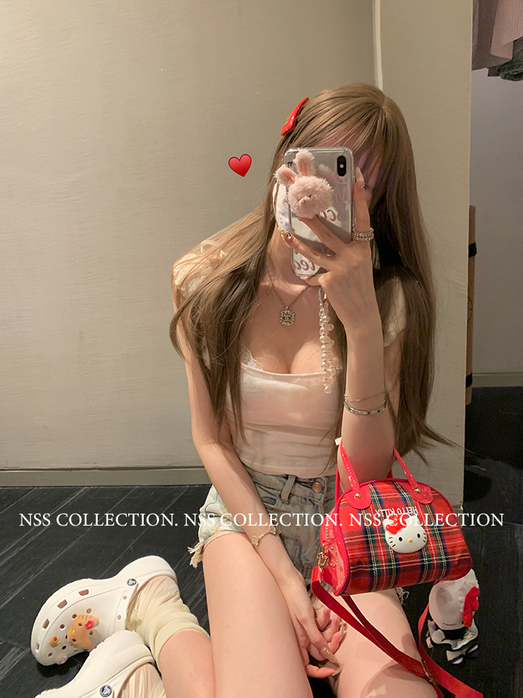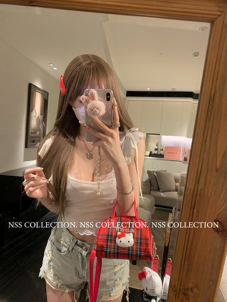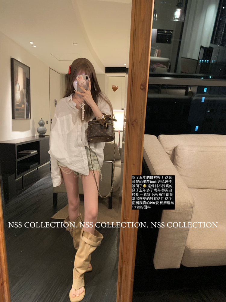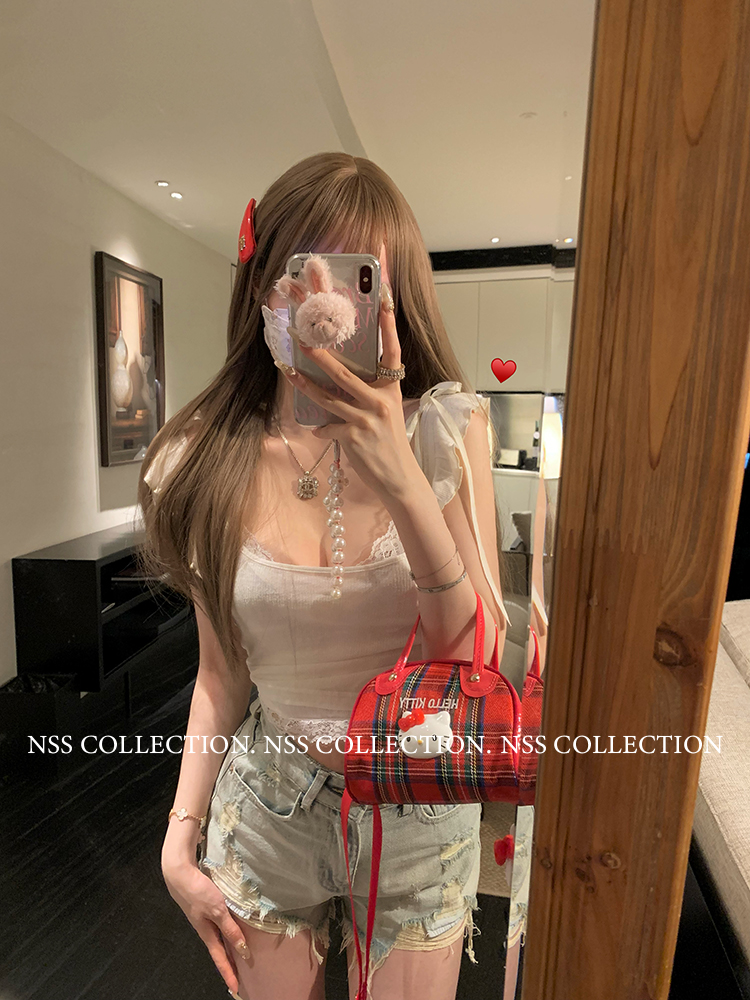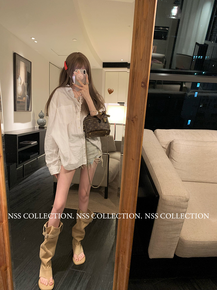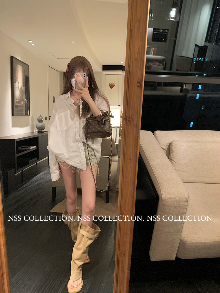 NSS COLLECTION 少女腿 淺奶藍熱褲夏高腰顯瘦a字破洞牛仔短褲女