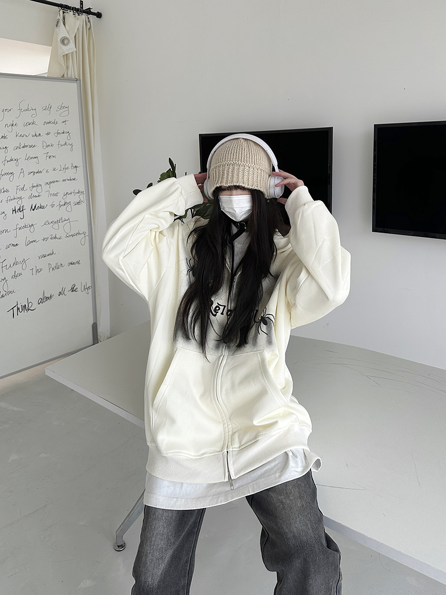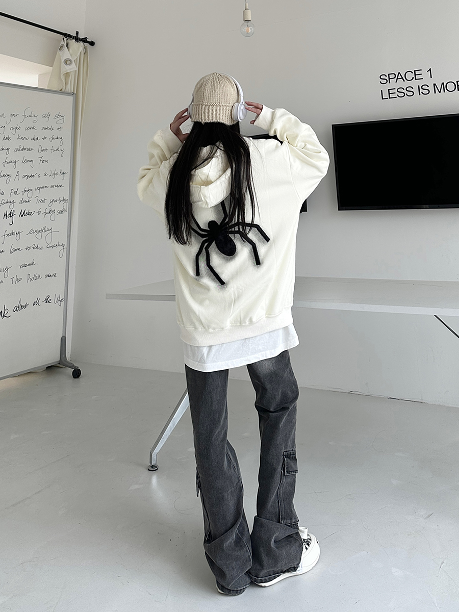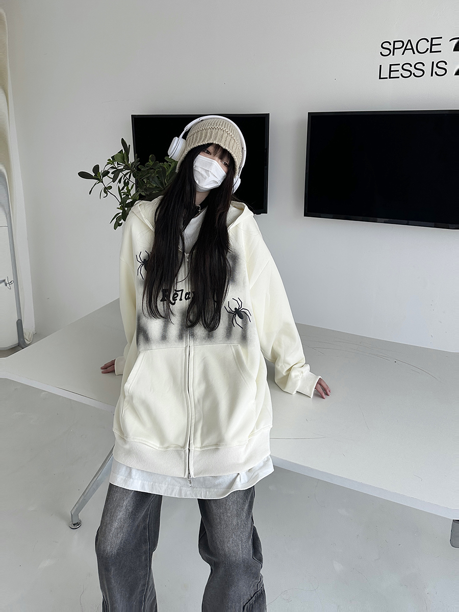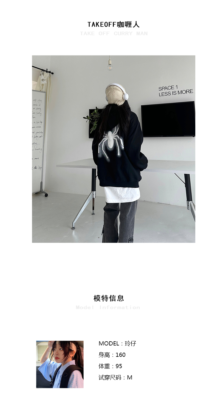 咖哩人秋新款自制蜘蛛印花開衫連帽運動衫外套美式男女情侶寬帽衫