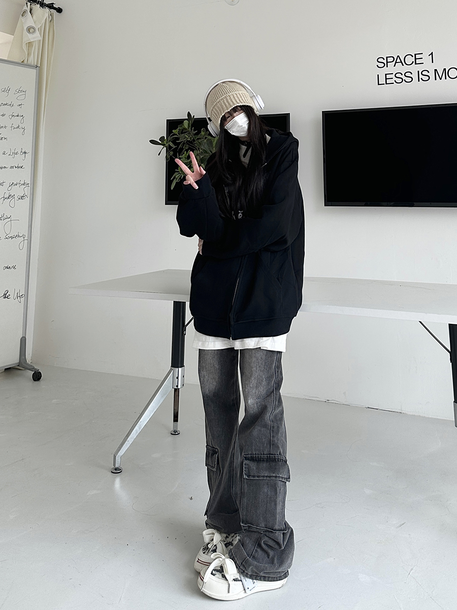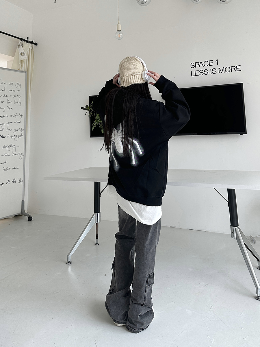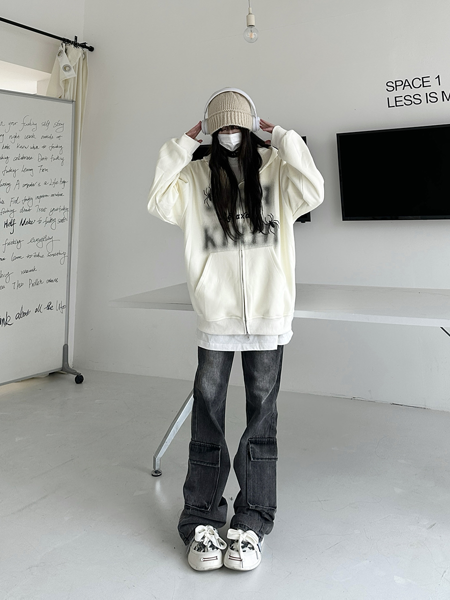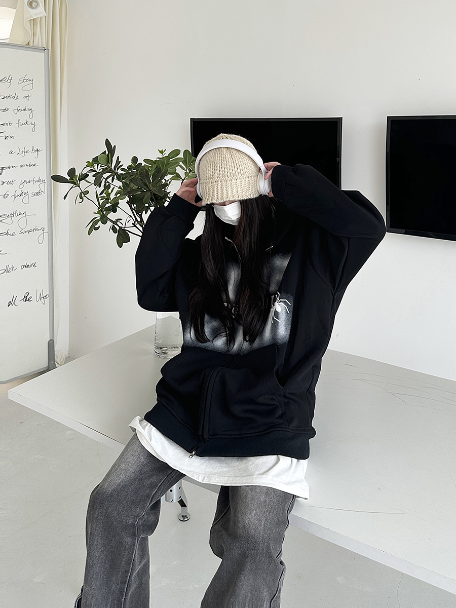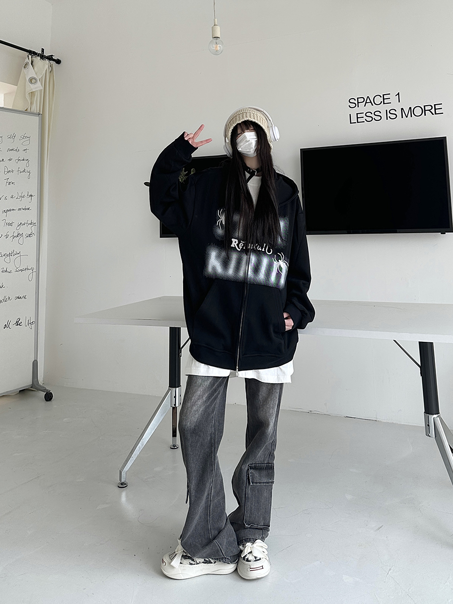 咖哩人秋新款自制蜘蛛印花開衫連帽運動衫外套美式男女情侶寬帽衫