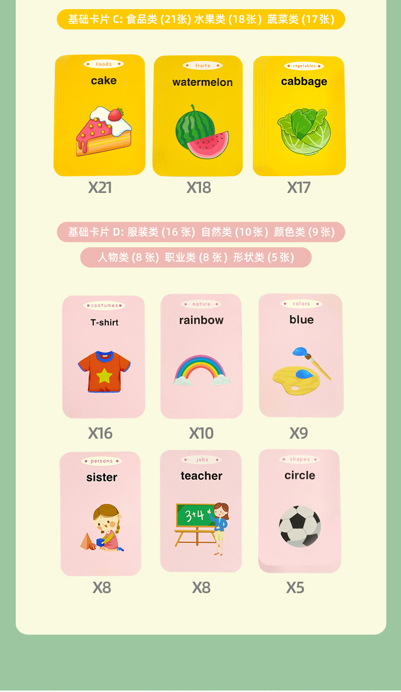 水果类18个内容,蔬菜类17个内容