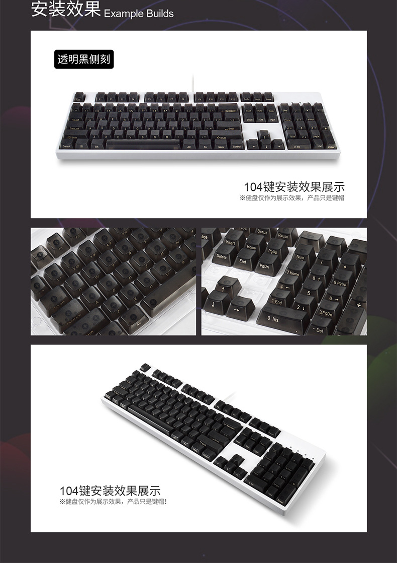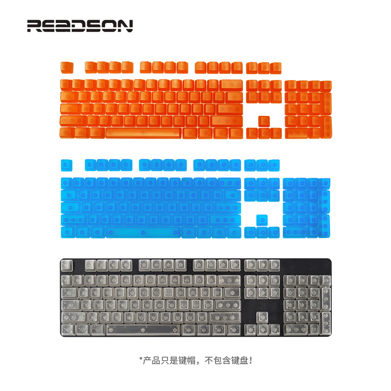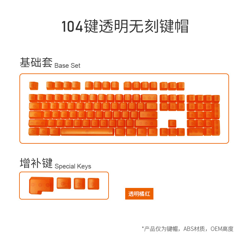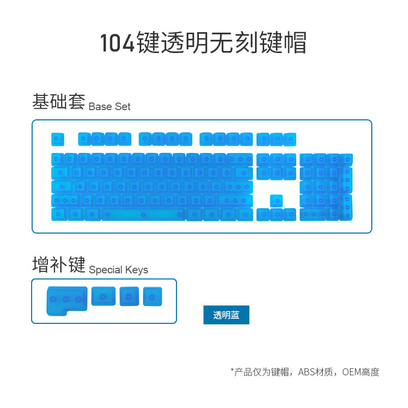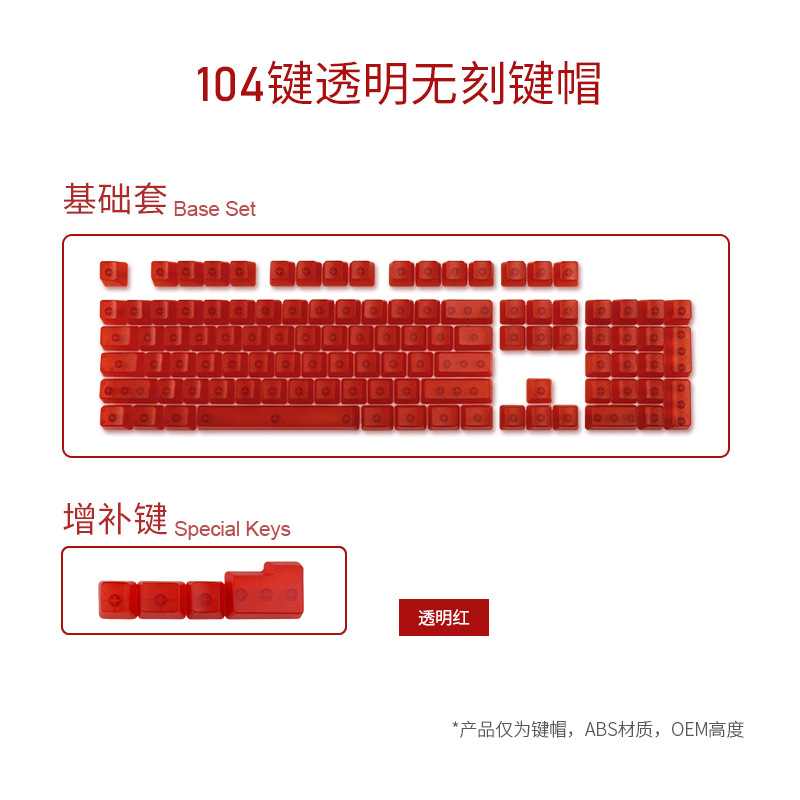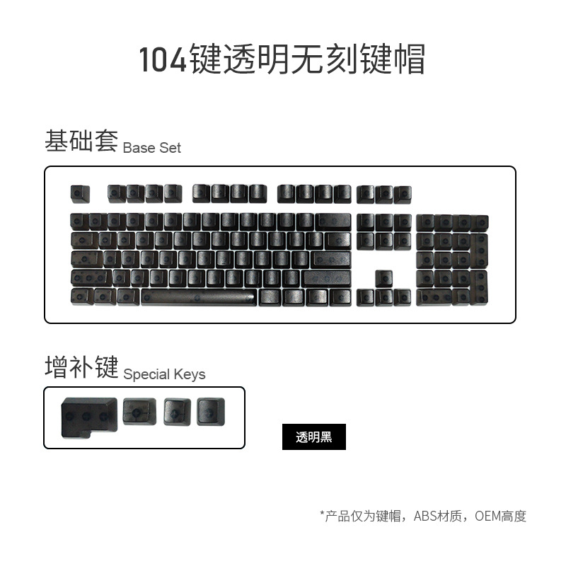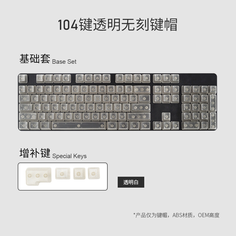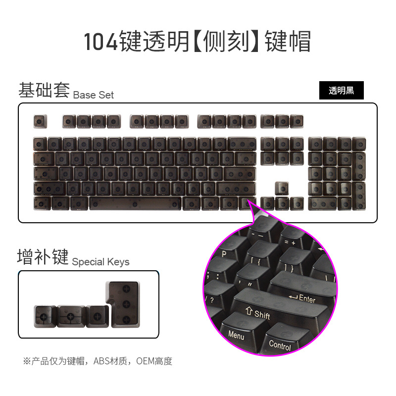产品特点 透明键帽/OEM高度/正刻/侧刻/104键位/