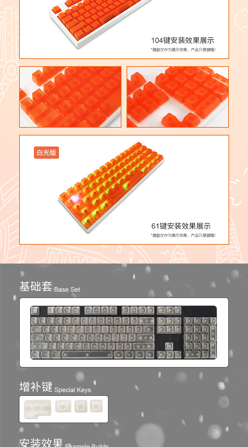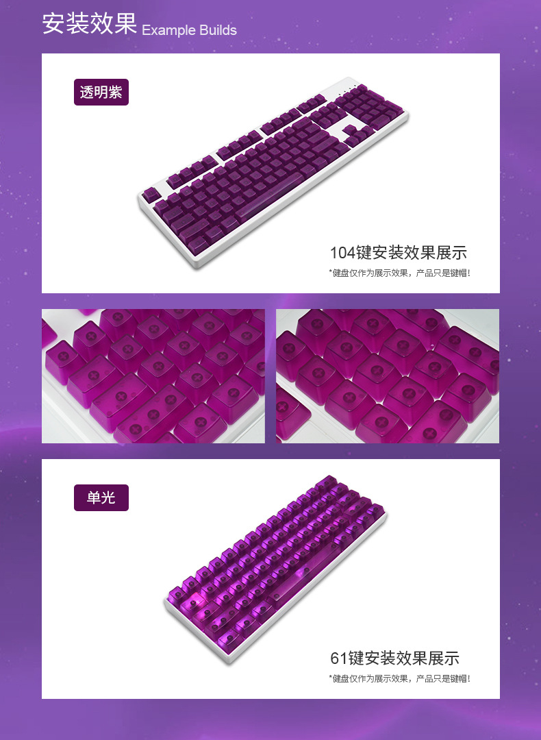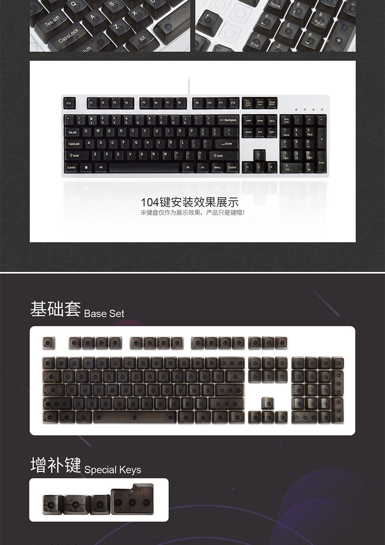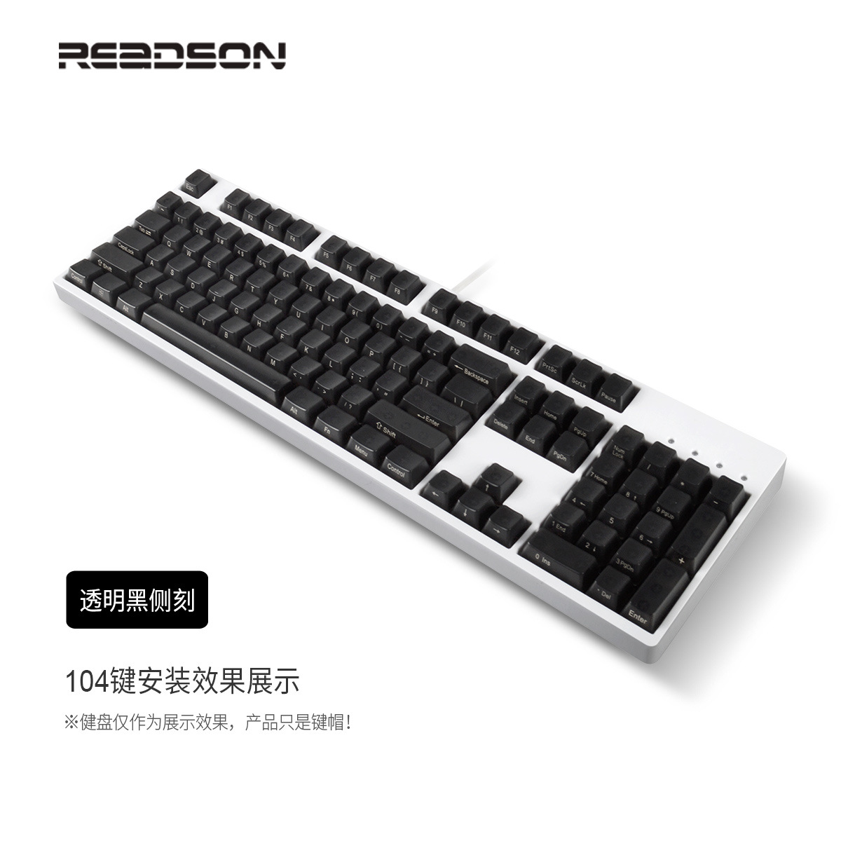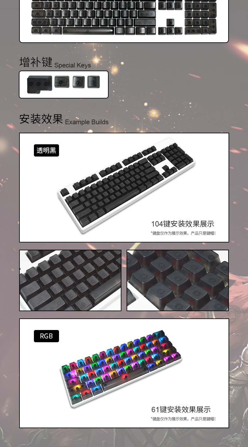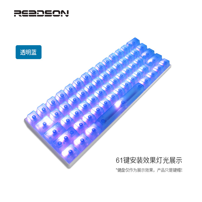 产品特点 透明键帽/OEM高度/正刻/侧刻/104键位/