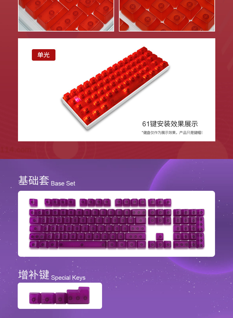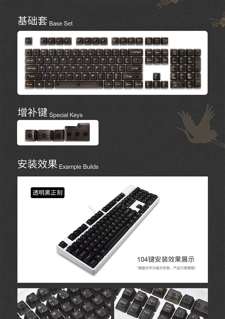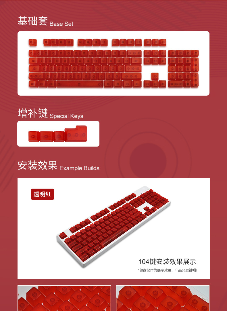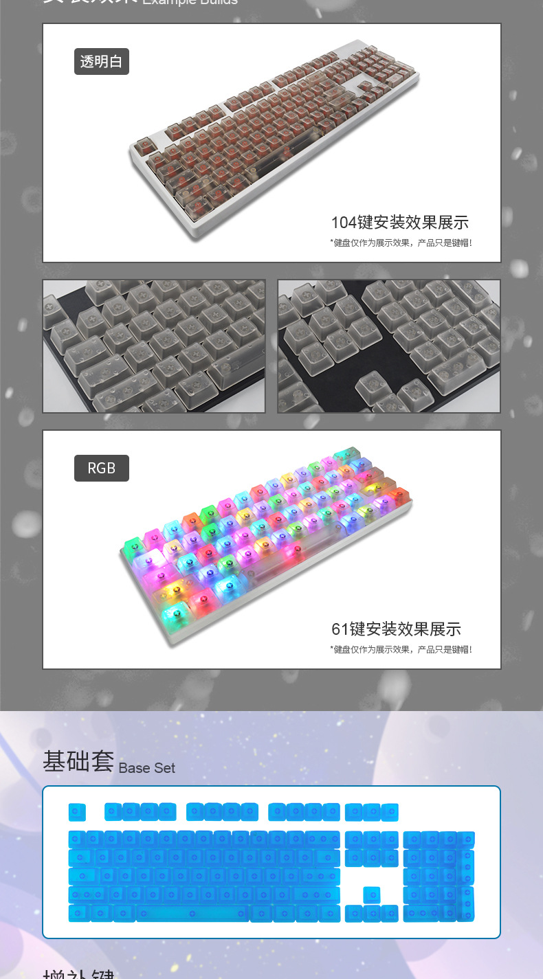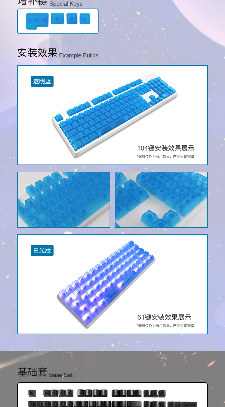 产品特点 透明键帽/OEM高度/正刻/侧刻/104键位/