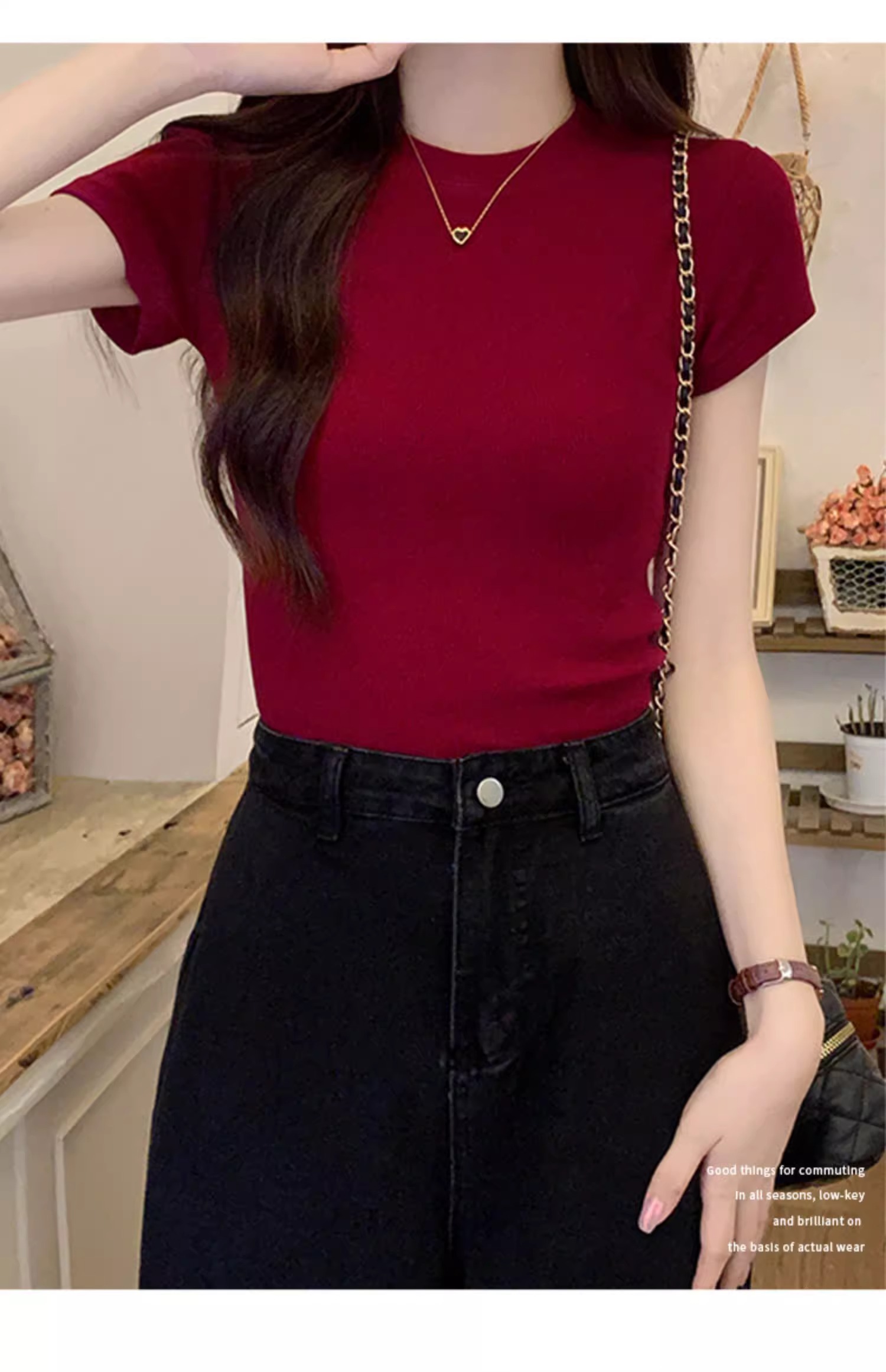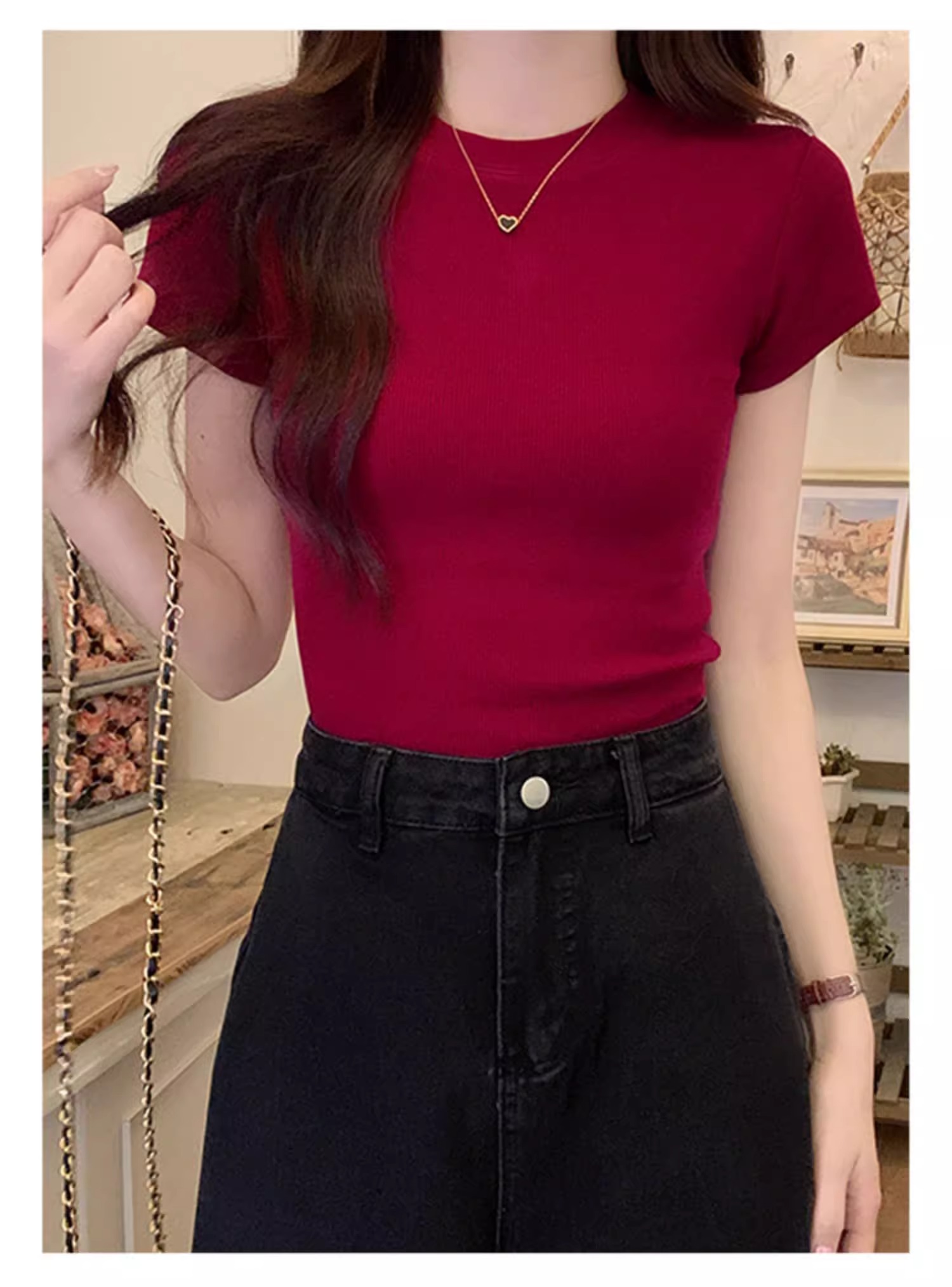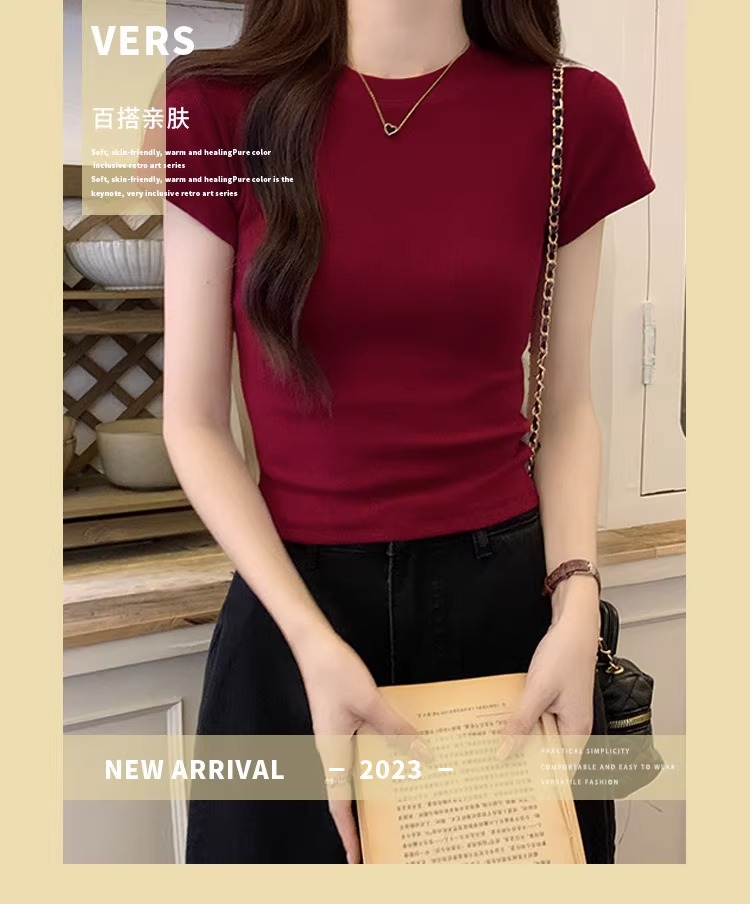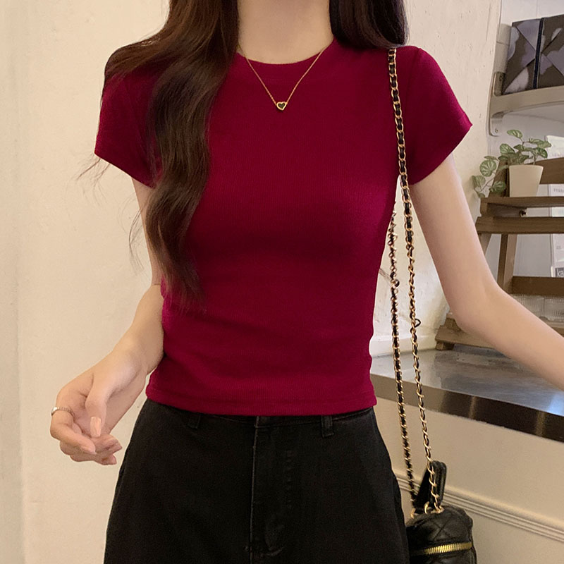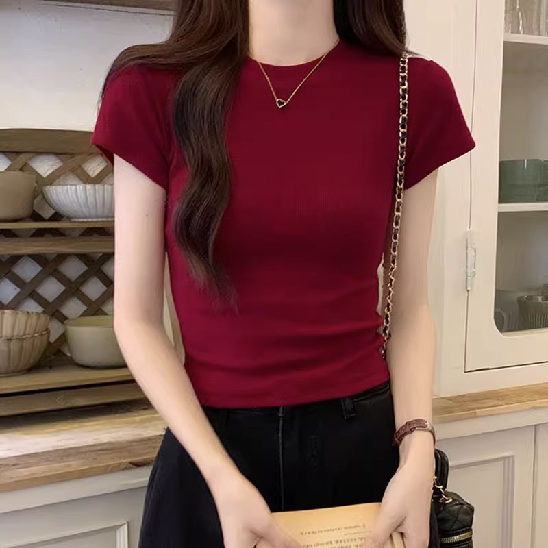 酒紅色正肩T恤女螺紋彈力純欲緊身短袖夏季美式辣妹顯瘦上衣ins潮