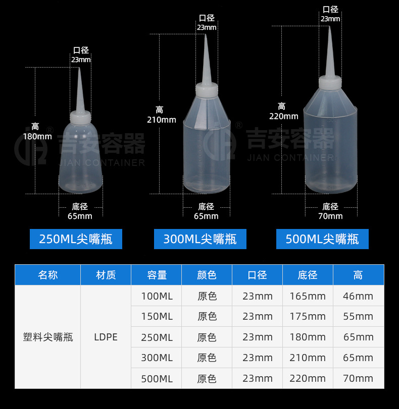 规格 100ML尖嘴瓶,250ML尖嘴瓶,500ML尖嘴瓶,300ML尖嘴瓶