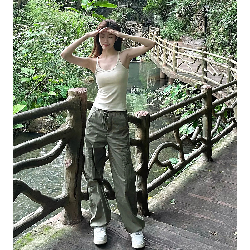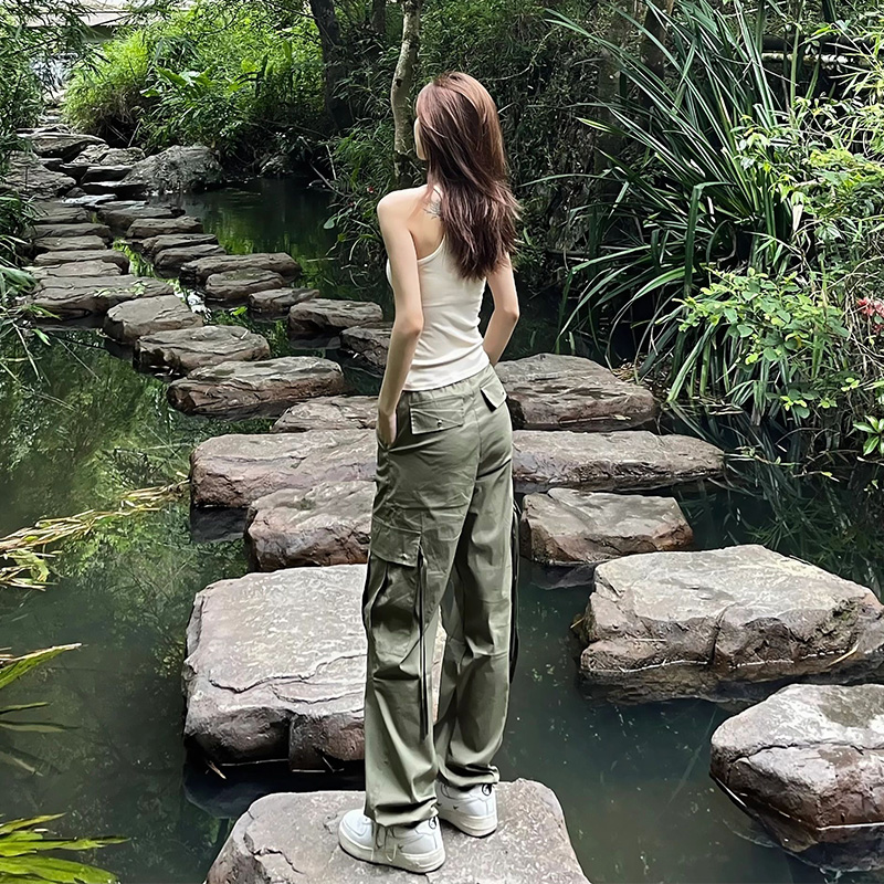 軍綠色速乾美式高街工裝褲寬鬆運動褲女男高腰顯瘦闊腿褲子秋潮牌