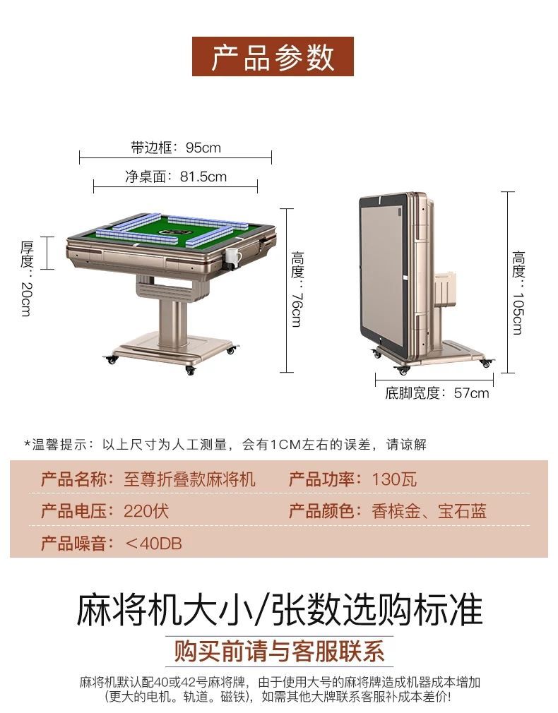 颜色 折叠款+原装烟灰缸香槟金,折叠款+原装烟灰缸咖啡色,折叠款+原装烟灰缸深酒红,折叠款(带餐桌盖板)-香槟色,折叠款(带餐桌盖板)-深酒红,折叠款(带餐桌盖板)-尊贵蓝,风暖一体折叠款-香槟色,风暖一体折叠款-深酒红,风暖一体(带餐桌盖板)-香槟色,电动折叠(带餐桌盖板)-香槟色,贵宾五件套(带四把椅子),裸机机芯(不带麻将不带边框)