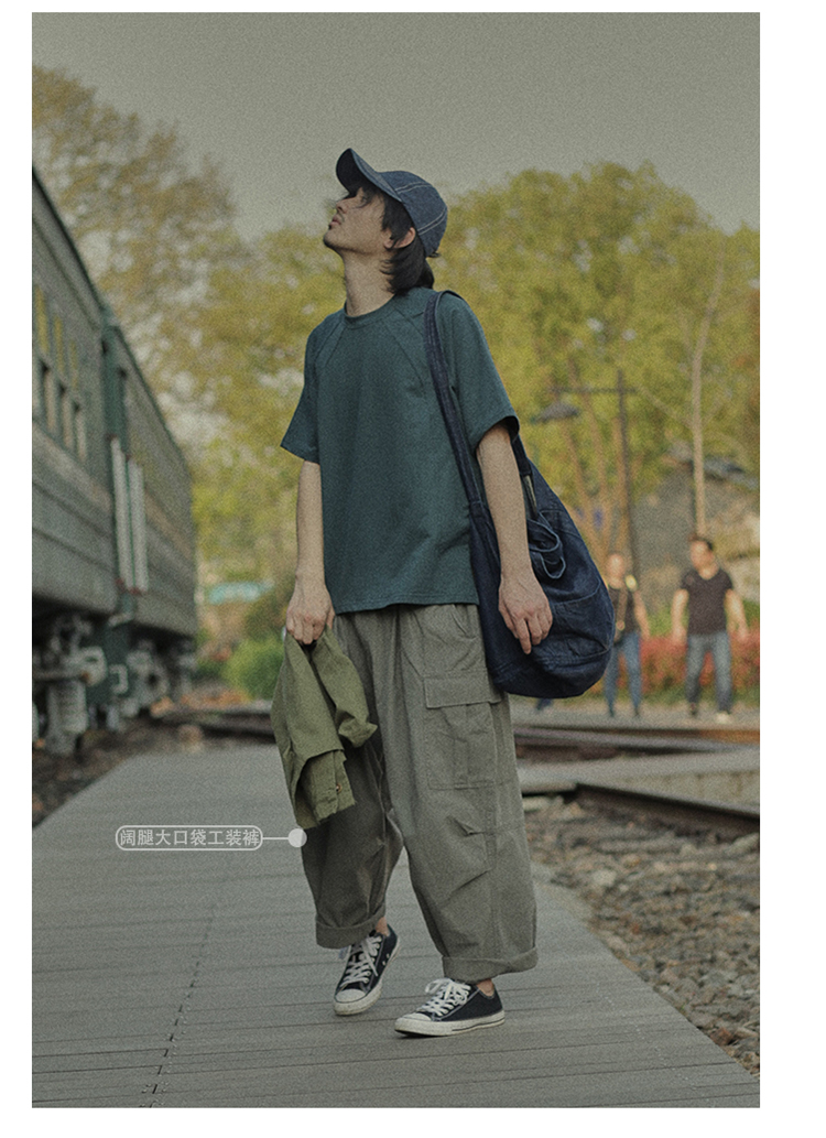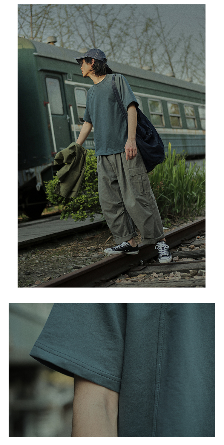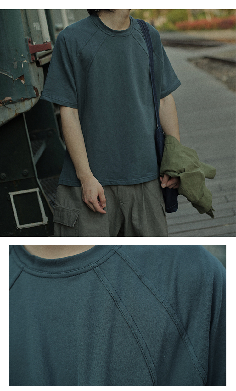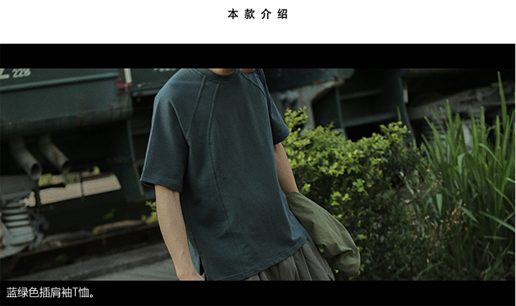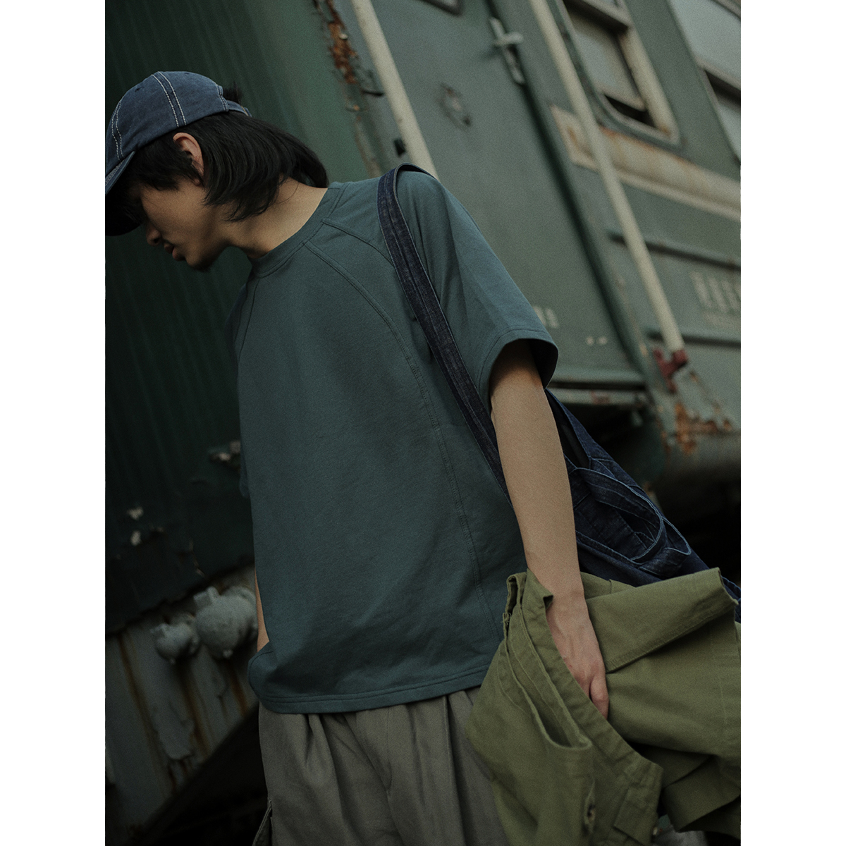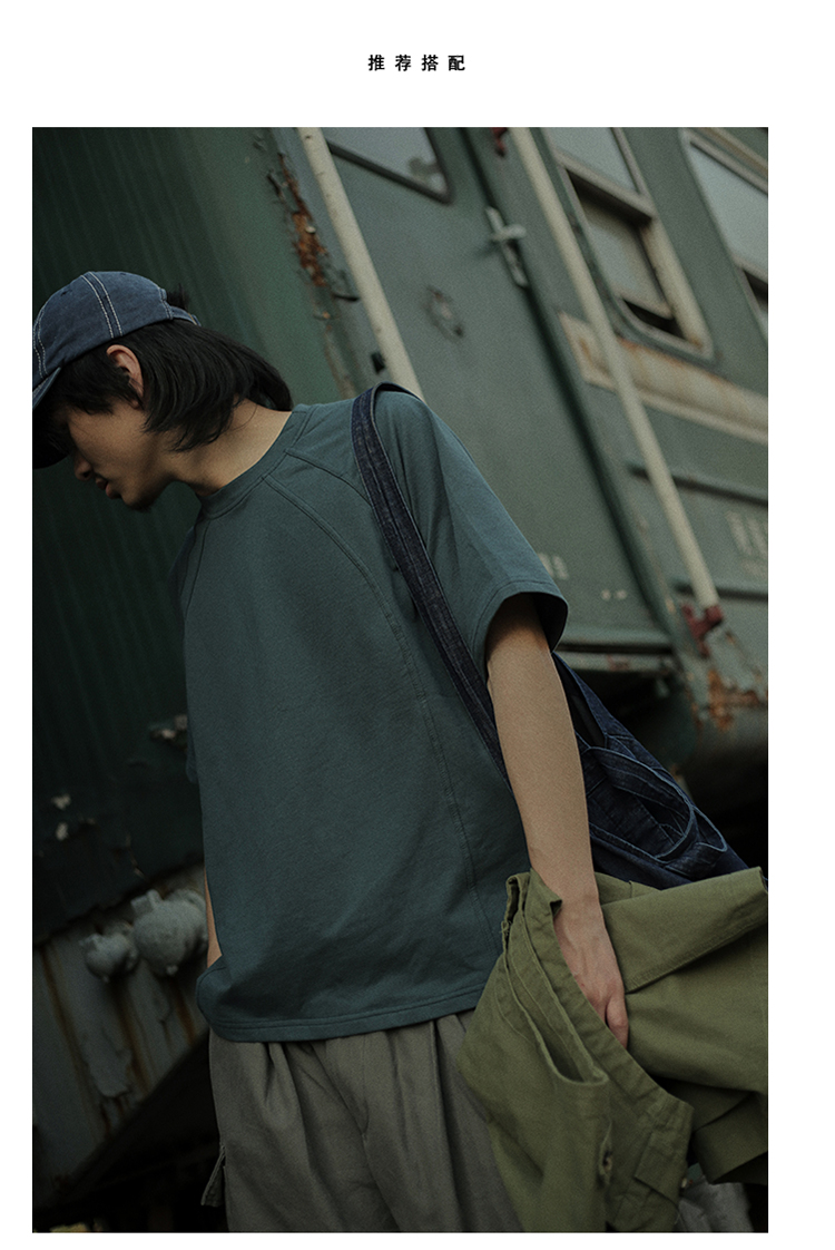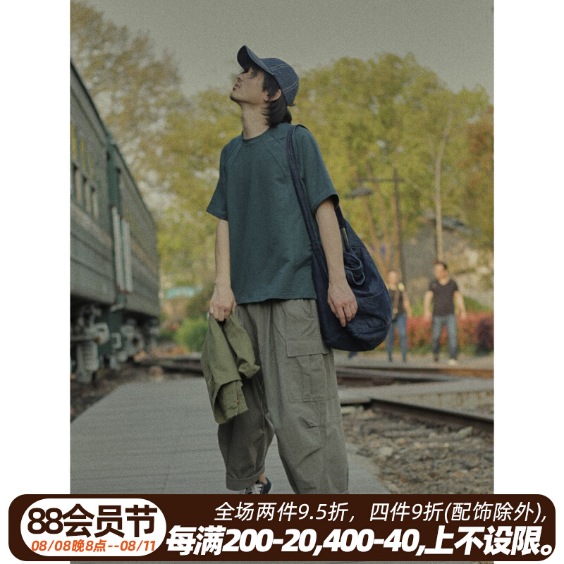 危機青年 復古藍綠色寬鬆短袖T恤男簡約純色夏季日系基礎款半袖潮