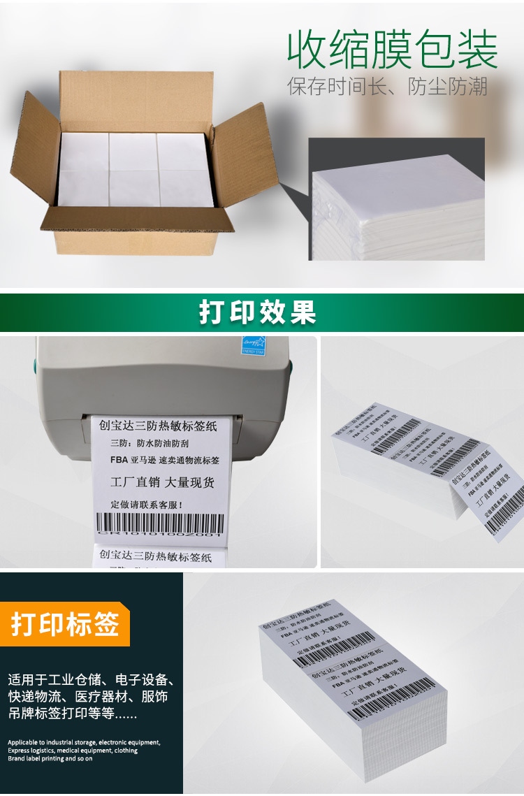 适合不同气候地区使用,适用于亚马逊FBA、邮政国际物流标签、邮政包裹、EBAY、速卖通、递四方、EUB标签纸、电商专用标签等