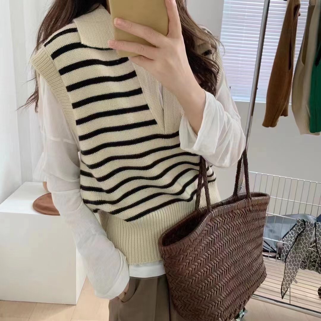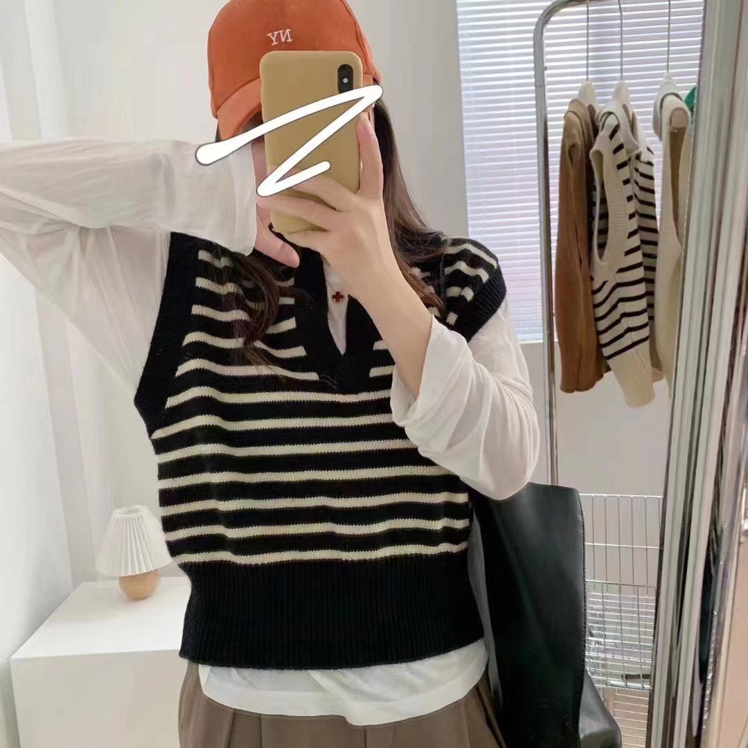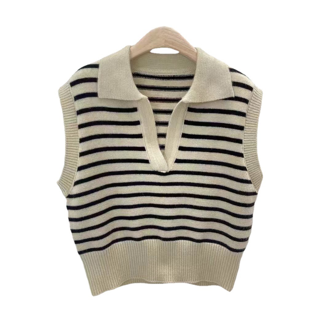 条纹翻领针织2023秋季新款拼色短款马甲韩系宽松坎肩外搭背心毛衣