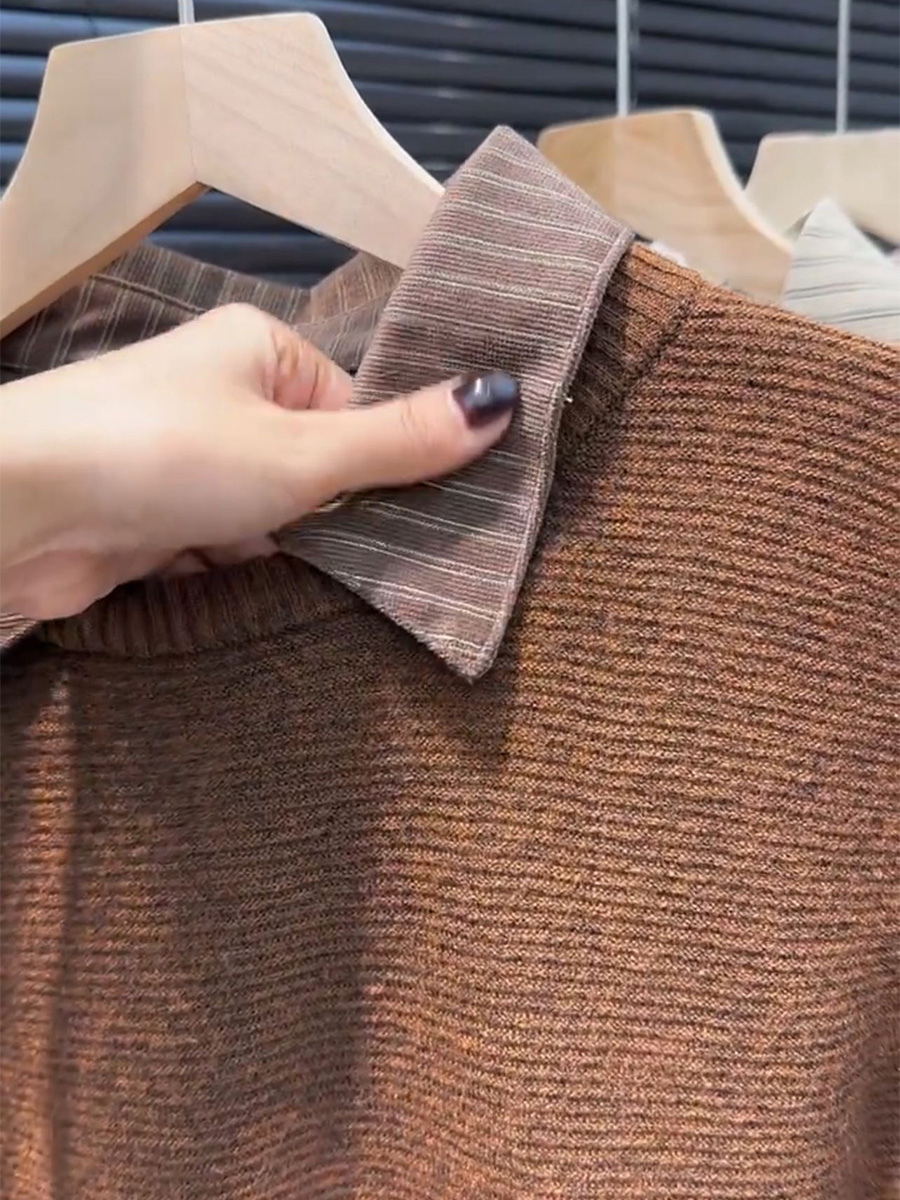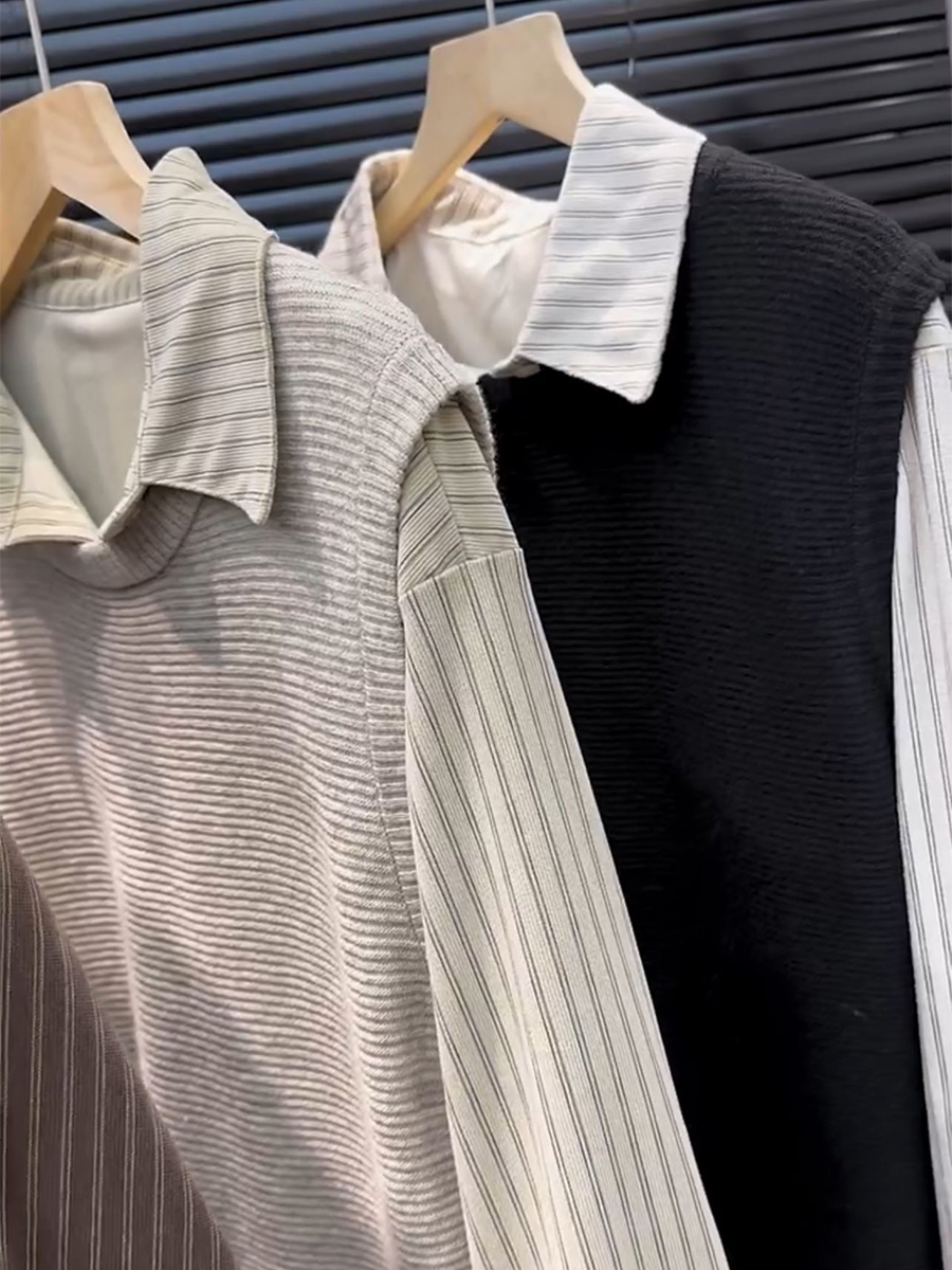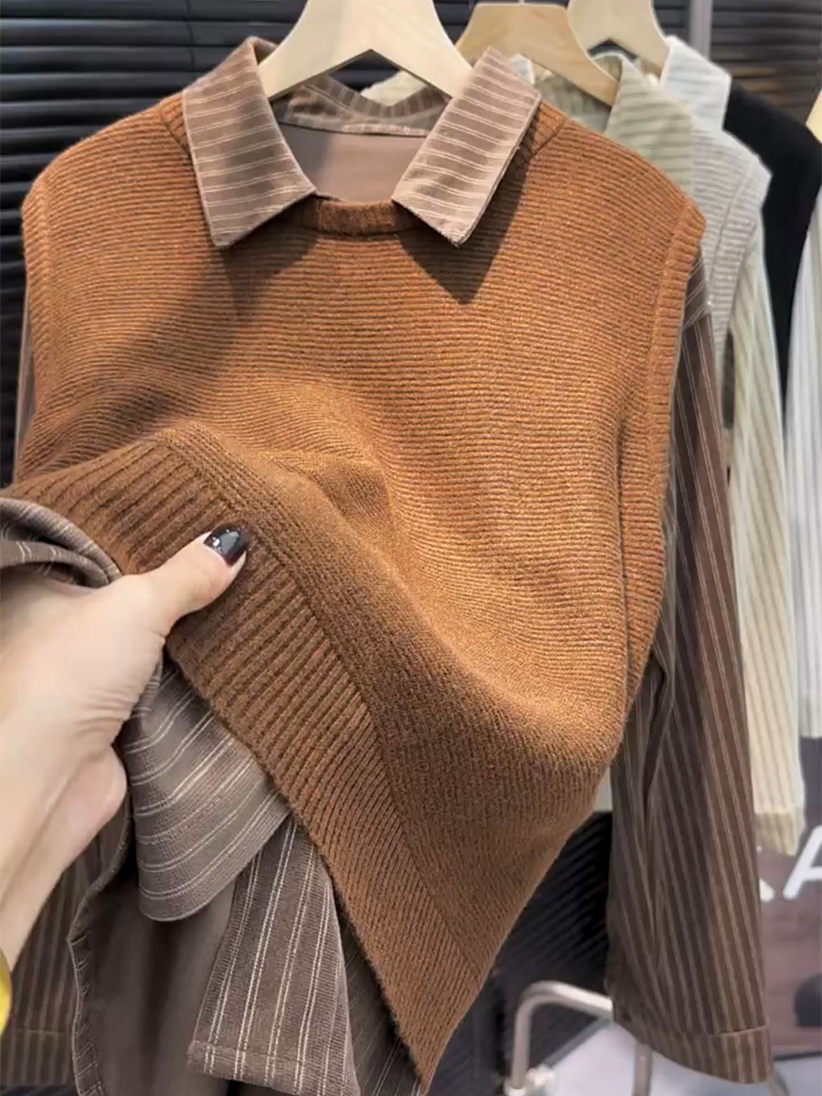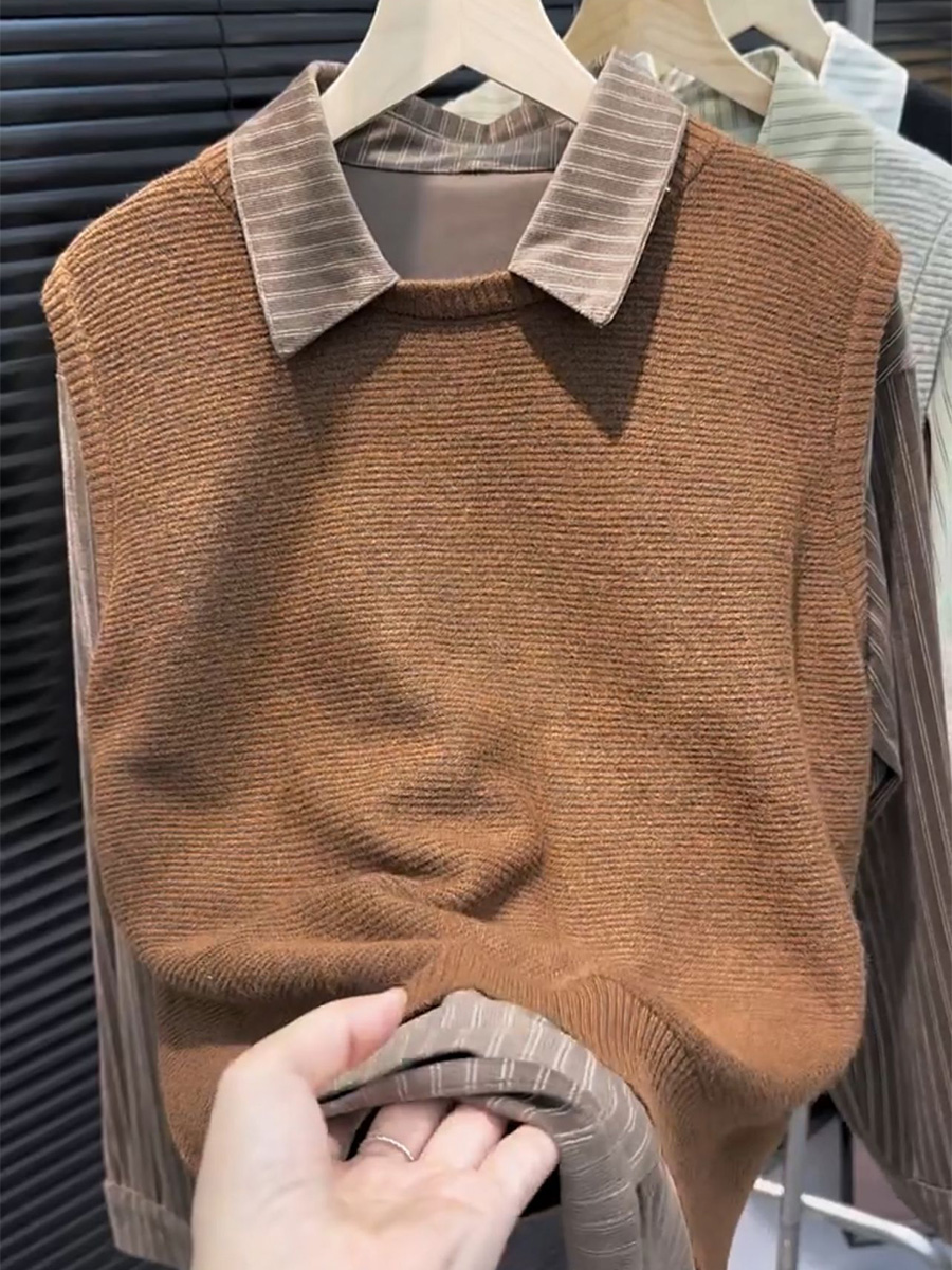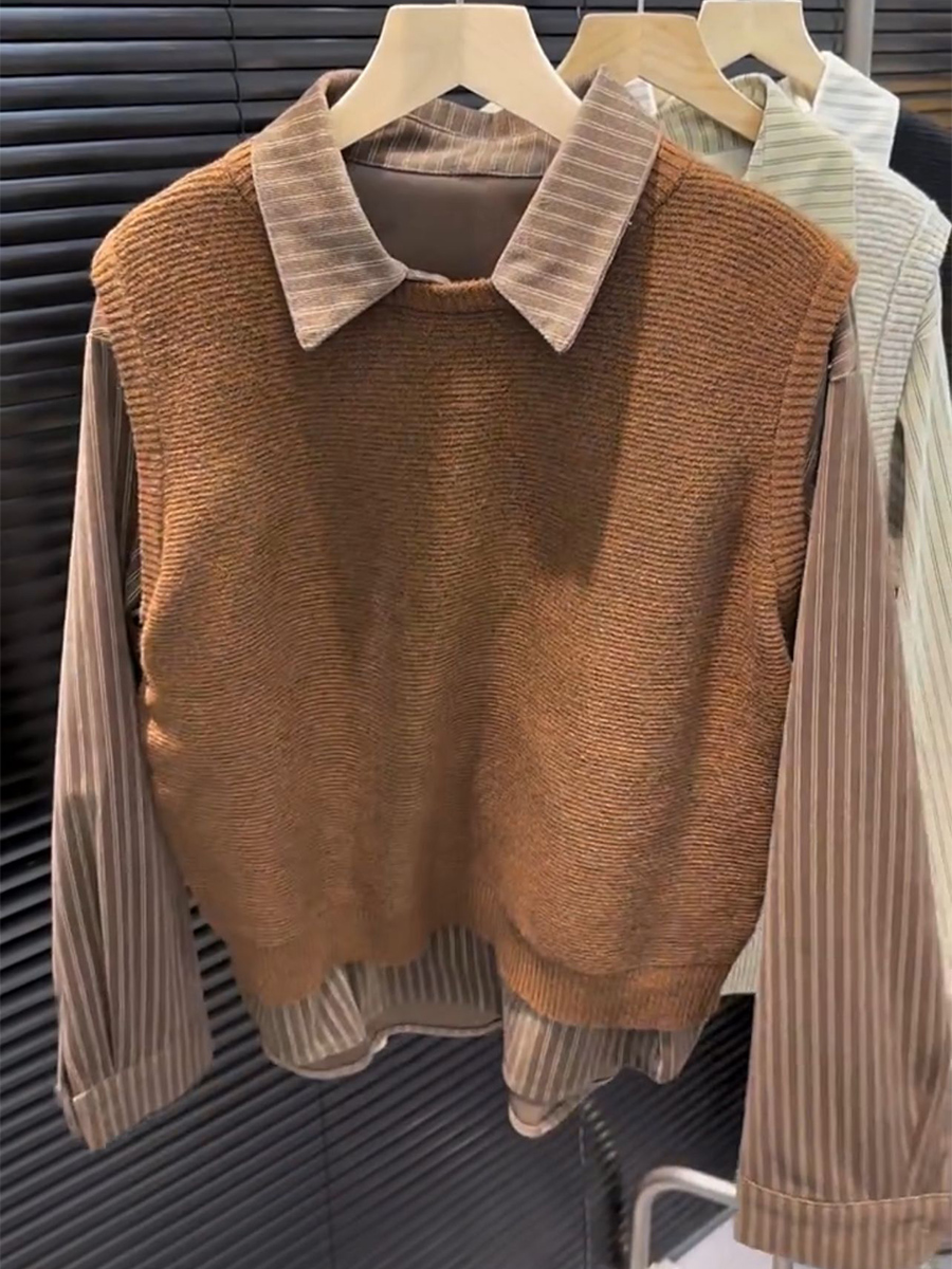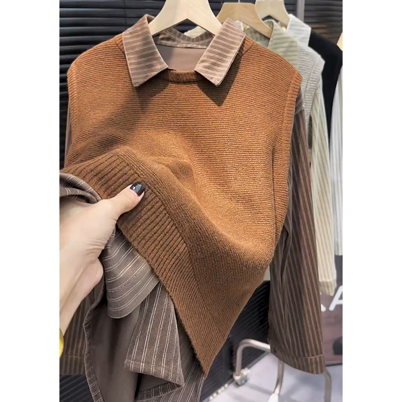 今年流行秋冬新款港風復古磨毛刷條紋襯衫女毛衣馬甲疊穿套裝兩件套