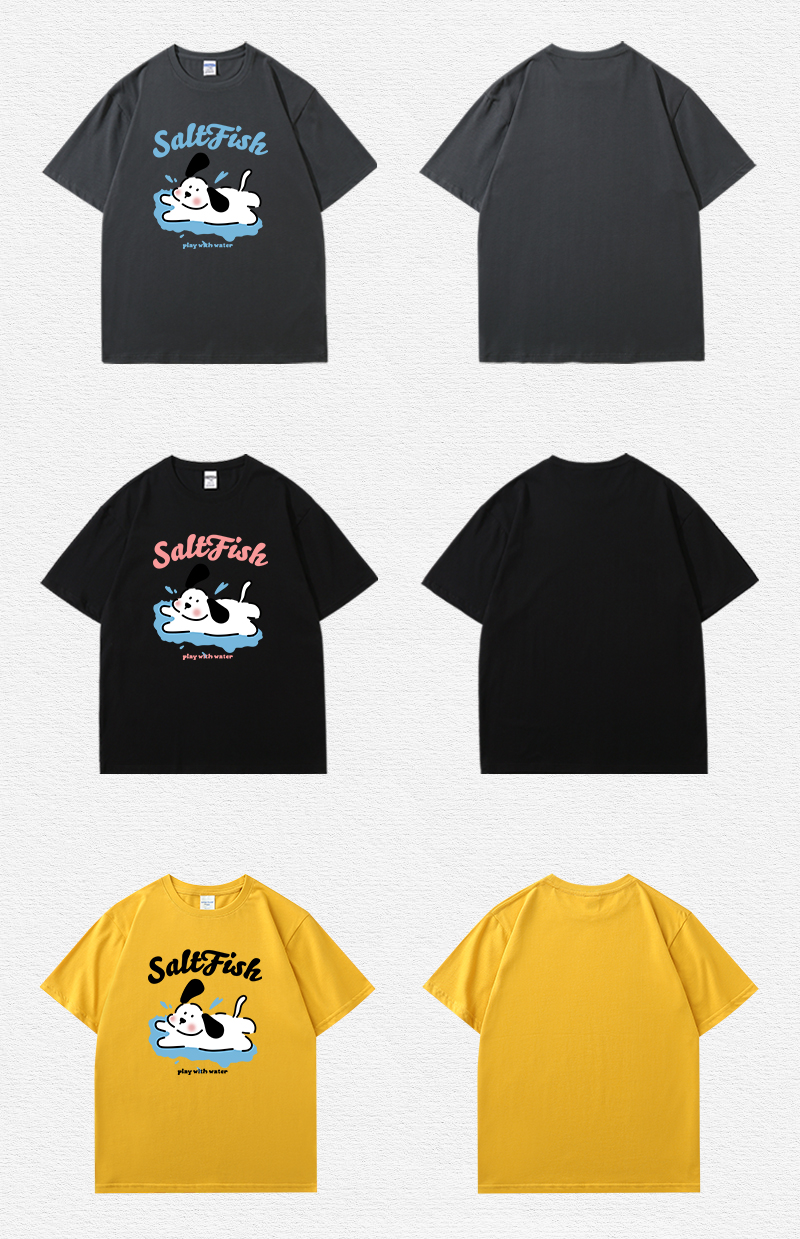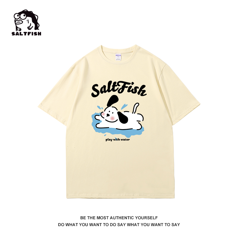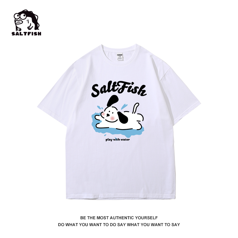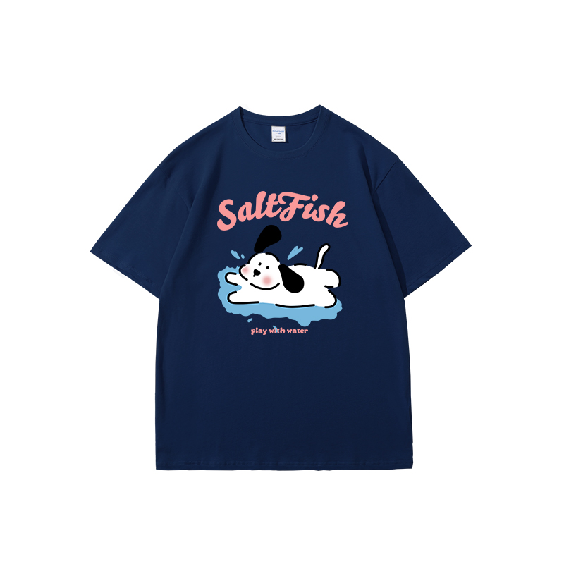 SALT玩水小狗印花短袖藏青色T恤女夏季卡通ins風寬鬆休閒情侶上衣