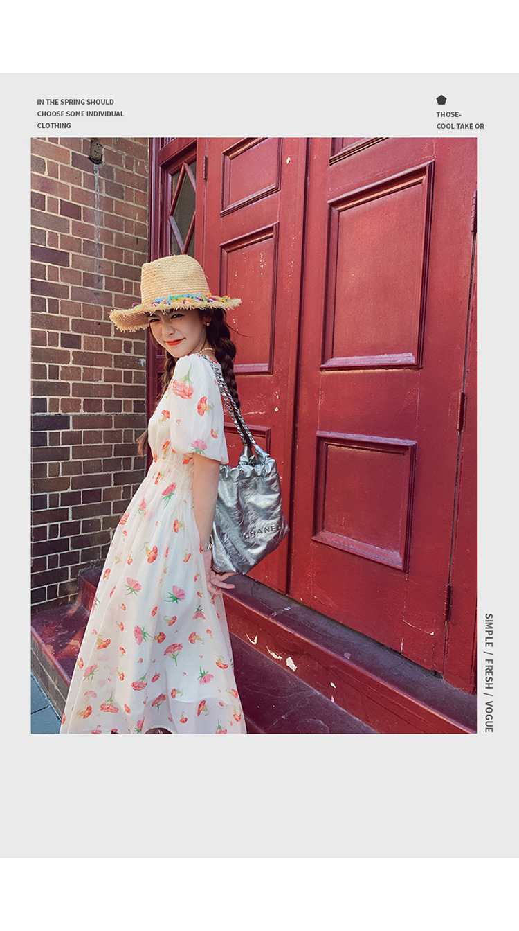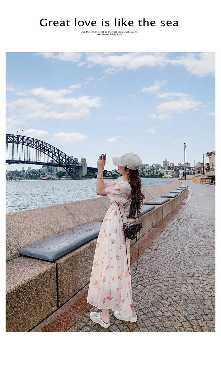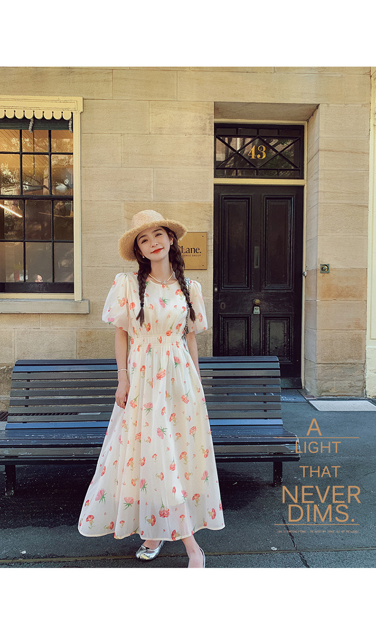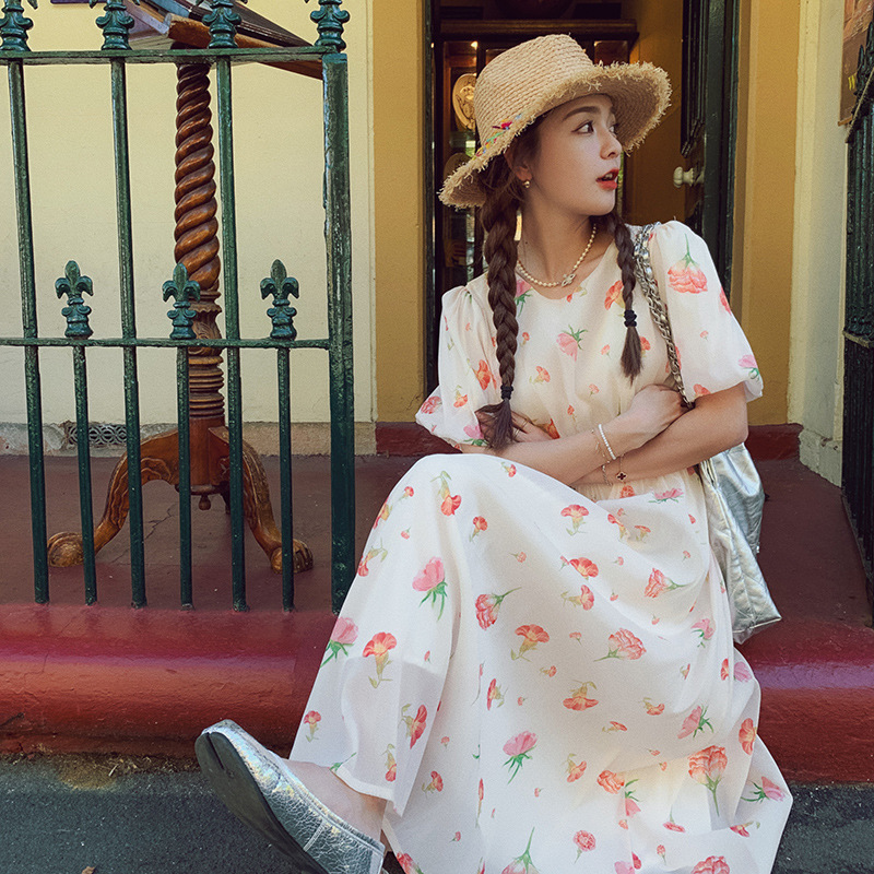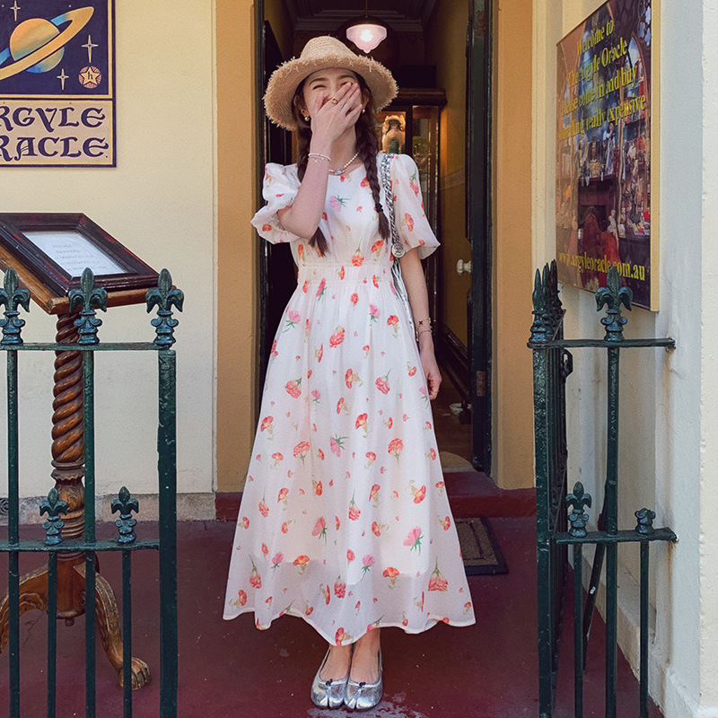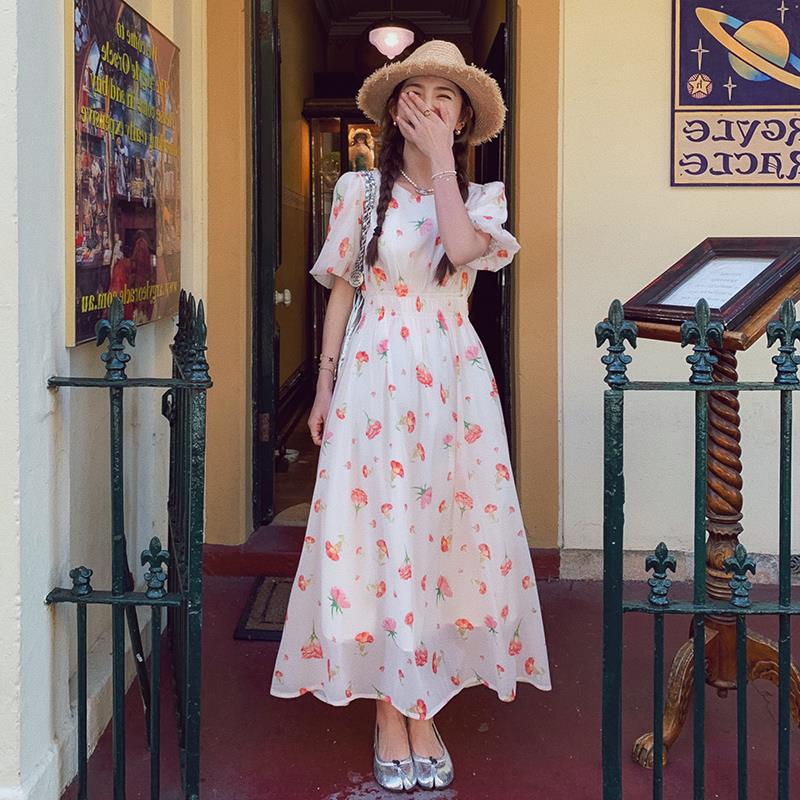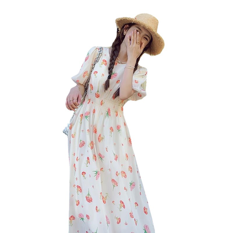 实拍法式茶歇碎花连衣裙女夏季小个子森系超仙收腰显瘦长裙跨境
