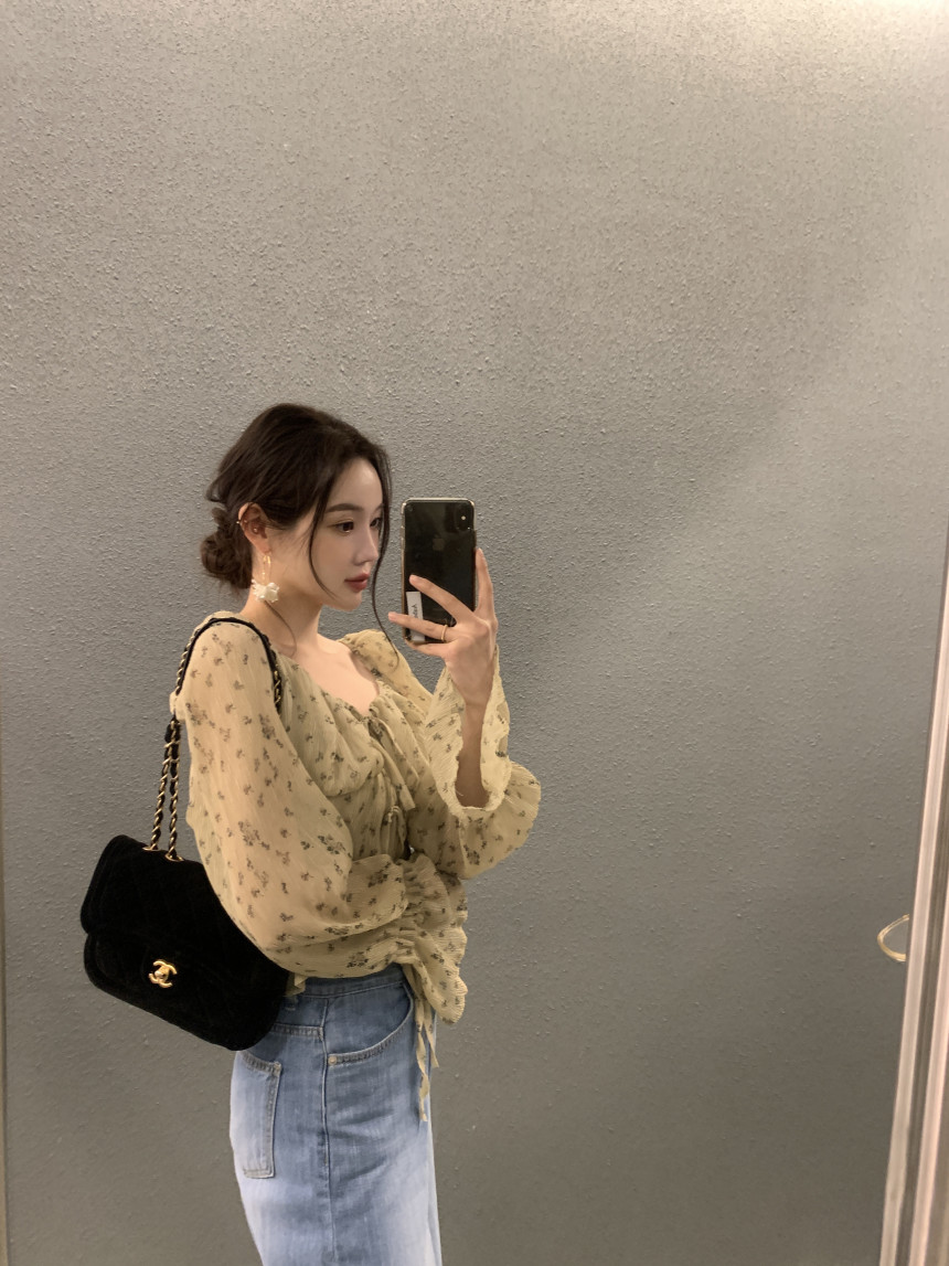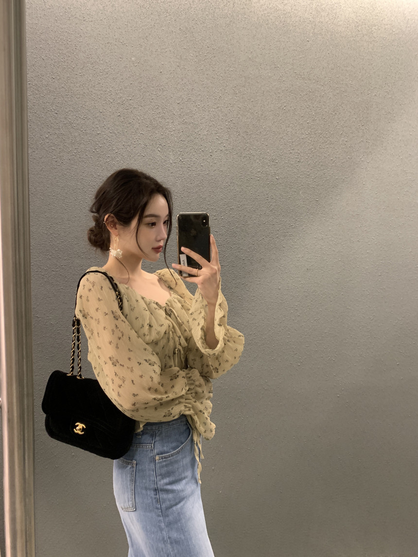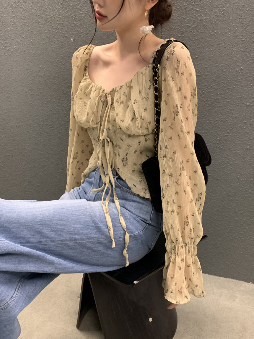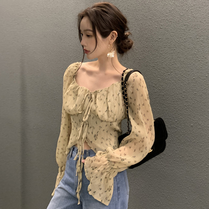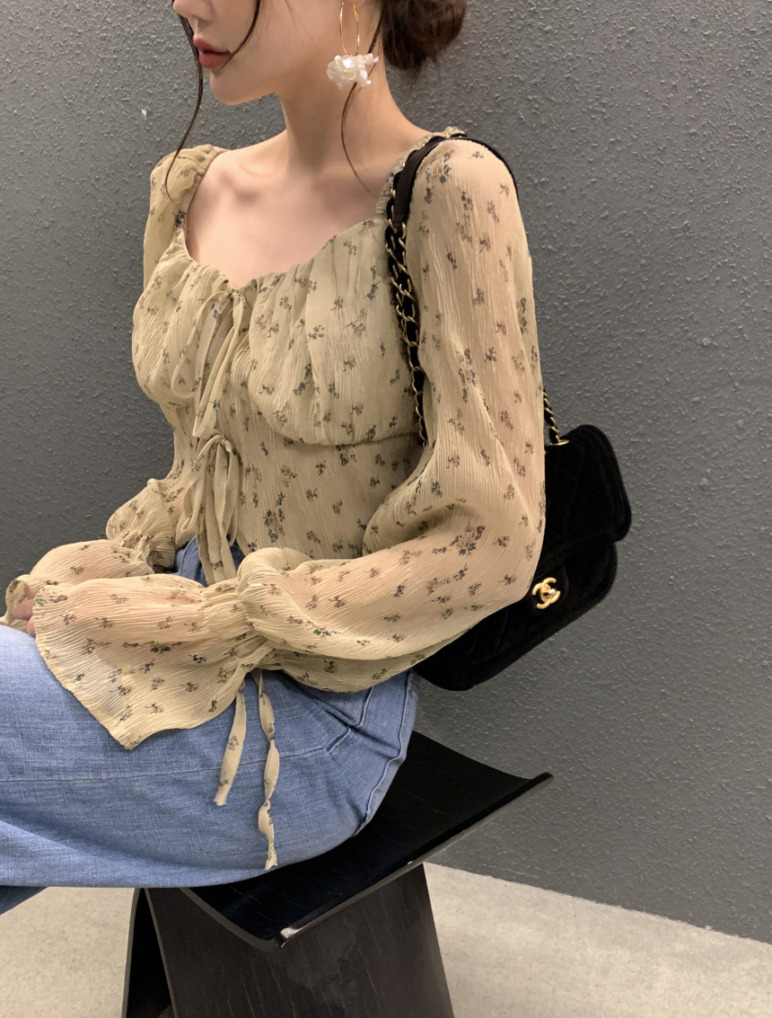 韩国chic法式优雅方领褶皱系带收腰显瘦不规则喇叭袖碎花衬衫女