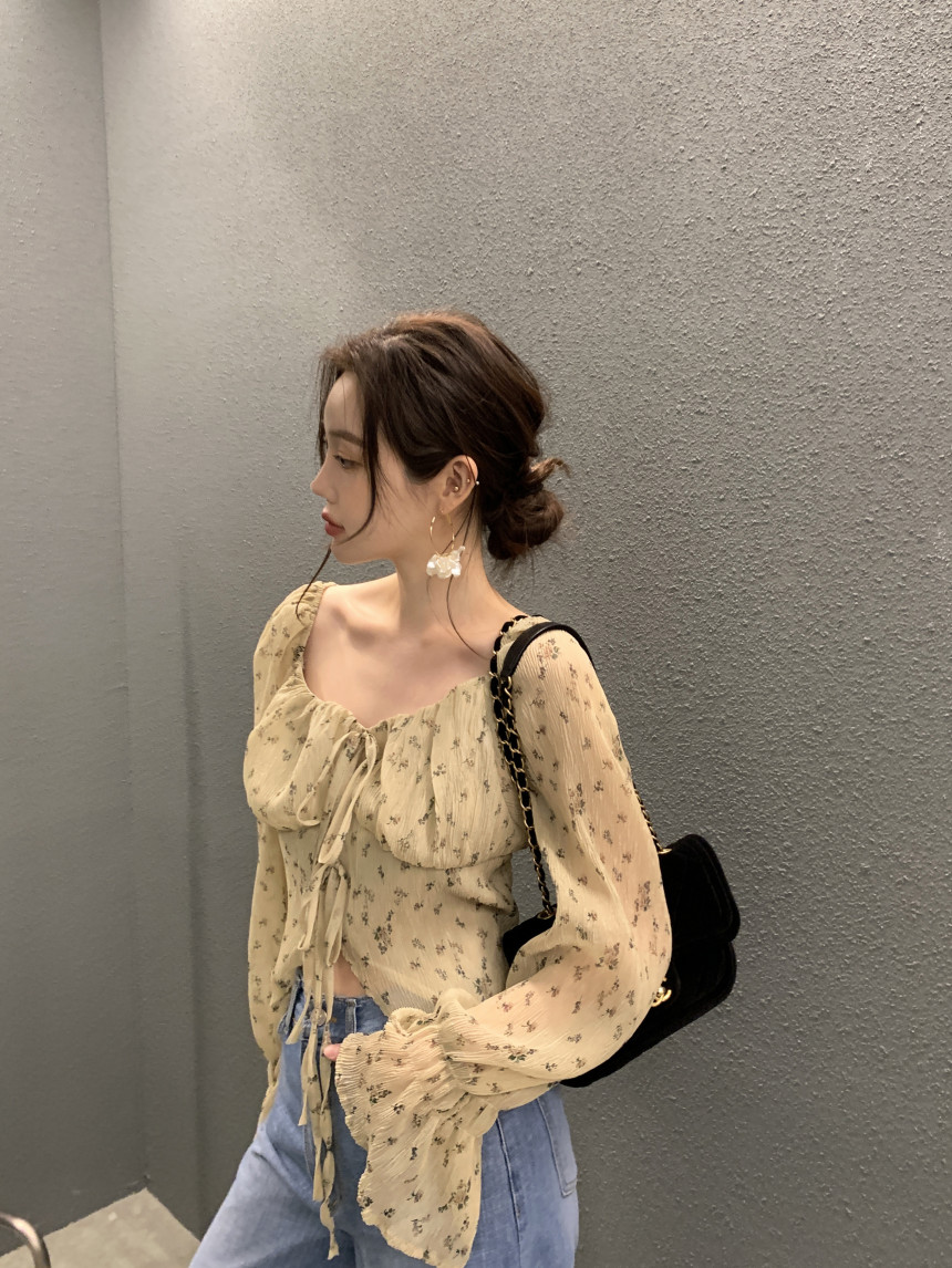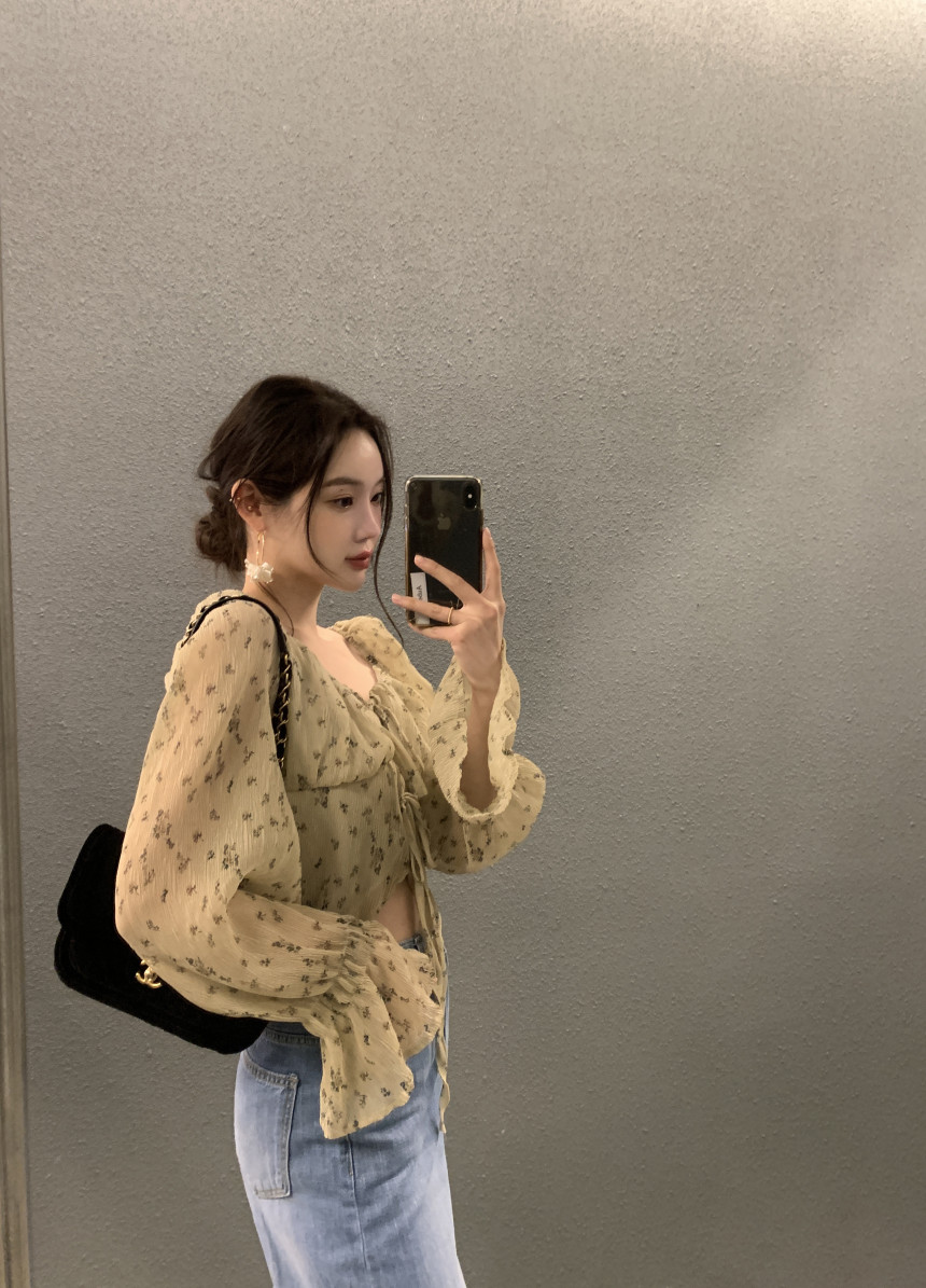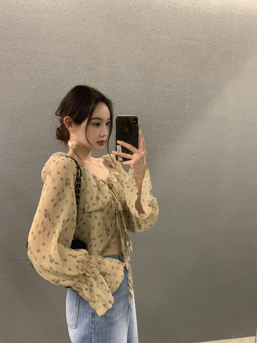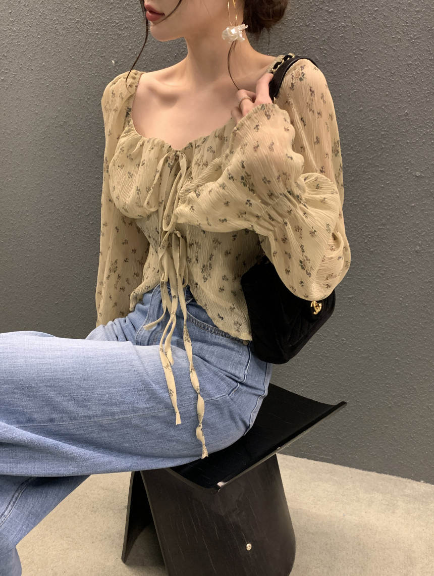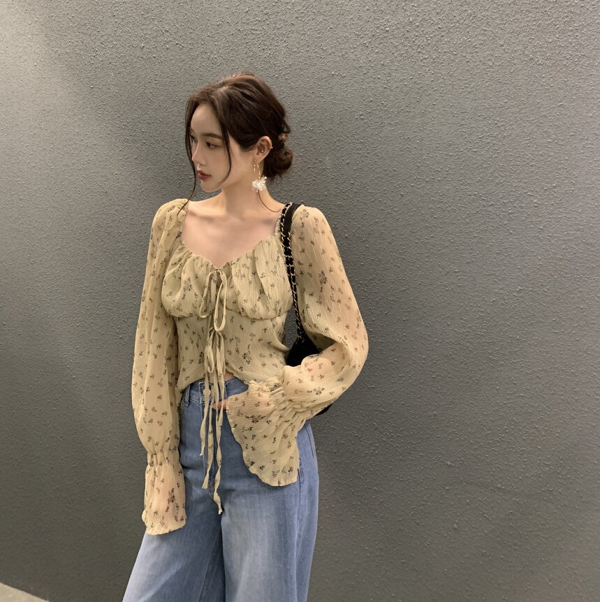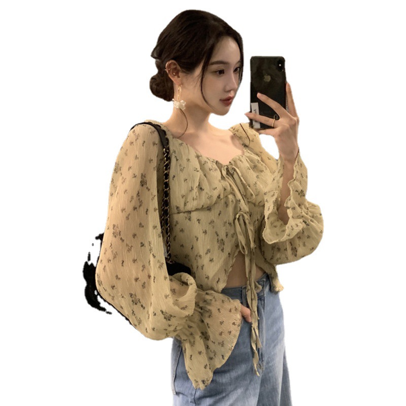 韩国chic法式优雅方领褶皱系带收腰显瘦不规则喇叭袖碎花衬衫女