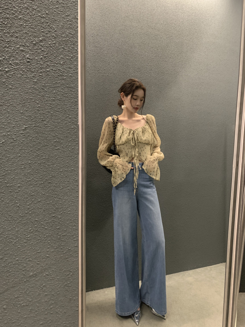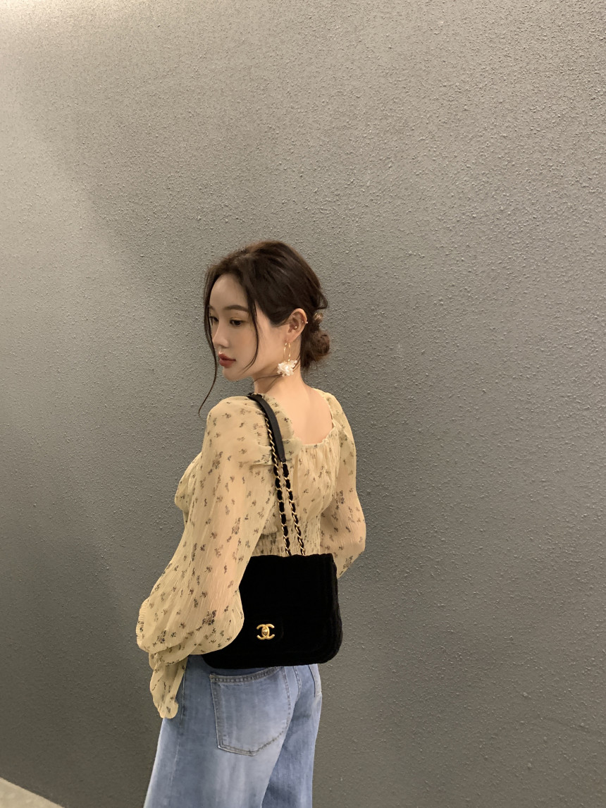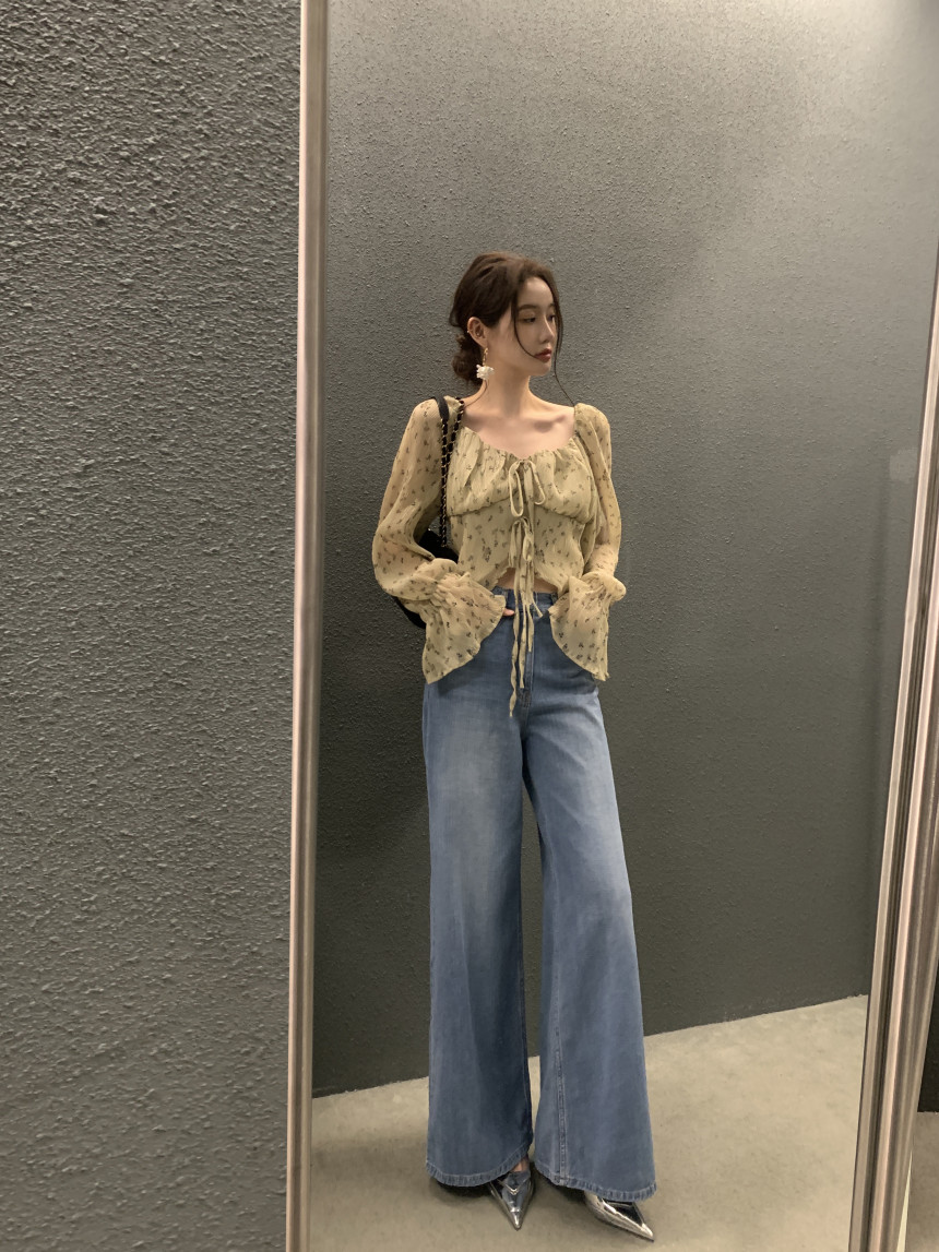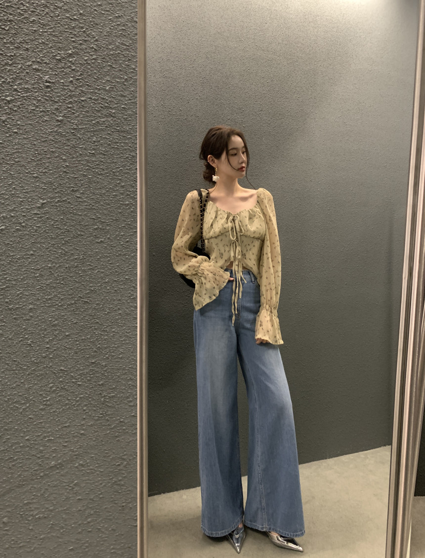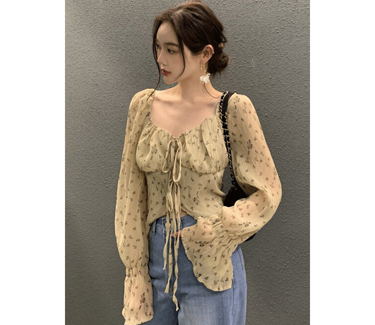 韩国chic法式优雅方领褶皱系带收腰显瘦不规则喇叭袖碎花衬衫女