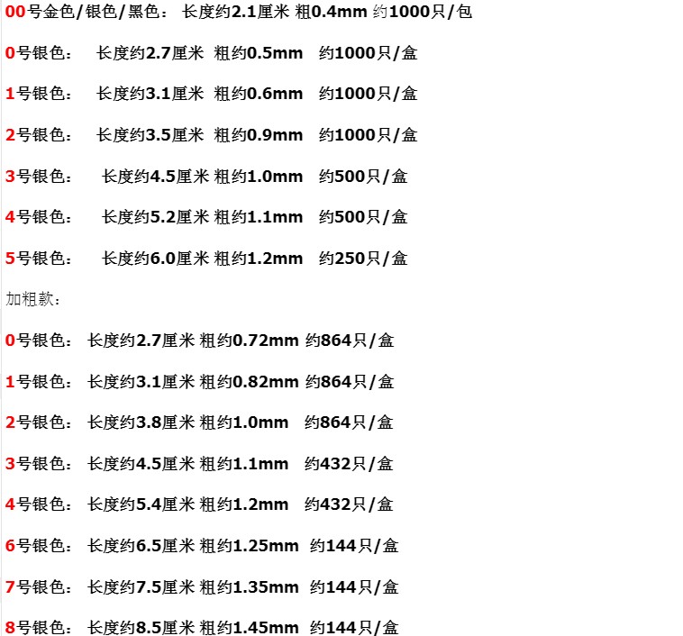 颜色 普通款0 1 2 3 4 各 20个,普通款2号 20个,普通款0号 100个,普通款1号 100个,普通款2号 100个,普通款3号 100个,普通款4号 100个,普通款0号一盒 1000个,普通款1号一盒 1000个,普通款2号一盒 1000个,普通款3号一盒 500个,普通款4号一盒 500个,明黄色 金色普通2号1盒约1000个,柠檬黄 金色普通3号1盒约500个,荧光黄 金色普通4号1盒约500个,00号黑色约1000枚,00号银色约1000枚,00号金色约1000枚,黑色 000号 1000枚,银色 000号 1000枚,金色 000号 1000枚,加粗款0号12枚,加粗款1号12枚,加粗款2号12枚,加粗款3号12枚,加粗款4号12枚,加粗款6号12枚,加粗款7号12枚,加粗款8号12枚