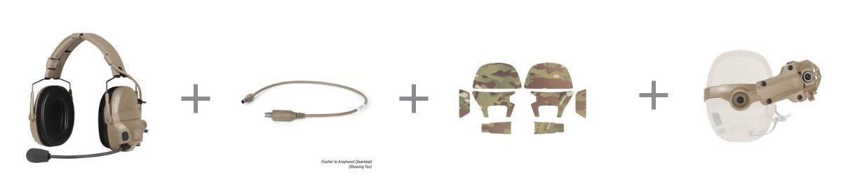 包括 AMP COMMUNICATION HEADSET - CONNECTORIZED 耳机本体+OPS-CORE AMP HEADSET DOWNLEAD CABLE双工连接线(U174接口  (Binaural)  21英寸)+MC迷彩贴纸+AMP HELMET RAIL MOUNT KIT上盔轨套件